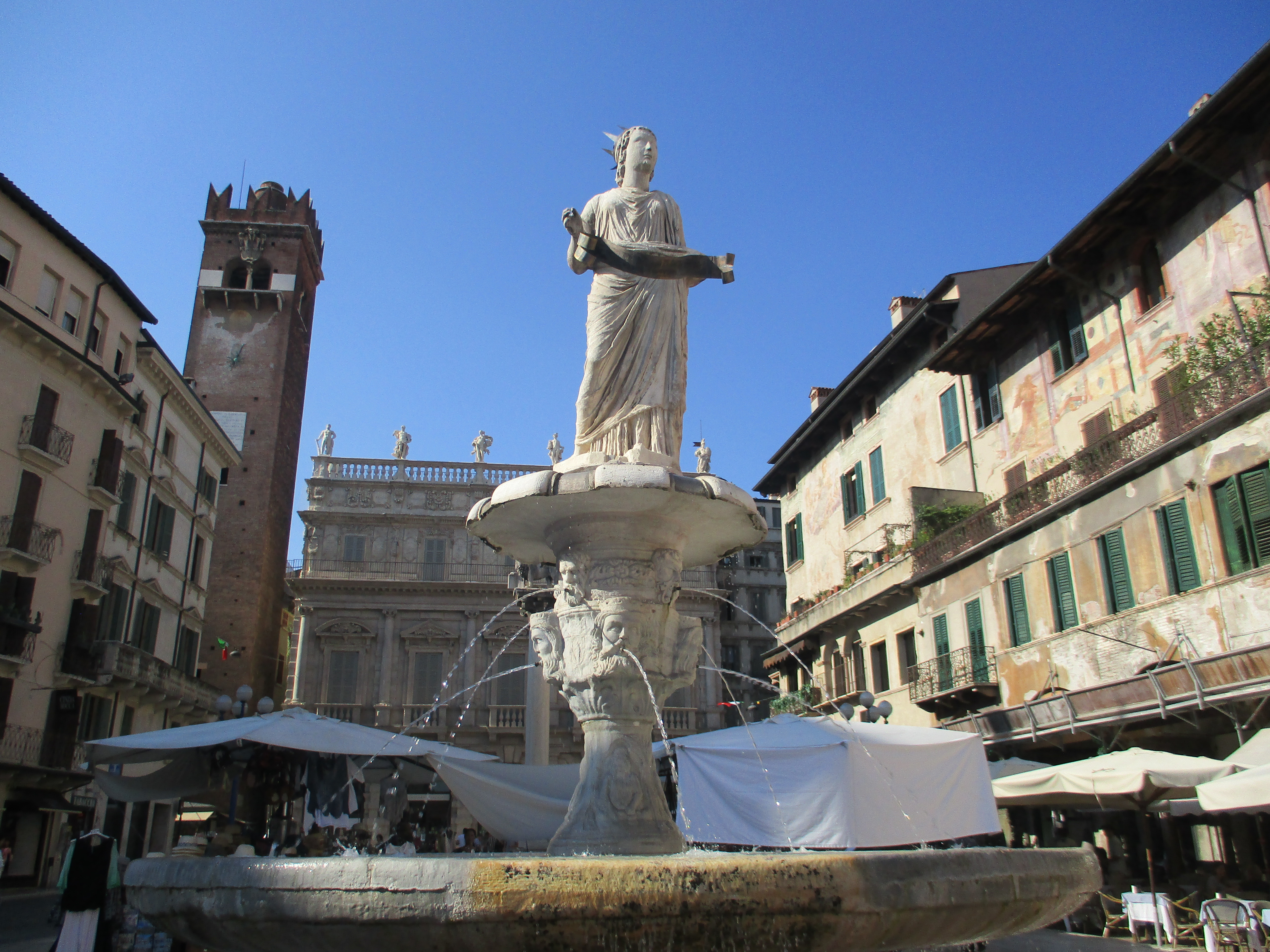 Place principale de Vérone, sur laquelle se tient un marché (assez dédié aux touristes) ainsi que pas mal de petits restaurants sympathiques. Les stands du marché sont assez amusants, car entièrement rétractables, puis déployables : de simples cubes de bois deviennent ainsi des étals avec parasols !