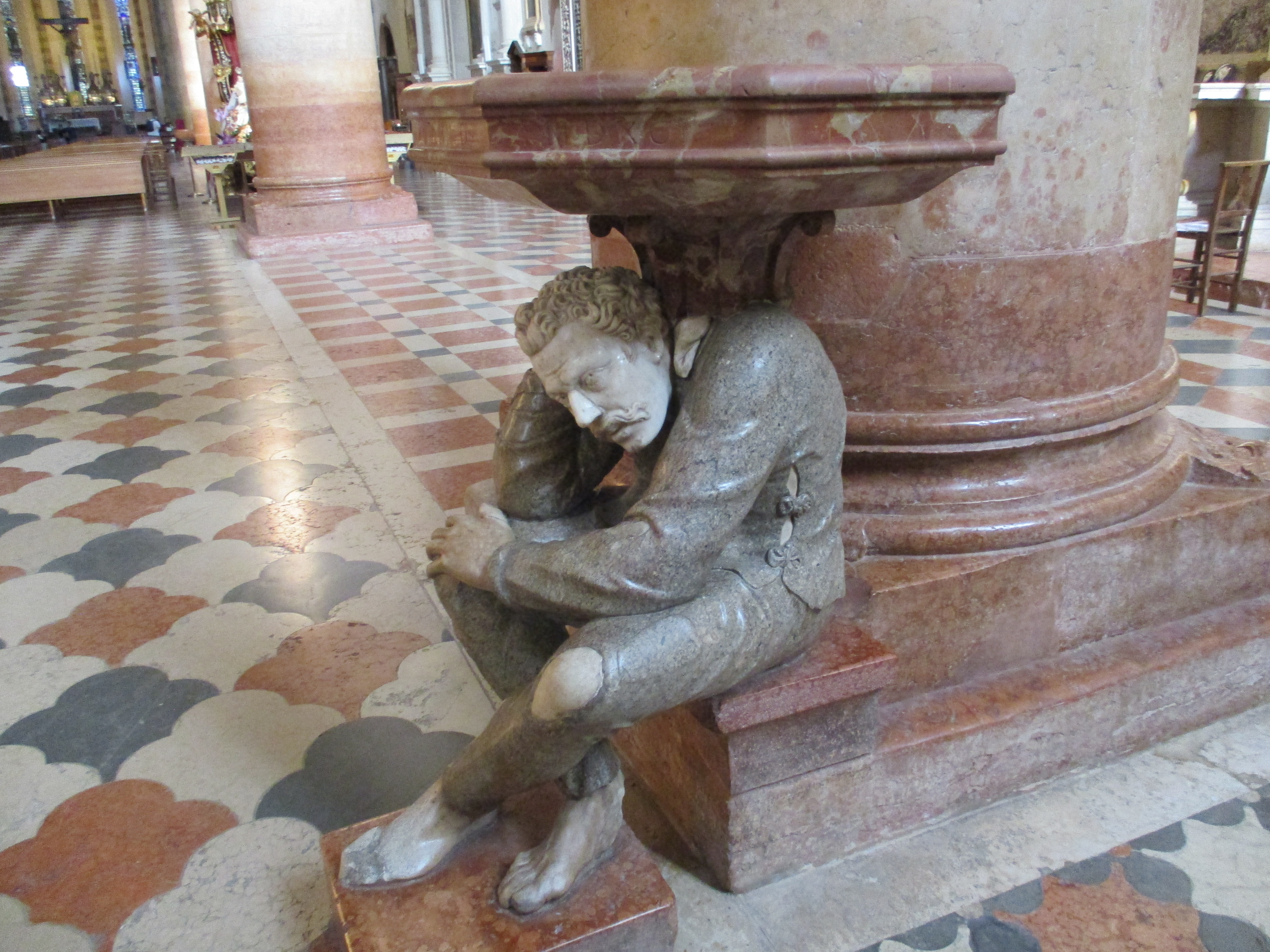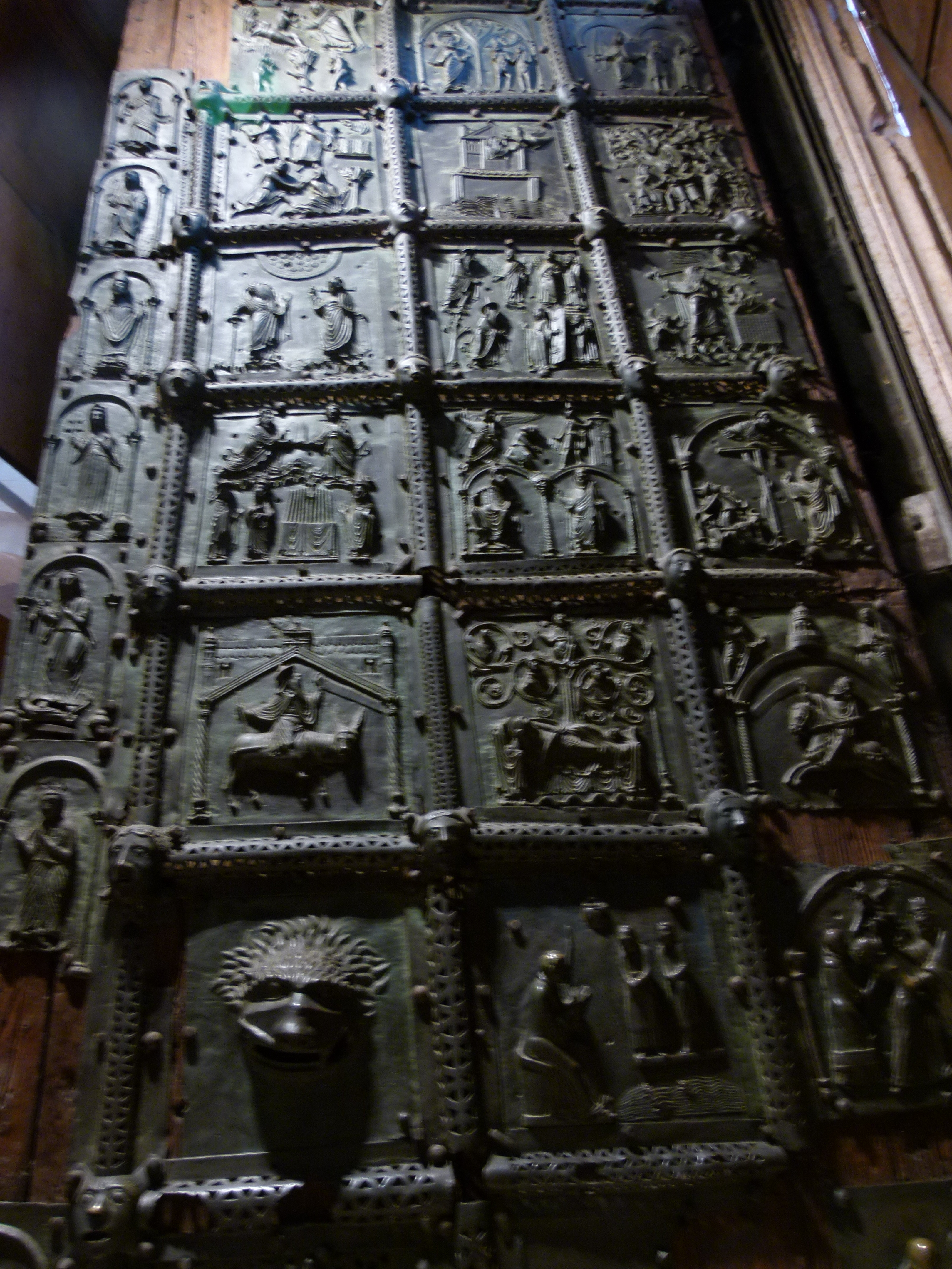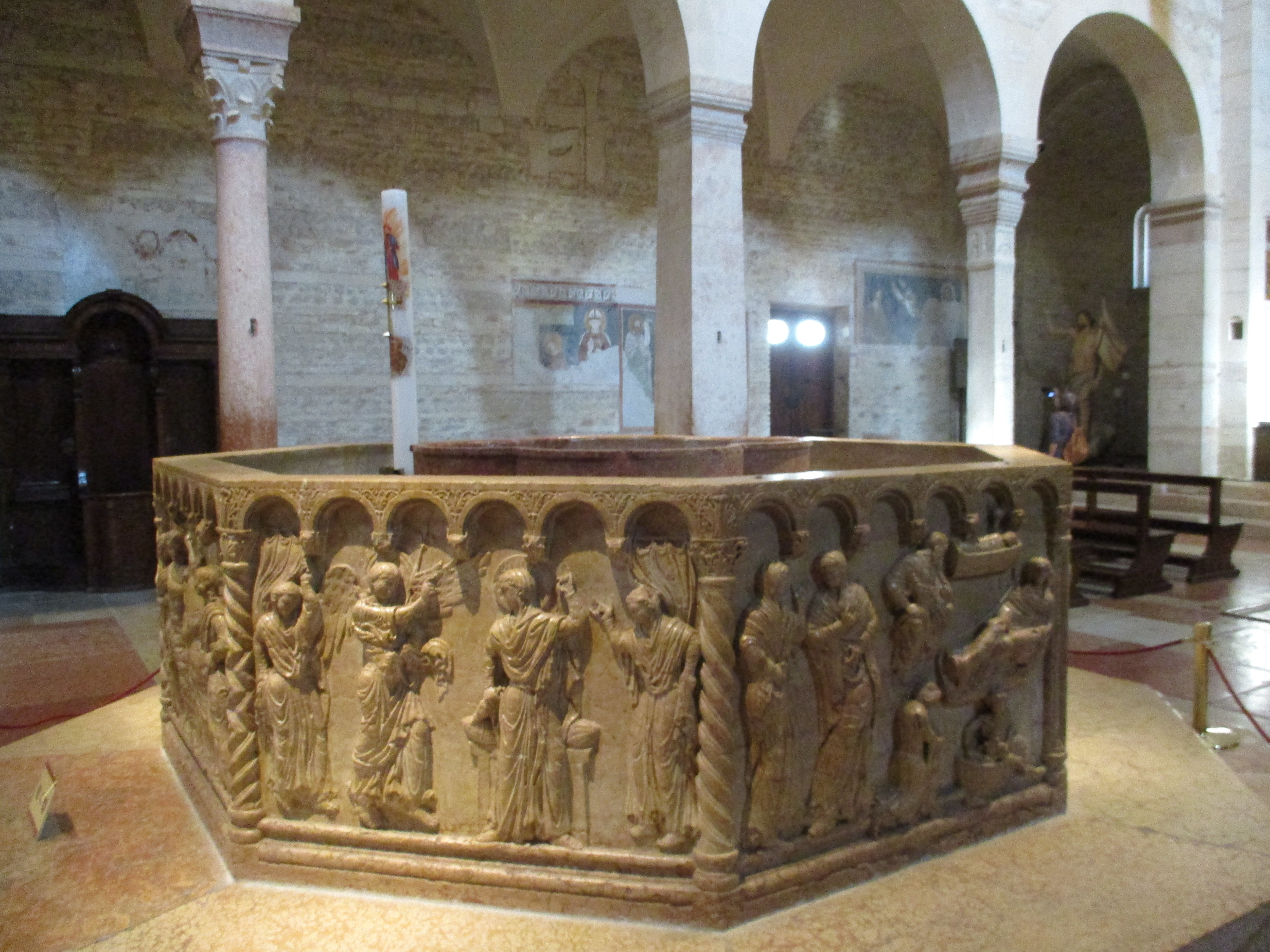 La cathédrale est de loin la plus impressionnante des églises, car elle héberge trois bâtiments en un : l’église Sainte Hélène, du IXème siècle, où l’on peut voir des fouilles archéologiques et la trace de l’église primitive ; le baptistère, reconstruit en 1123, où l’on peut admirer des fonts baptismaux octogonaux taillés dans un seul bloc (on se demande comment ils ont passé la porte !) représentant des scènes bibliques ; et enfin, la cathédrale en elle-même, grandiose. Nous avons dû y rester quasiment 2 h, autant dire que le billet d’entrée est amorti !