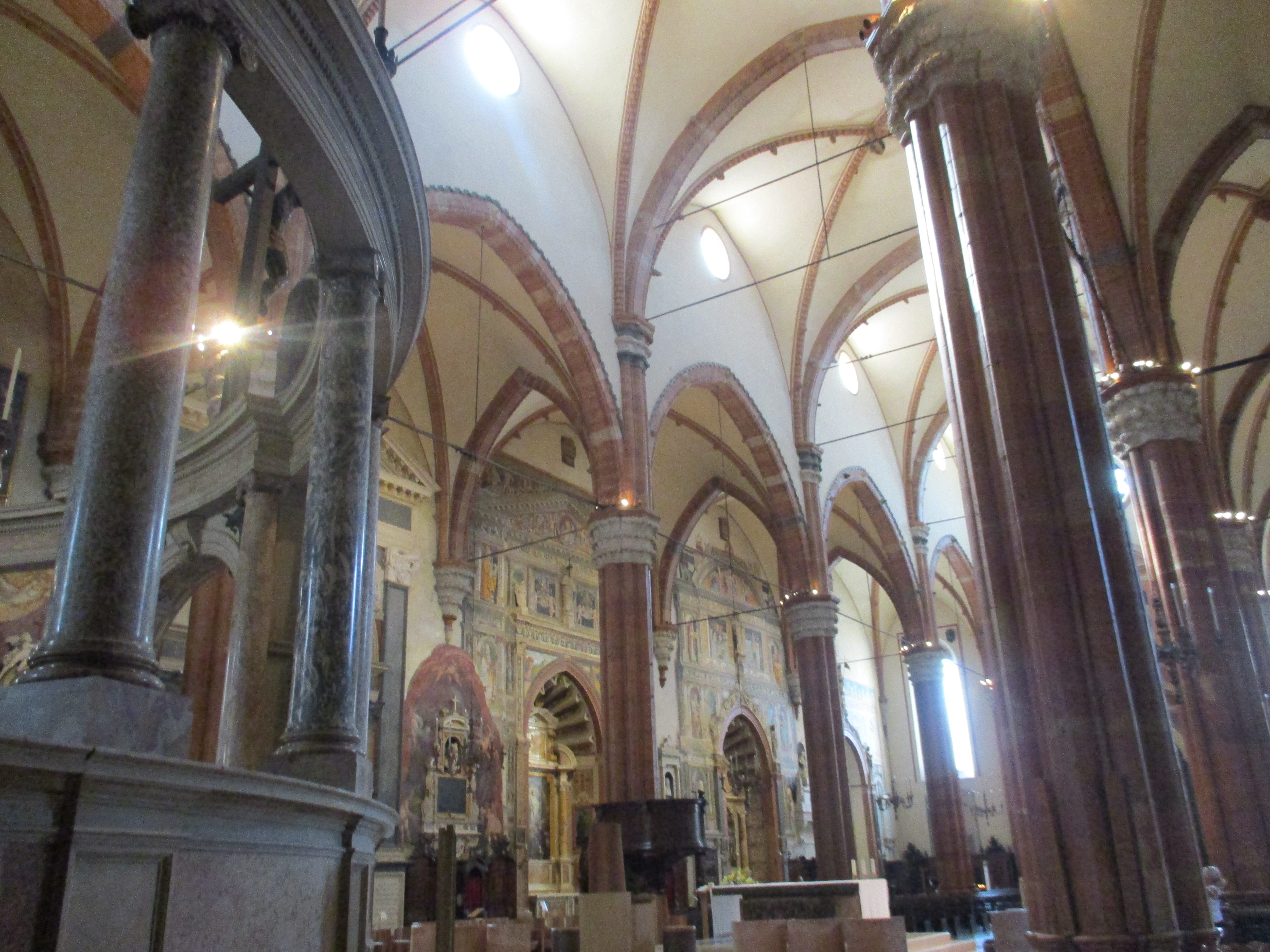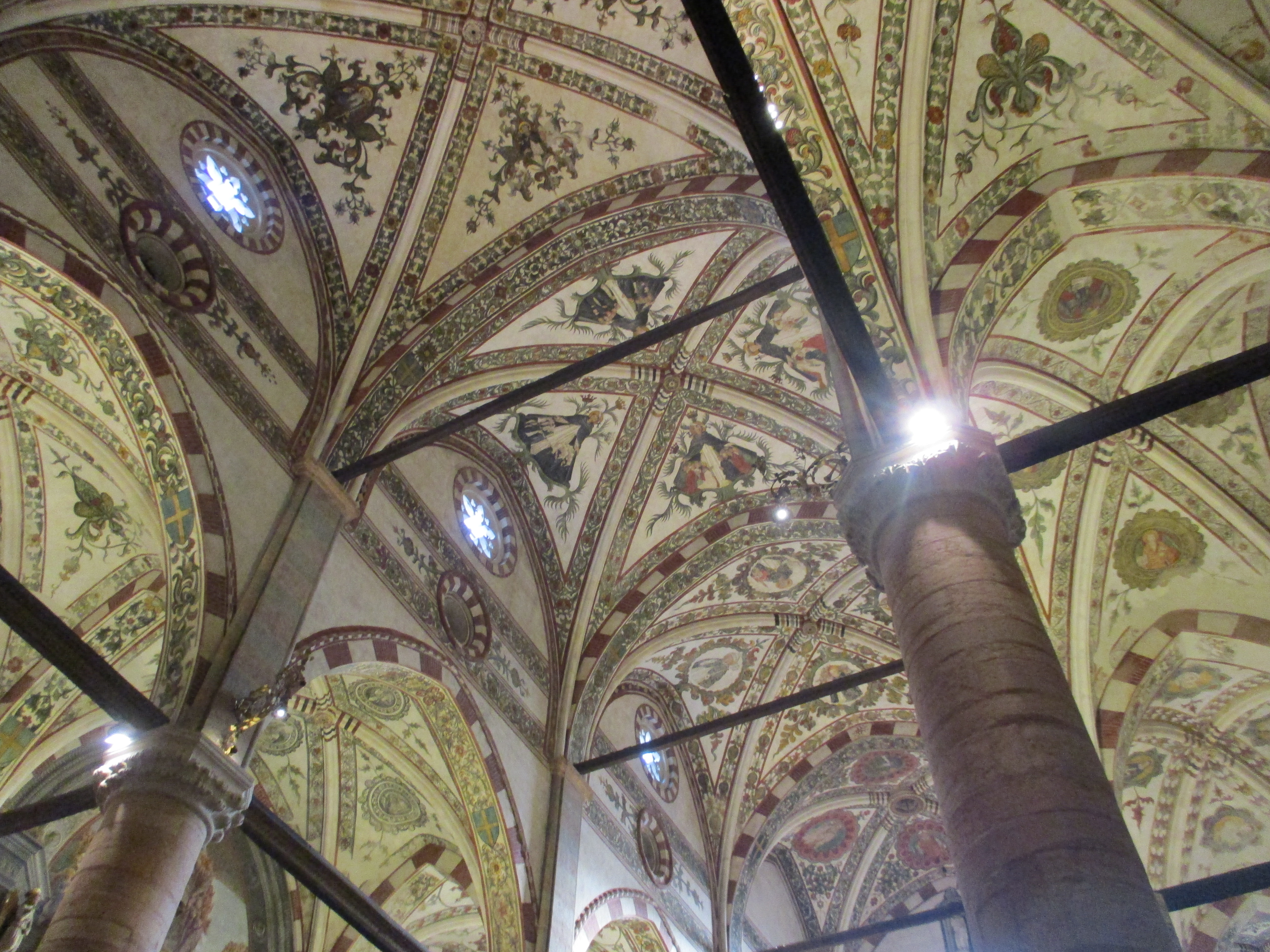 La plus grande église de Vérone, qui est datée approximativement d’entre 1290 et 1481, et accueille des œuvres d’art absolument grandioses, malgré sa façade inachevée. Des plafonds entièrement peints au sol en mosaïques, en passant par des fresques colorées, pas un cm² de cette église n’est dénudé ! Comptez bien 2h pour la visite (nous, en tout cas, c’est le temps qu’on y a passé) et pensez à bien observer chaque détail (les bénitiers de l’entrée sont assez particuliers).