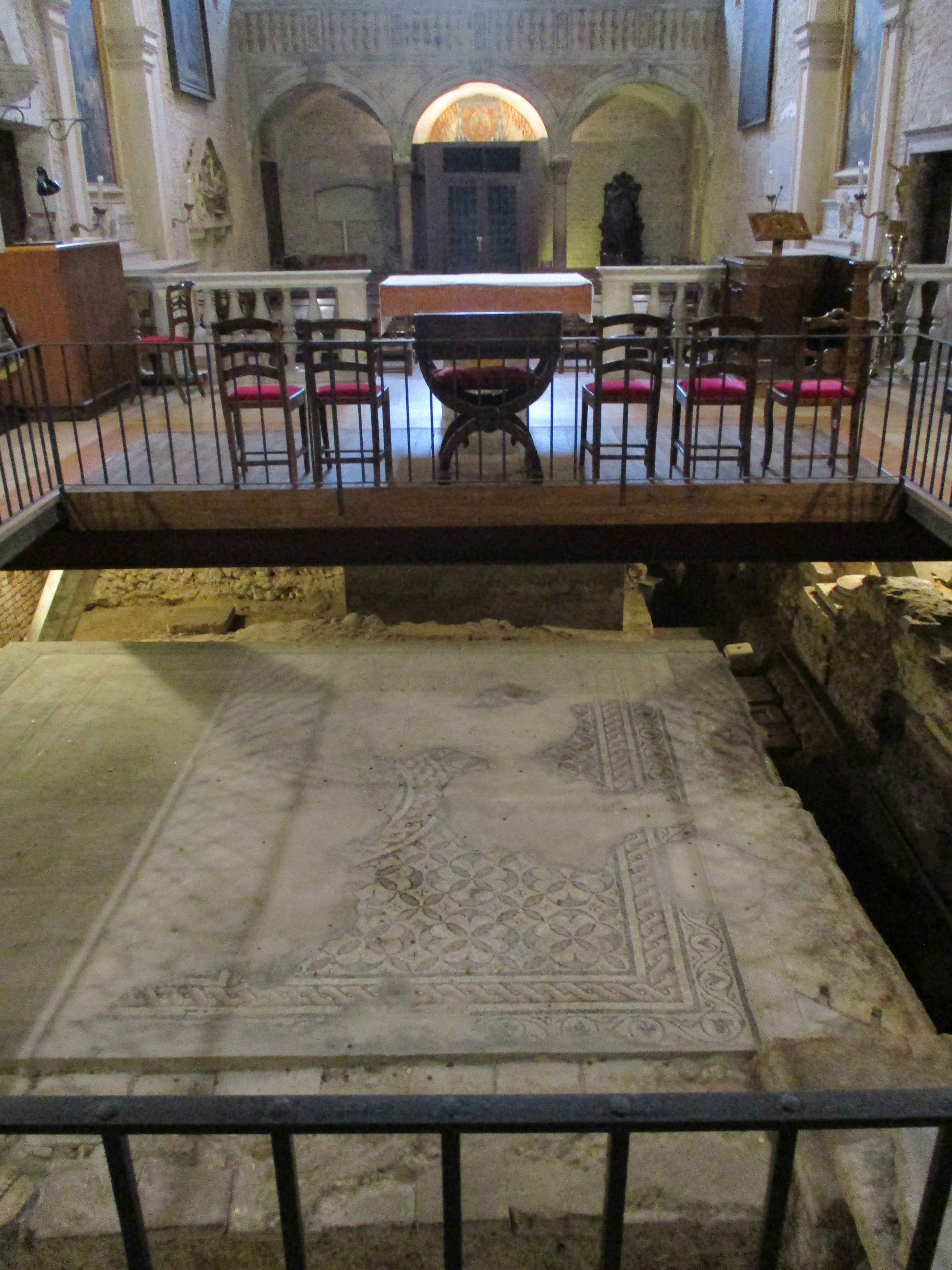 Dédiée aux saints Fermo et Rustico, dont les reliques auraient été placées sous l’autel de l’église paléochrétienne du Vème siècle. Les fondations de ce premier bâtiment sont d’ailleurs encore visibles en sous-sol, et sont vraiment impressionnantes : personnellement, nous n’avons pas l’habitude de pouvoir admirer des fresques médiévales aussi anciennes, surtout sans aucune protection vitrée. Du XIème siècle à 1350 ont eu lieu des travaux destinés à donner à l’église sa forme actuelle, avec campanile, cloître et église supérieure et inférieure.