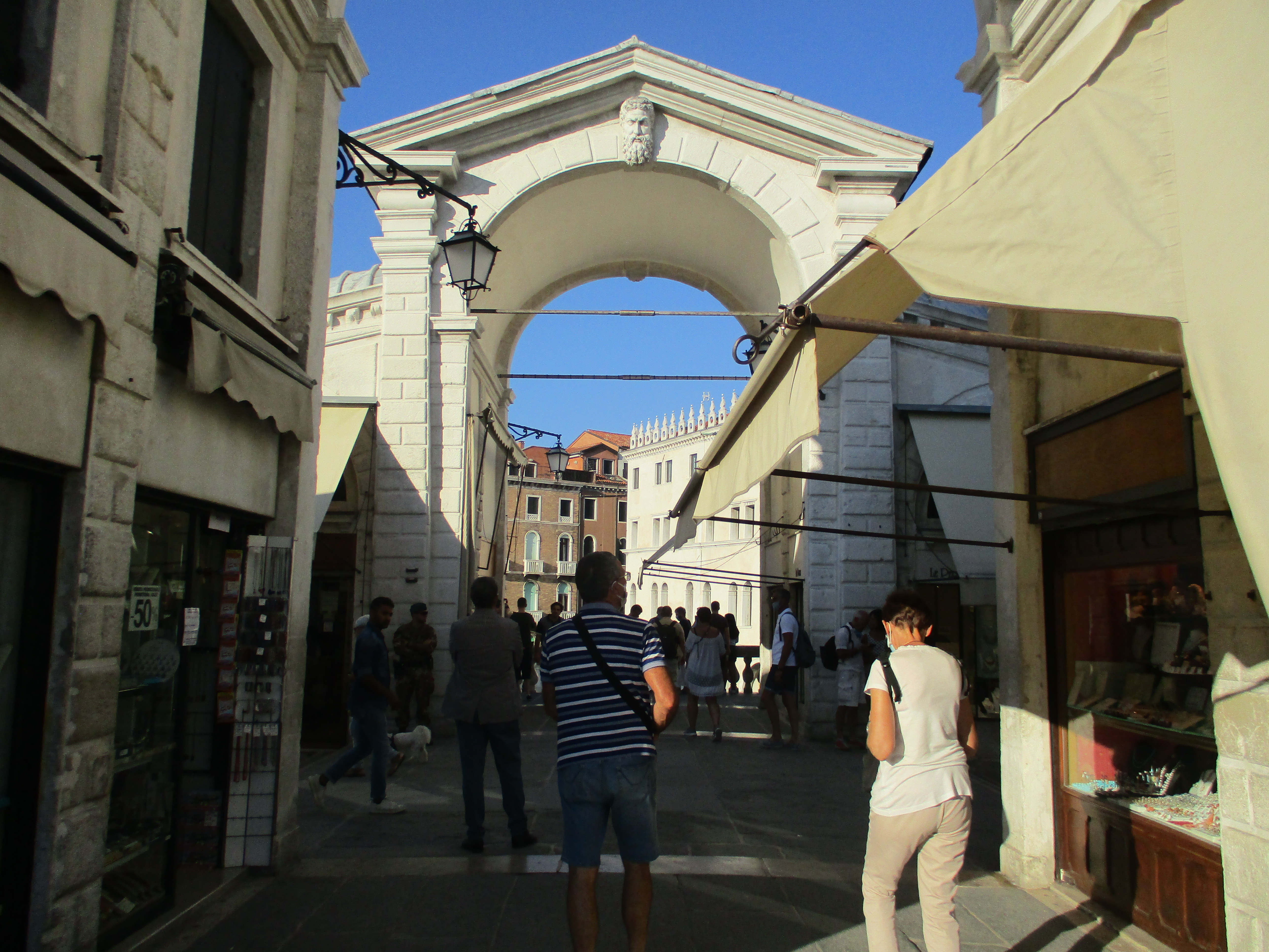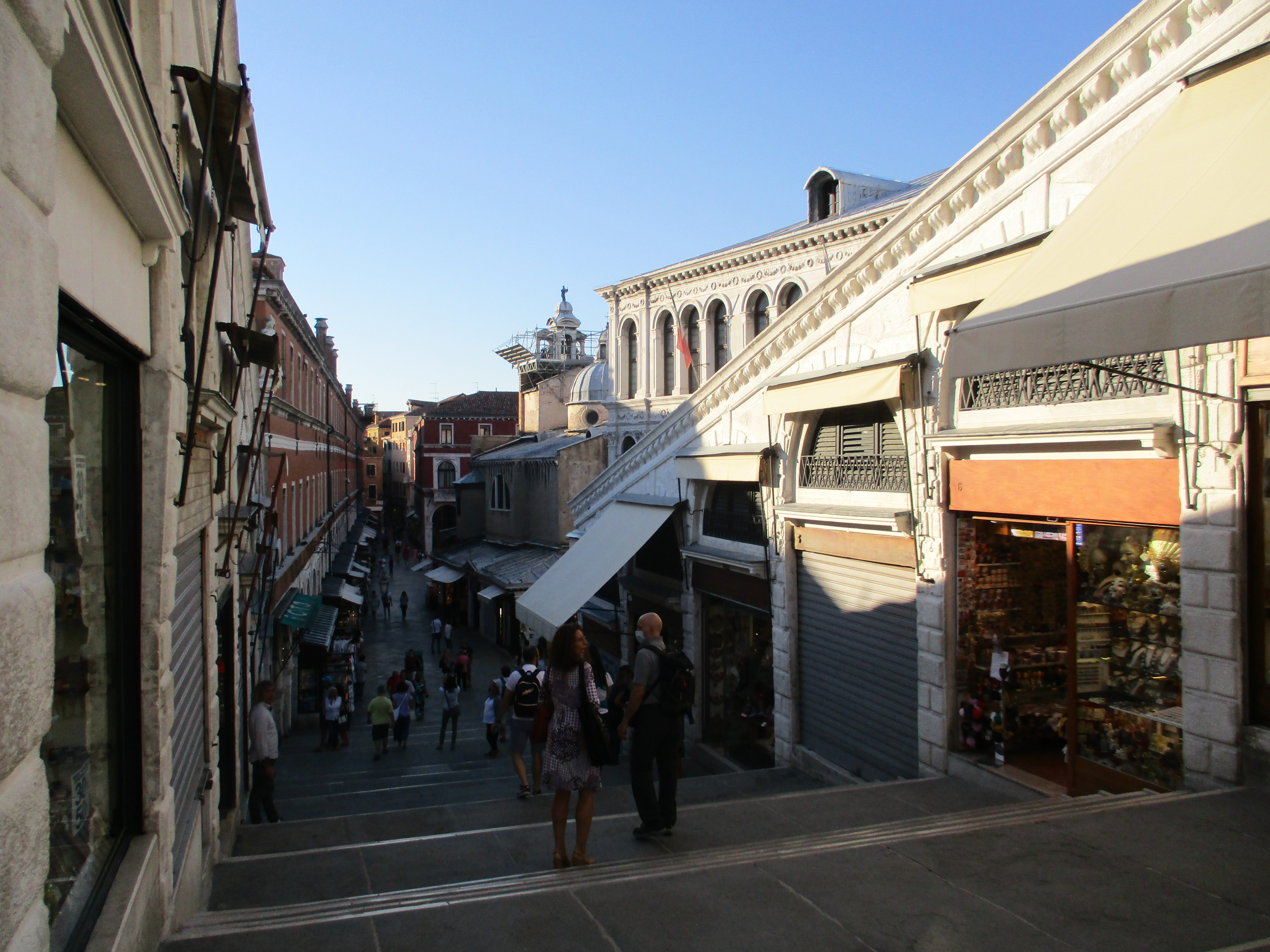 Le pont du Rialto était un objectif de notre promenade… et nous n’avons tout simplement pas réalisé tout de suite que nous l’avions trouvé, et que nous étions dessus ! Car, en effet, quand nous arrivons par l’arrière du pont (et non par la vue « carte postale » du Grand canal »), il s’agit d’une continuité de la rue marchande en escalier. Le fait qu’il y avait un peu plus de monde qu’ailleurs, et beaucoup de selfies, nous a mis la puce à l’oreille…