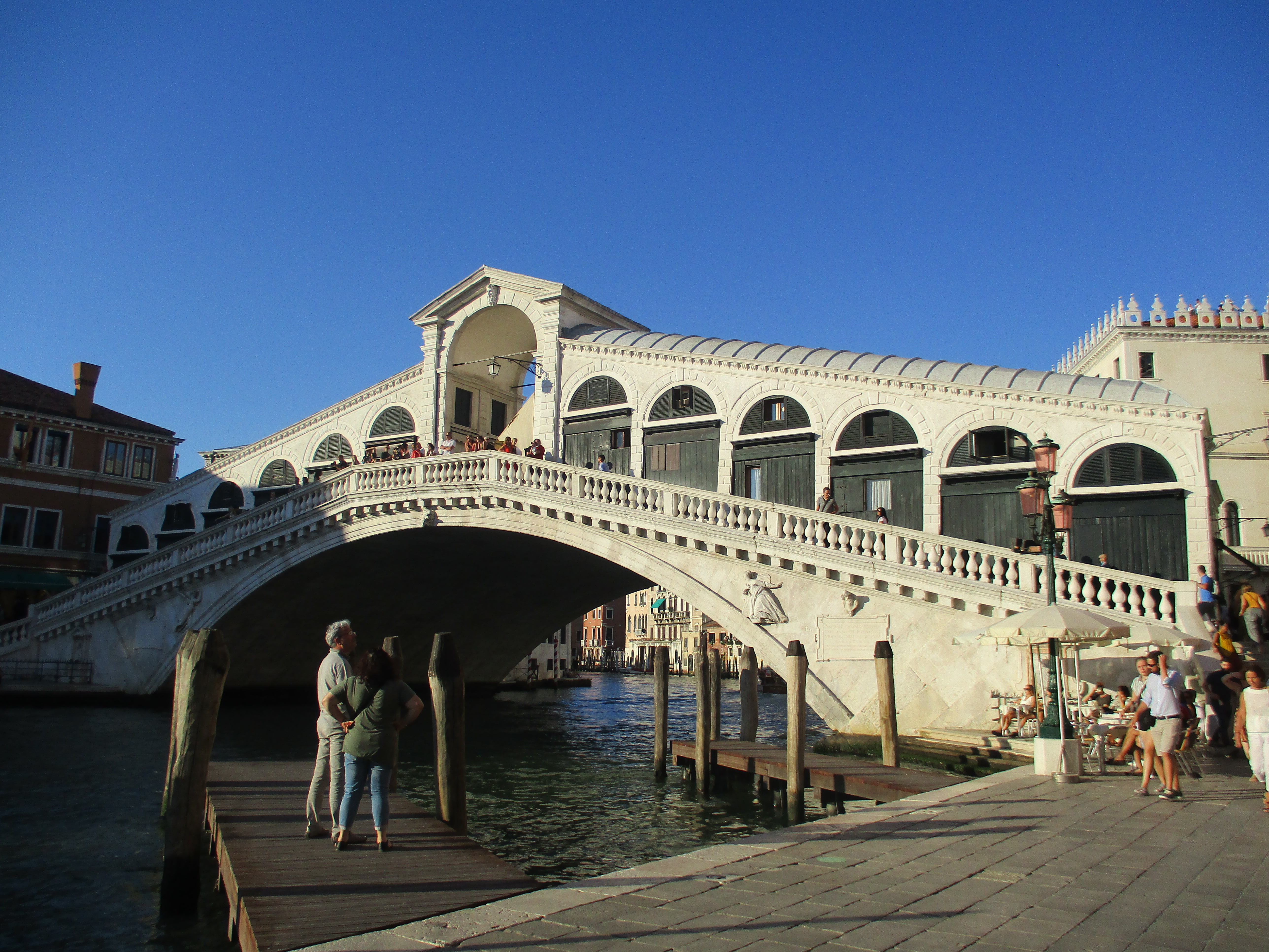 Le pont du Rialto : rénové au XVIème siècle après un écroulement en 1444, il se présente comme une unique grande arche de 48 mètres, surmontée de 12 petites arches de part et d’autre du pont. Bordé de deux rangées de boutiques, c’était en quelque sorte la « banque » de Venise puisque c’est là que les monnaies étrangères étaient changées. Jusqu’au XIXème siècle, c’était le seul pont qui permettait de lier les parties est et ouest de la ville, soit les quartier Sans Polo et San Marco.