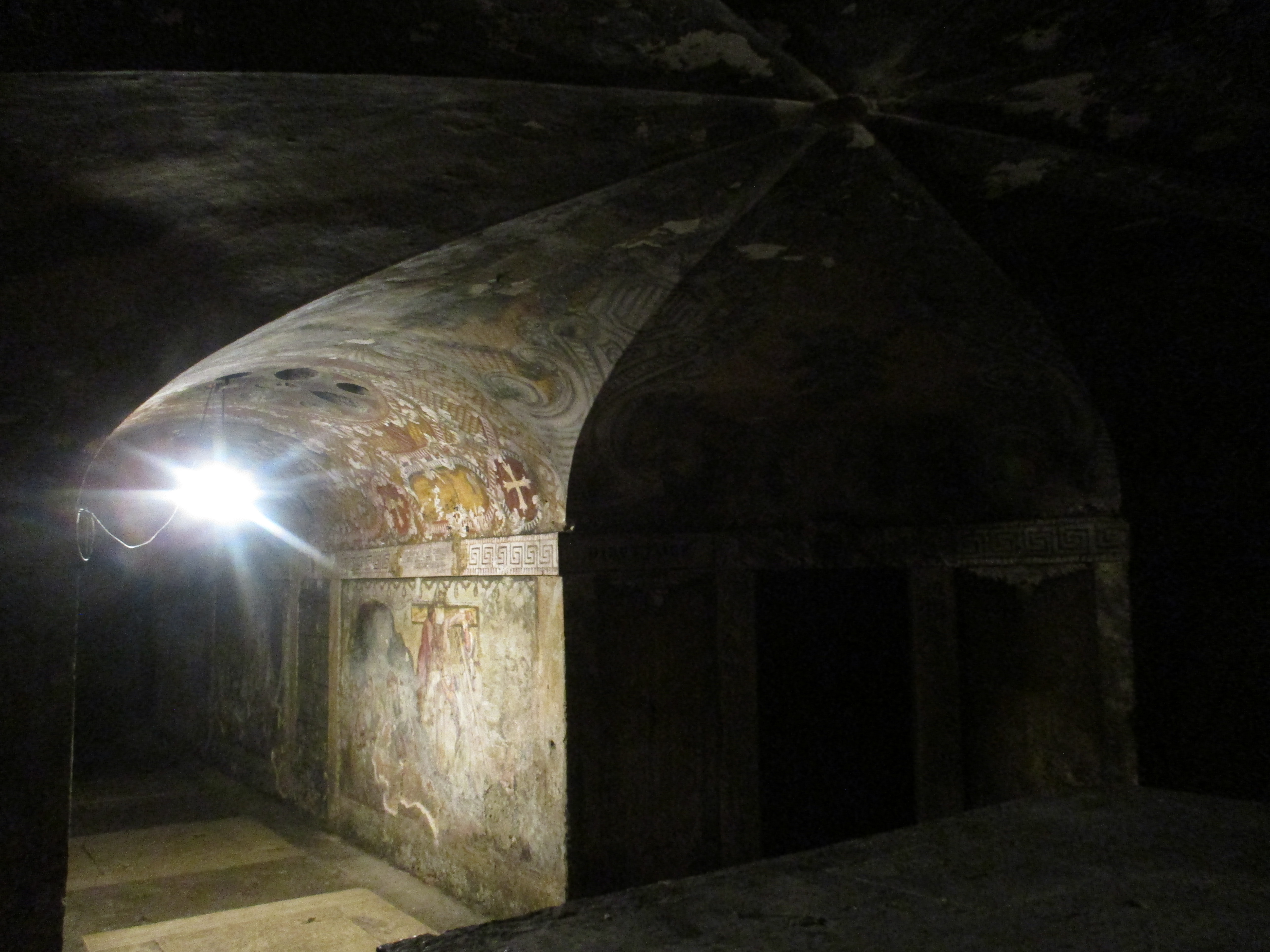 L’église de San Simeone Piccolo : située juste en face de la gare ferroviaire, elle abrite une crypte octogonale de 21 chapelles, entièrement peinte du sol au plafond. Nous ne l’aurions même pas su si le gardien des lieux ne nous avait pas proposé la visite. Cette dernière s’effectue à la bougie : on descend un escalier (en passant à côté des chaises en trop et du porte-manteau !) et on est soudain transportés dans un autre monde…
