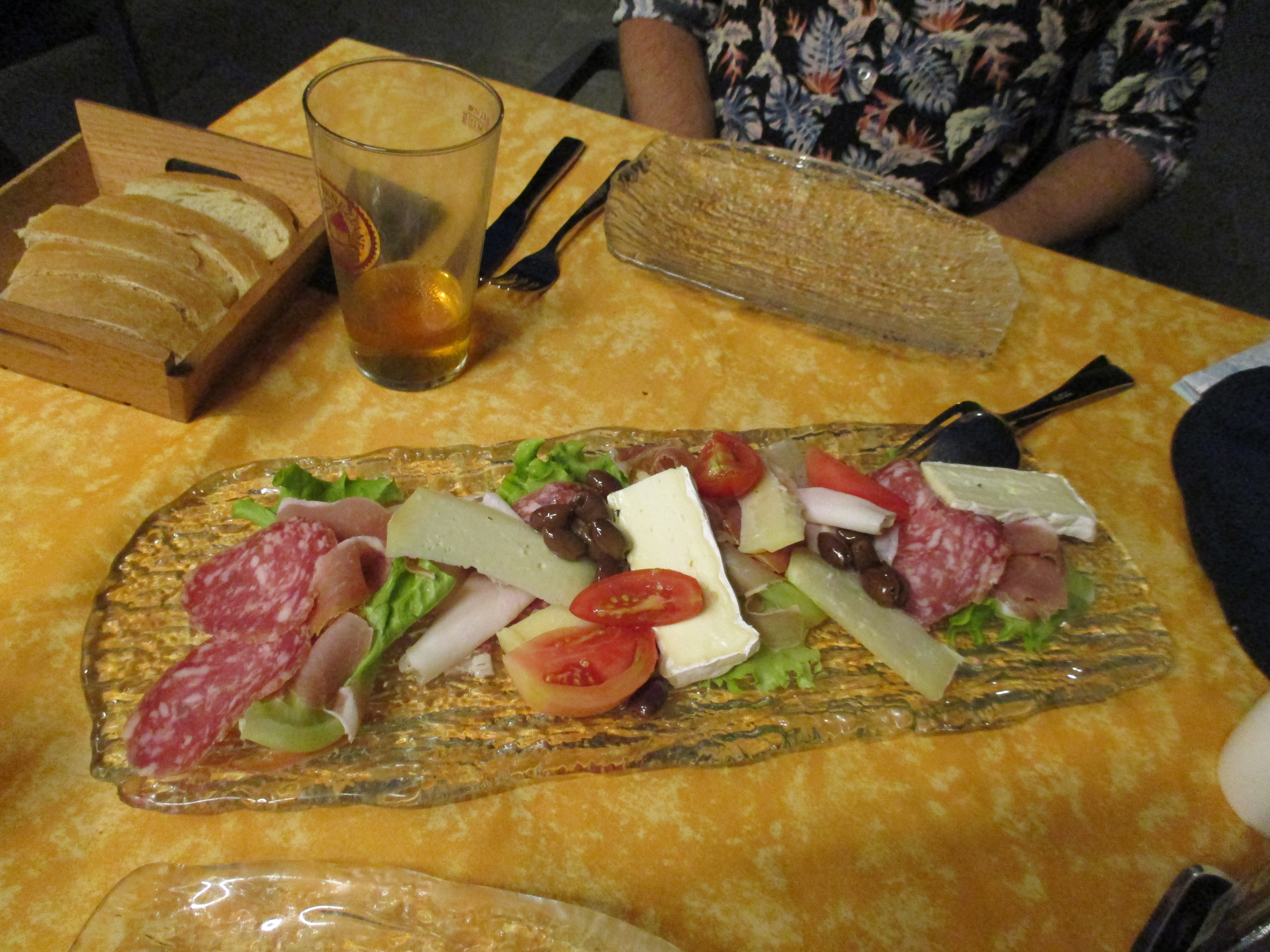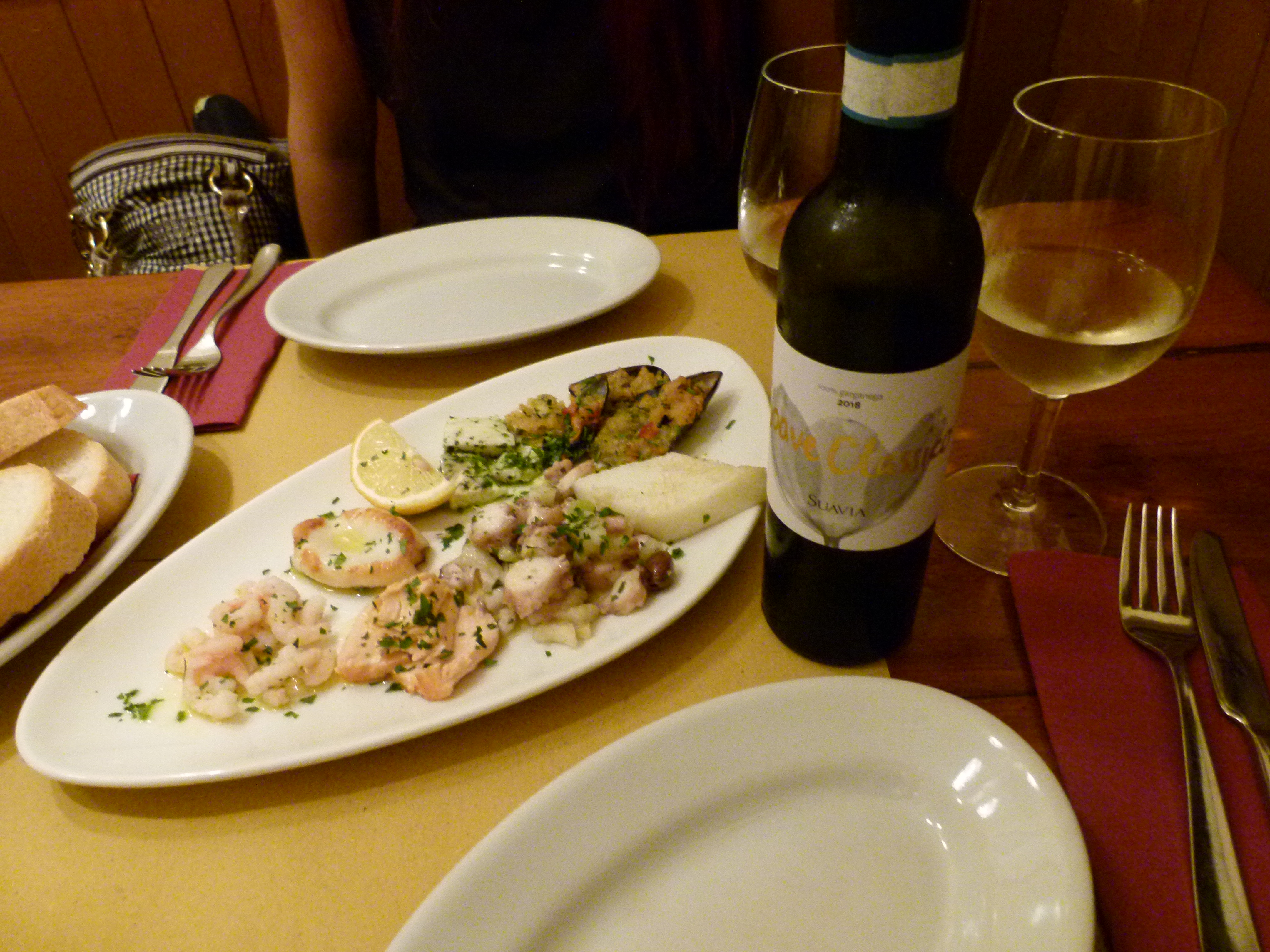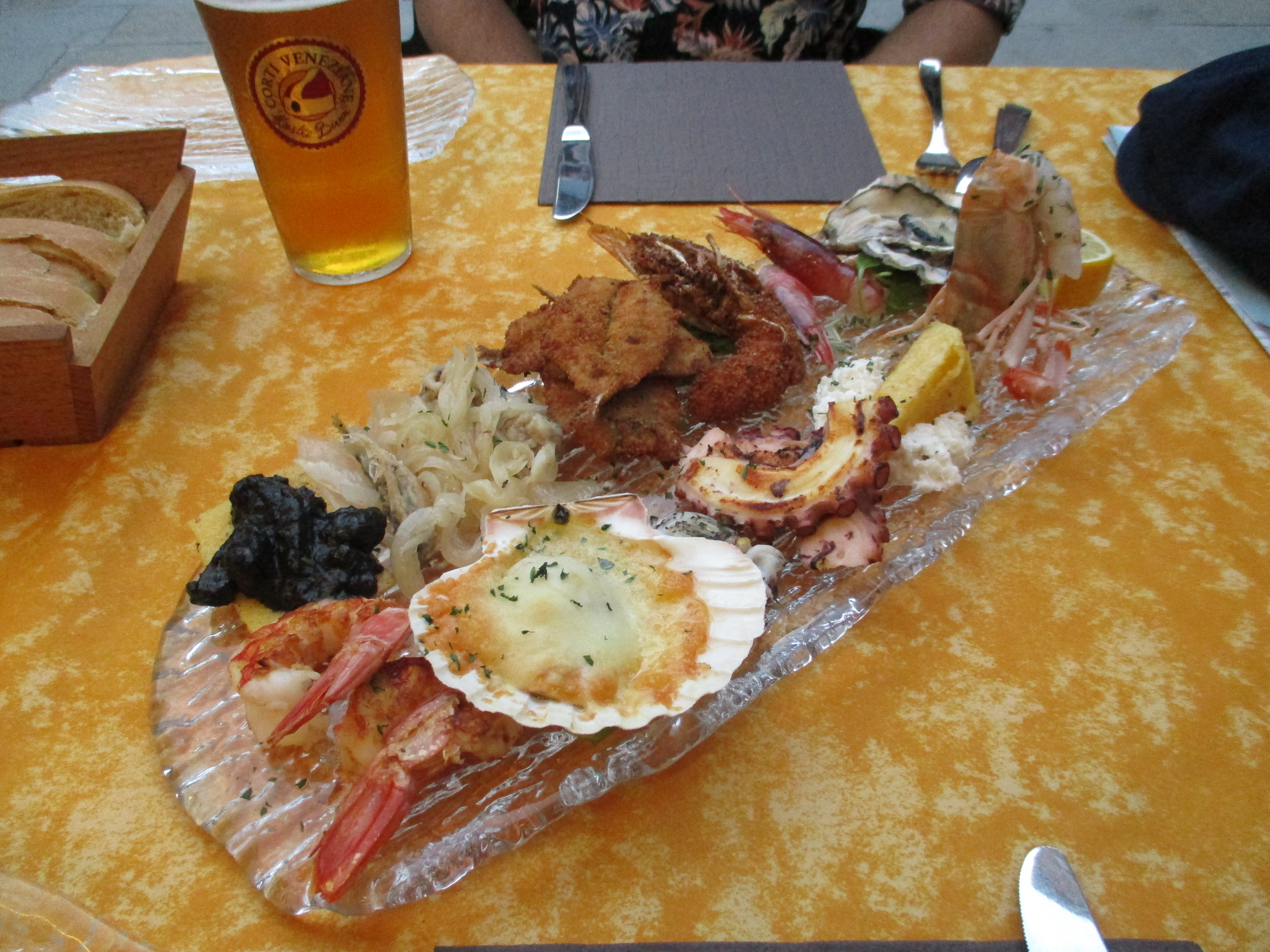 • La Lanterna da Gas, Campiello Mosca 24 : Dans une charmante cour tranquille, à l’écart des rues animées, s’est trouvé un petit restaurant proposant des planchettes de fruits de mer et de charcuterie à partager. Ne sachant faire un choix, nous avons pris les deux ! Si la suggestion de viande et fromage était plus classique, la maritime était surprenante, présentant sur la carte « du cru, du grillé, du bouilli) : coquille Saint Jacques gratinée, poulpe grillé, sèche à l’encre (plat traditionnel), gambas cru… Le tout agrémenté d’une bière vénitienne, naturellement.