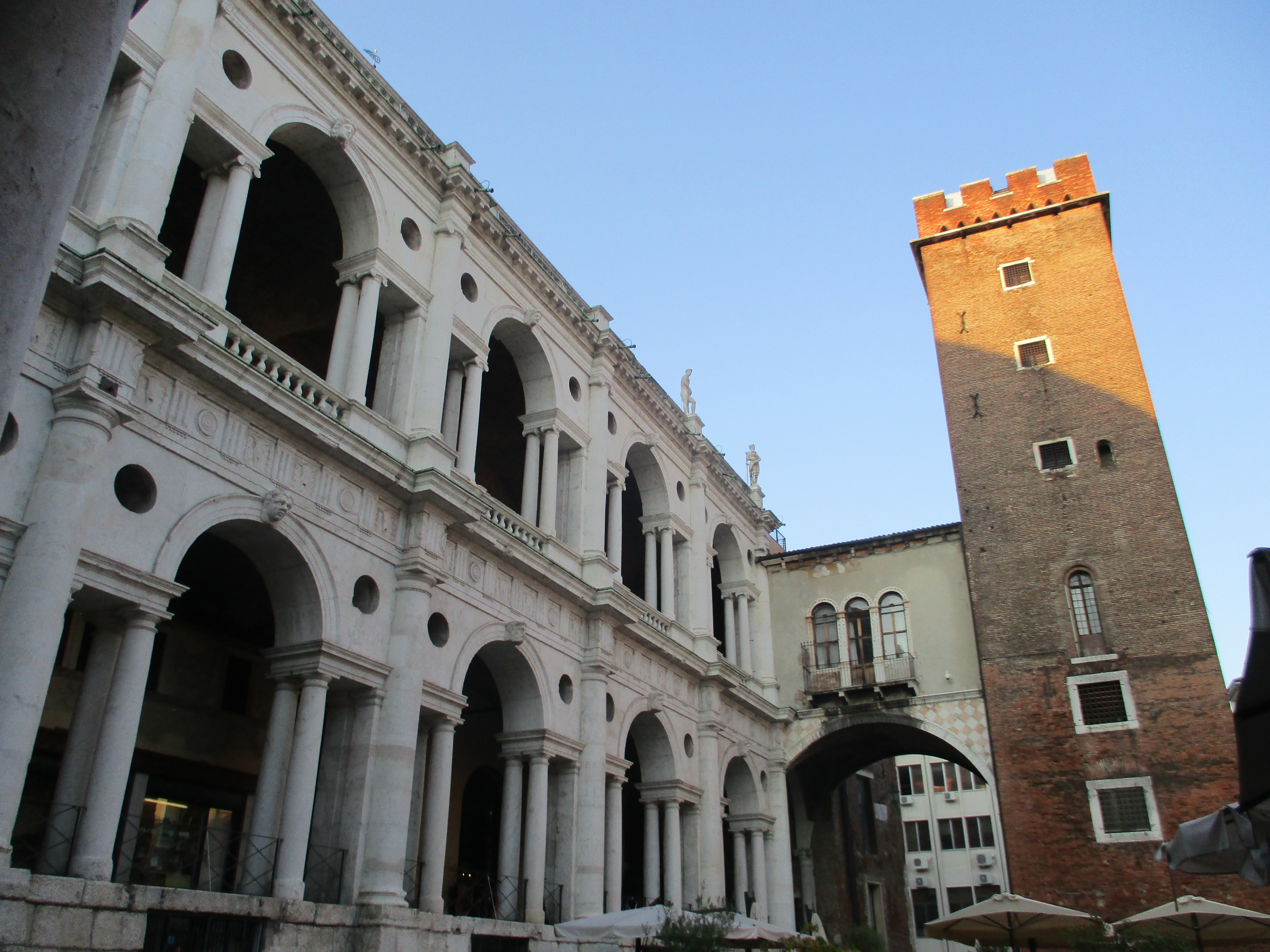 La basilique palladienne est un des bâtiments remarquables de la cité : elle est en réalité une extension du Palais de Région existant depuis le XVème siècle. Ce dernier, jamais terminé du fait de problèmes au niveau de la structure du sol, était déjà dégradé au siècle suivant. La ville a donc lancé un concours d’architecte, dans le but de reprendre les travaux. Palladio est retenu, restaure et améliore l’édifice, et le nomme lui-même « basilique » ! Autrefois siège de l’administration communale, tribunal et centre économique, ce bâtiment accueille aujourd’hui trois espaces culturels : nous ne les avons pas visités, priorisant toujours la déambulation lors des voyages courts.