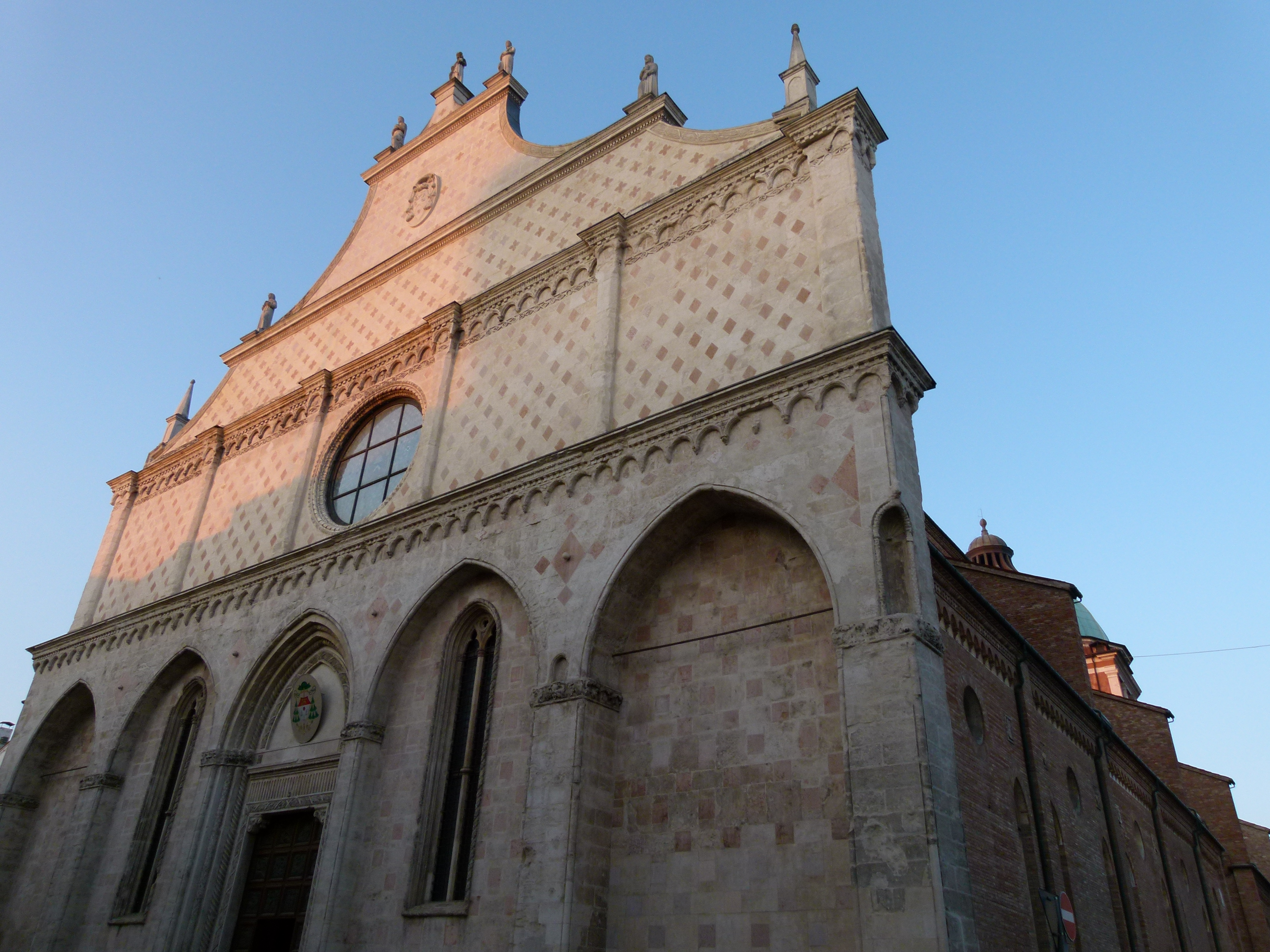 Le Duomo, ou cathédrale Sainte Marie de l’Annonciation : église romane dont la construction débute en 1482, dont seule la façade et le campanile ont survécu aux bombardements de la Seconde Guerre mondiale… Reconstruite, elle accueille néanmoins des œuvres très anciennes : retable de 1535, un autre de 1448, un polyptique de 1366… A voir, donc… quand elle est ouverte, car nous avons été malheureusement assez maudits de ce côté-là durant notre très court séjour de fin de semaine (sachant que la seule fois où nous l’avions trouvée ouverte, c’était pour la célébration de l’office) … ce sera pour un prochain voyage !