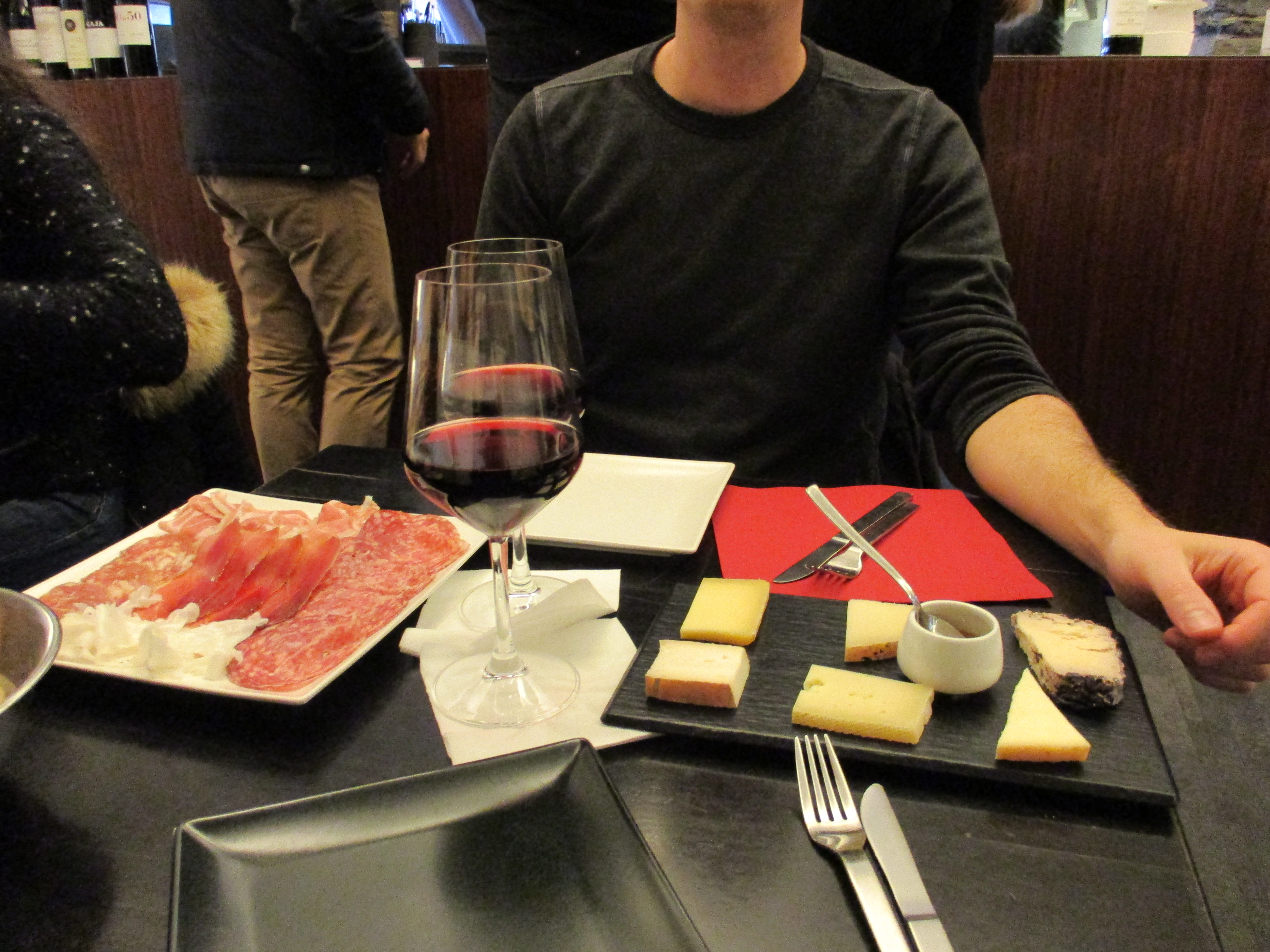 A gauche : le bar présent sur toutes les photos sur internet ; à droite : l’intérieur du dit bar Aperitivo et al, que nous devions naturellement tester ! Au menu : assortiment de charcuterie et de fromage du pays, avec bon vin rouge italien…