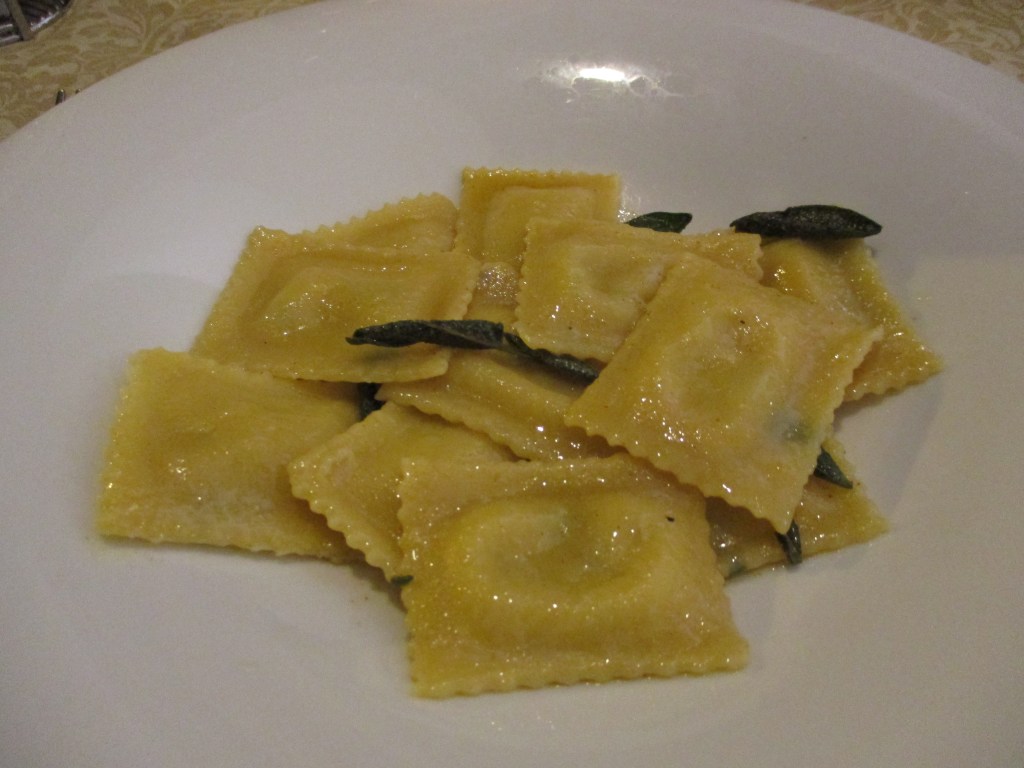 Ce premier jour intégrant trajet et visites de notre lieu de villégiature ayant été assez dense et touchant à sa fin, nous avons opté pour un petit restaurant de Bellagio afin de nous sustenter : Le Carillon. Au menu : ravioli beurre et sauge fait maison, un plat italien dont, personnellement, je raffole et que je reproduis à la maison quand j’ai la nostalgie de l’Italie ! Et moi qui voulais manger léger car déjà pas mal grignoté en journée, j’ai reçu une très jolie assiette…