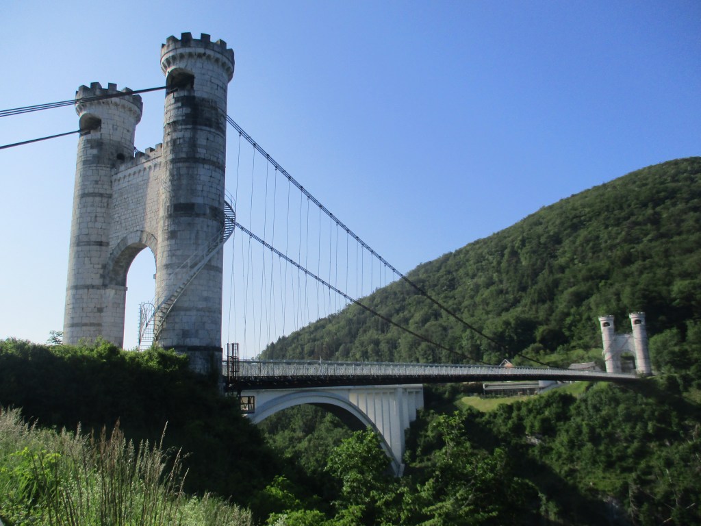 Comme à notre habitude, nous débutons nos mini-vacances par un passage au Pont de la Caille. Mais si, ce pont de 192 mètres de long au dessus d’un gouffre gigantesque, je suis certaine que ça vous dit quelque chose. Le site a été totalement réaménagé depuis notre dernier passage : aire de pique-nique, végétalisation, cheminement piétonnier, et surtout panneaux d’interprétation du paysage qui nous expliquent, entre autre, que lors de la mise en service du pont, une tempête a soulevé le tablier jusqu’en haut des piliers ! Bon, entre temps, il y a évidemment eu des travaux de renforcement de l’ouvrage, mais dans le doute, c’est très joli aussi à regarder depuis la terre ferme ! Et c’est notre petit rituel qui montre que, ça y est, nous sommes arrivés à destination.