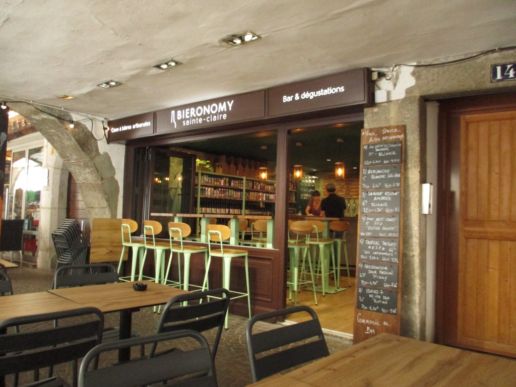 Nous trouvons assez rapidement chaussure à notre pied : le bar et cave à bières artisanales « Bieronomy Sainte-Claire » nous attire immédiatement. Superbe accueil de la part de la patronne qui nous explique son concept : des futs percés au fur et à mesure de leur consommation, et donc un choix qui varie au fil des heures. Adopté ! Malgré l’heure matinale, nous avons tout de même le droit à une jolie planchette réalisée par cette dernière, en accord avec nos bières locales. Une très bonne adresse, au calme sous les arcades qui plus est.