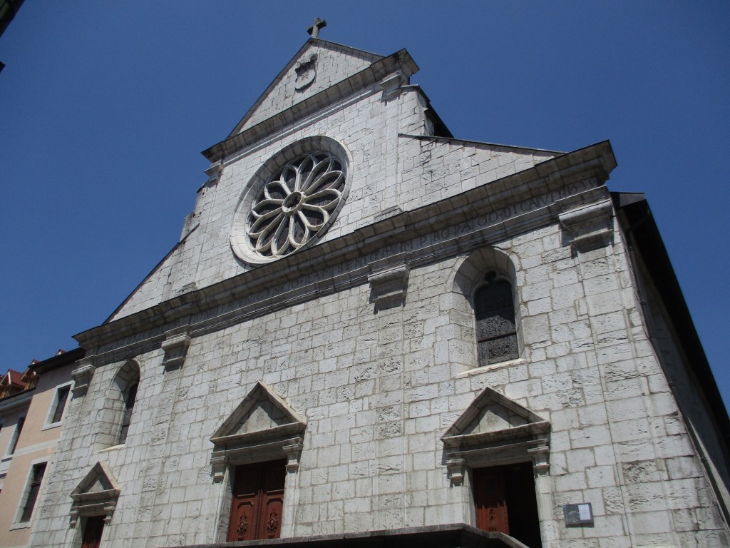 Fondée au XIVe siècle sur initiative d’Amédée III, comte de Genève, afin qu’elle serve de sépulture à sa famille, elle est également remaniée plusieurs fois au fil des siècles. La Révolution française entraine la disparition de son cœur, situé à l’emplacement de l’actuelle place sur laquelle trône désormais une jolie fontaine à obélisque, lions et tortues. Une reconstruction a lieu mais l’orientation de l’église change : le style devient également néoclassique dit « sarde », la Savoie appartenant alors au Royaume de Sardaigne.