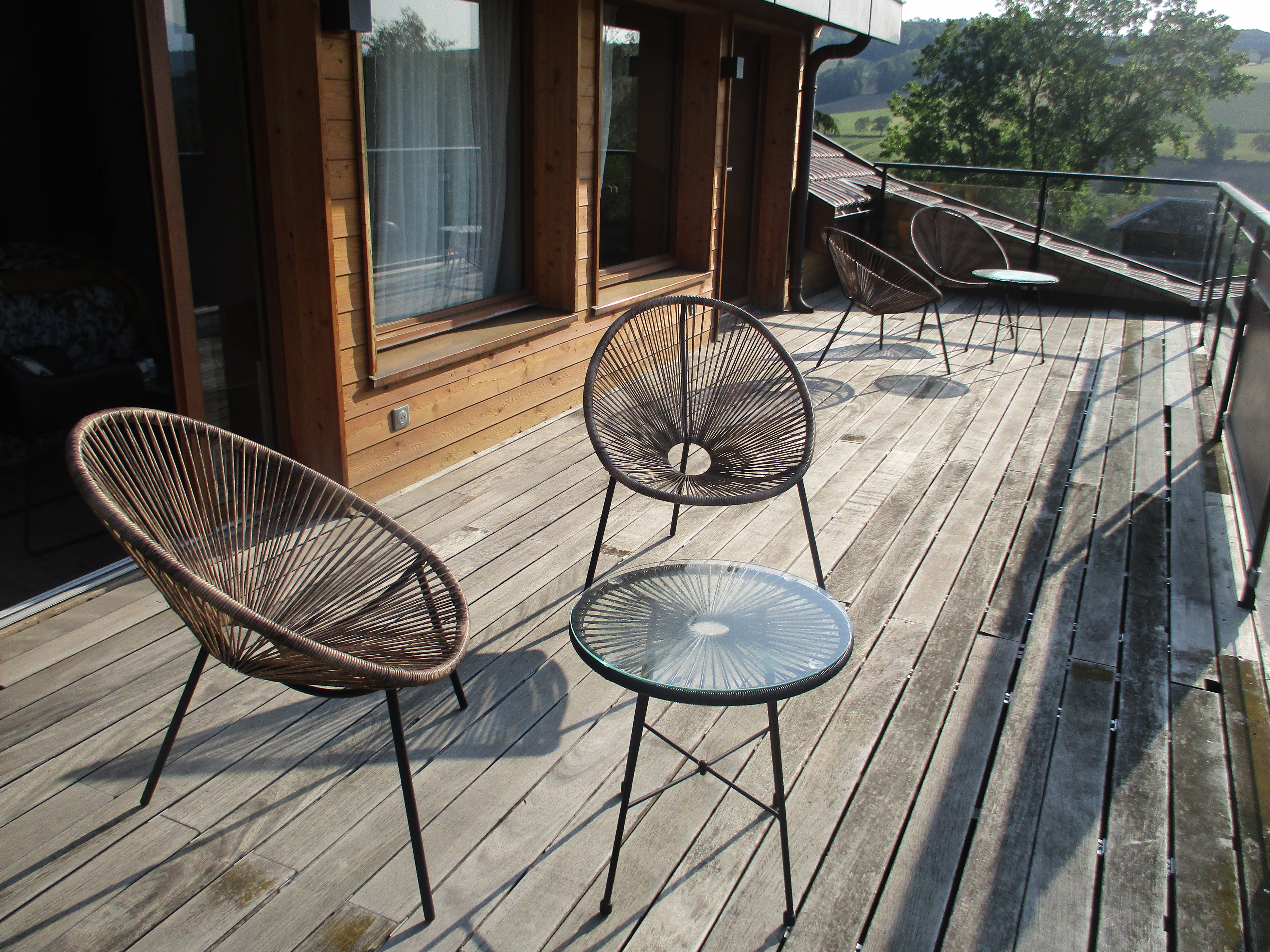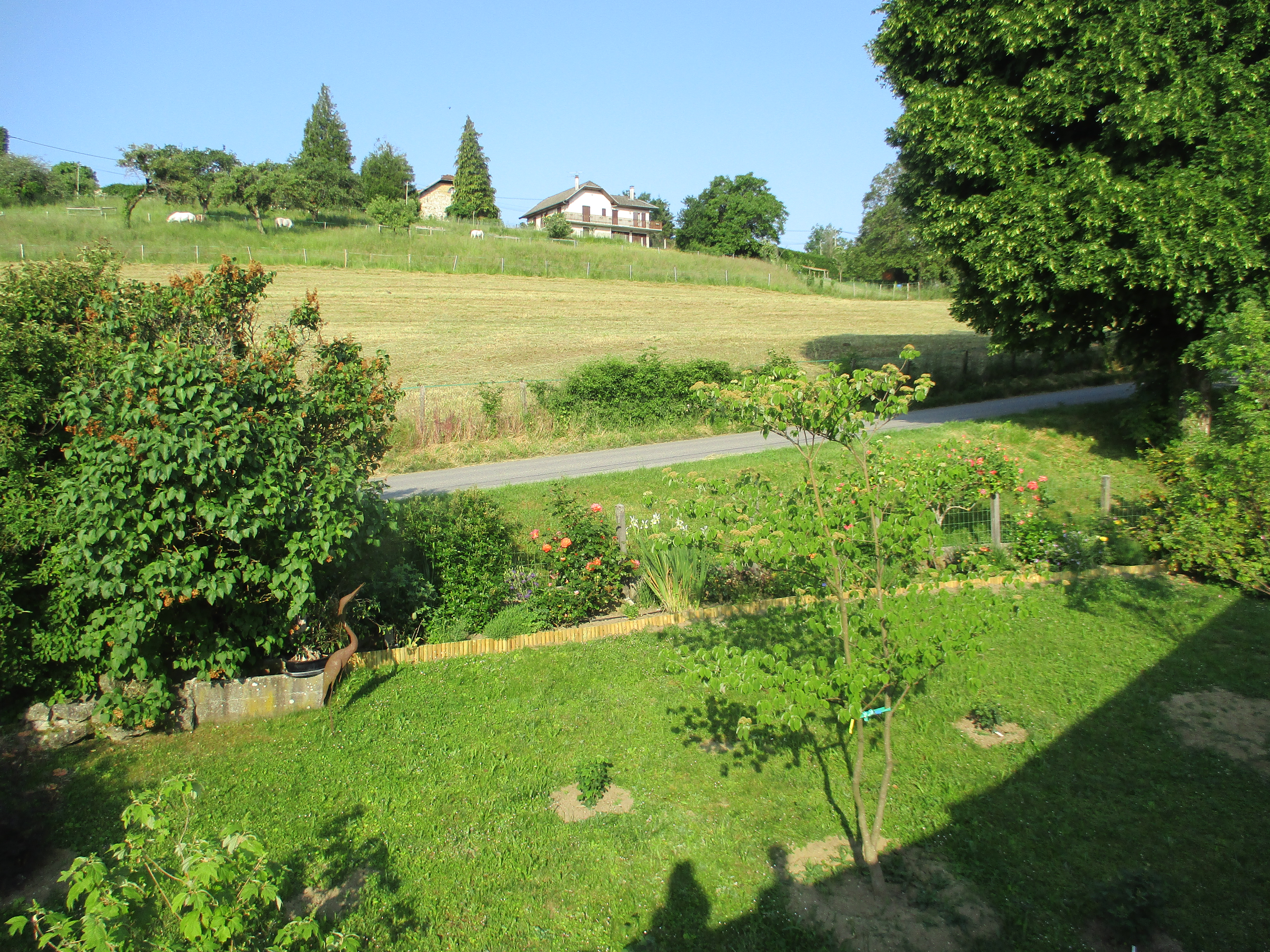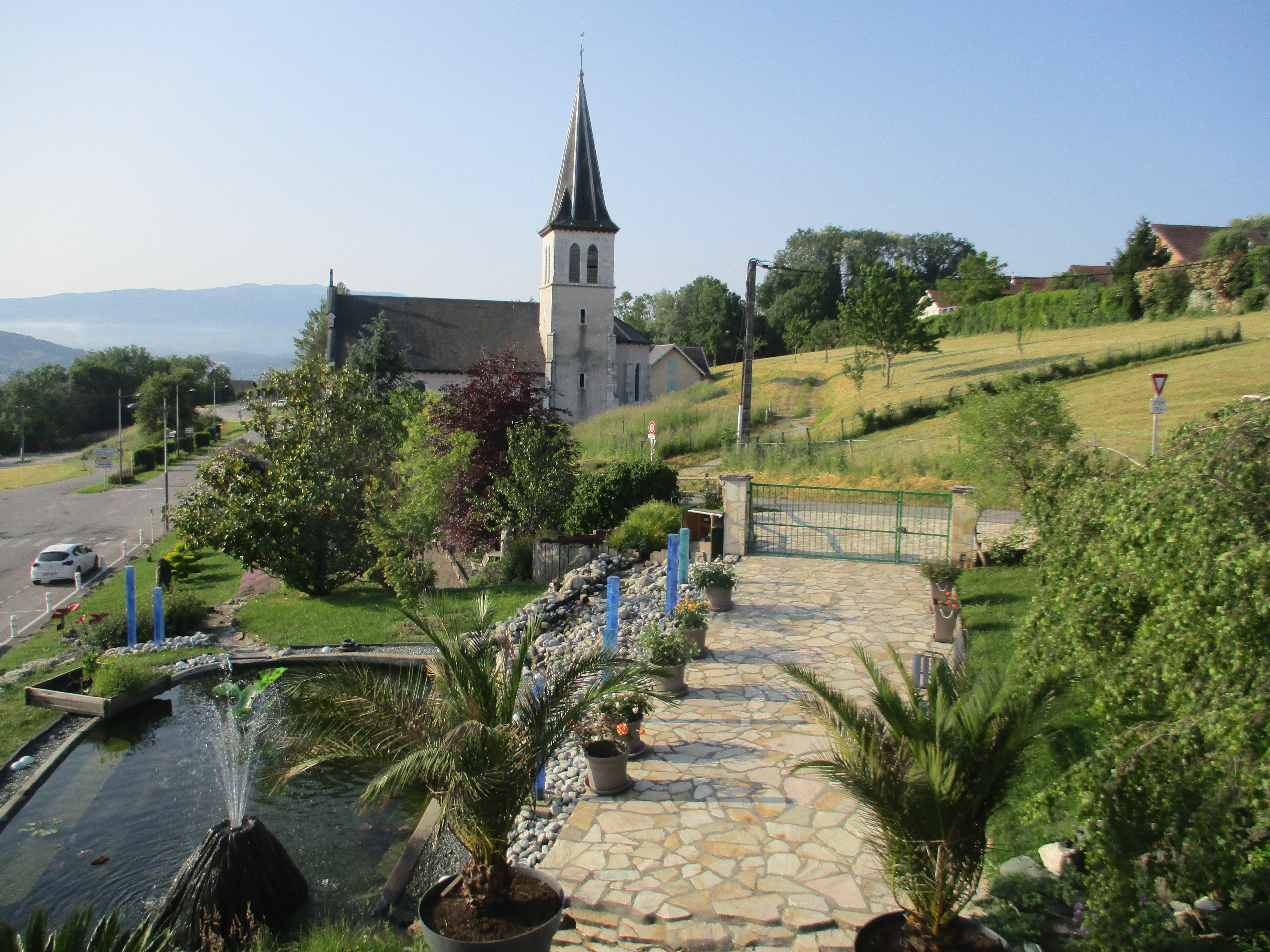 Monsieur a de la famille dans la région proche d’Annecy : nous avons donc passé la nuit précédente à Vaulx, chez son oncle et sa tante qui développent une activité de maison d’hôtes. Et en toute objectivité : j’ai adoré ! Située à l’étage de la maison d’habitation du couple, la chambre donne sur leur magnifique jardin paysager, sur les collines alentours ainsi que sur l’église du village. Personnellement, j’aime dormir les volets ouverts, et quel plaisir d’être réveillée par un rayon de soleil rentrant dans la chambre au son du clocher ! Un balcon domine le jardin et permet de profiter des premiers rayons de la journée en tout intimité, dans la mesure où il n’y a absolument aucun vis à vis. On se sent vraiment en vacances. La chambre en elle-même est également très belle : nous n’avions pas vraiment eu le loisir de l’admirer la veille à 2 heures du matin, c’est désormais chose faite.