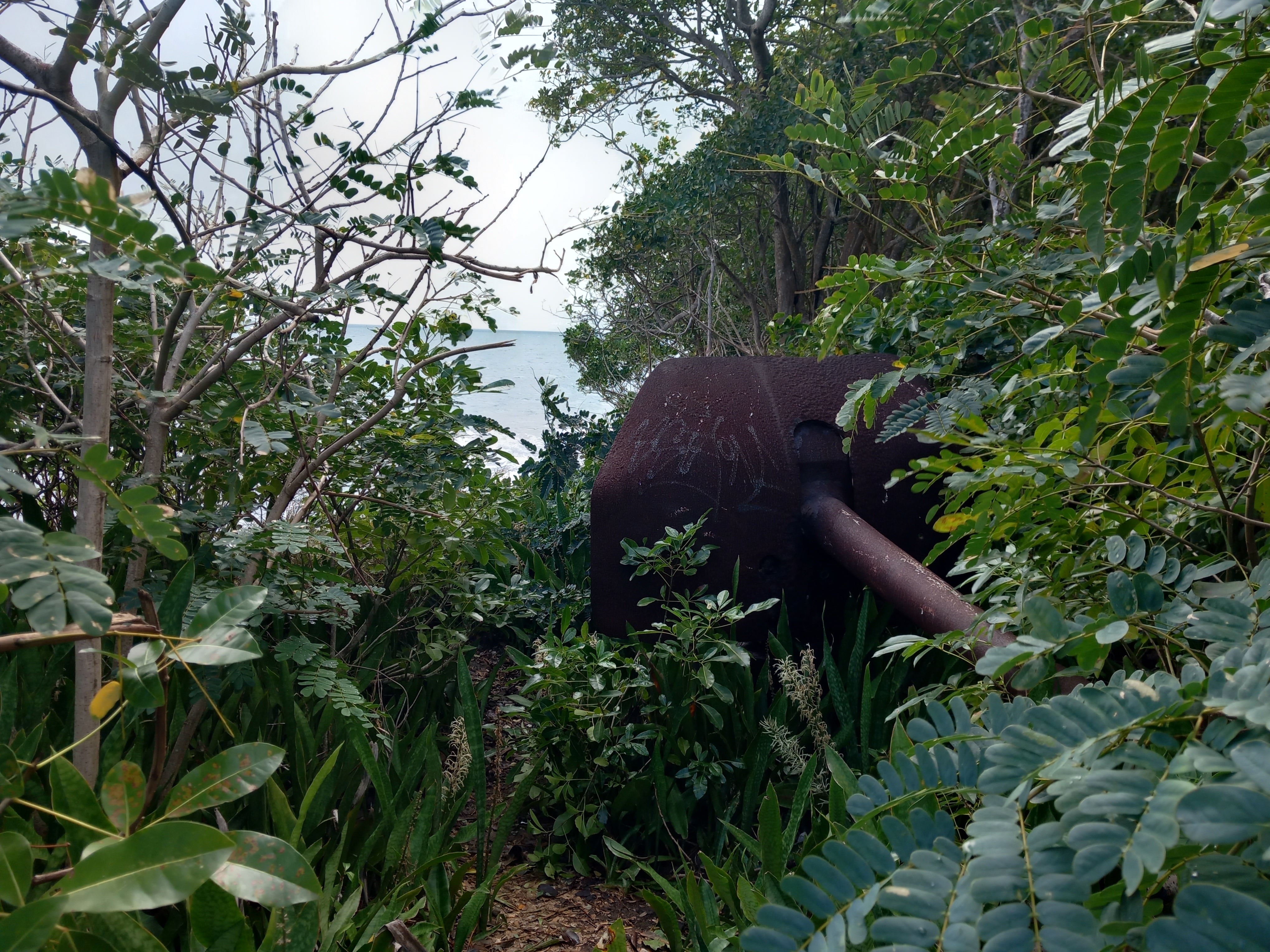 La journée se déroule de manière un peu particulière, puisque le temps est à la pluie tropicale : le parapluie nous accompagne donc toute la matinée dans notre promenade au sein de la station des Trois-Ilets. Nous découvrons la plage, les petites rues du village, mais également un fort masqué par la végétation à la Pointe-du-bout, depuis lequel nous apercevons la rade de Fort-de-France située pile de l’autre côté de la baie. Monsieur ne peut pas s’empêcher d’aller visiter un bunker, et moi de prendre des photos de plantes partout.