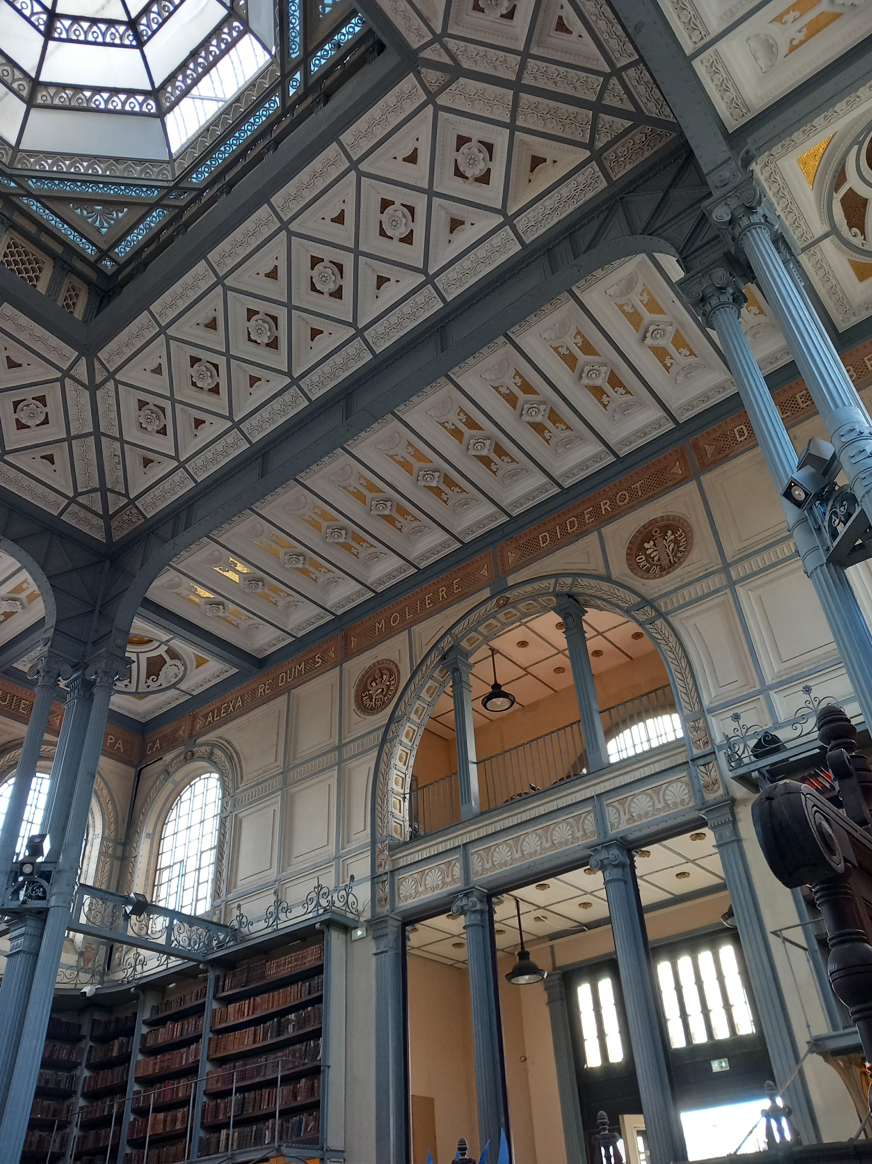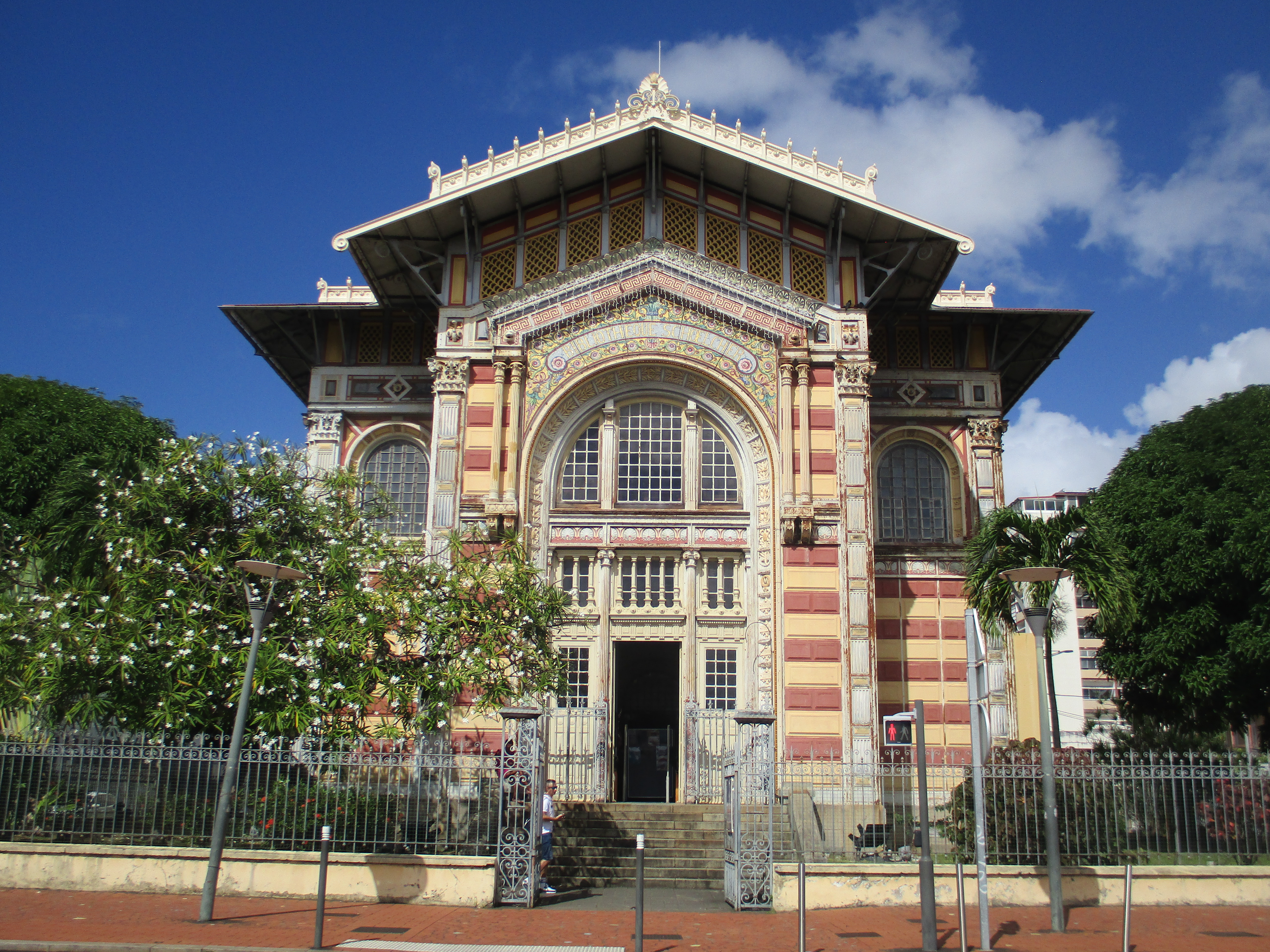 Nous traversons ensuite le square de la Savane, immense parc public, afin de rejoindre la bibliothèque Schoelcher, bâtiment à l’histoire atypique, et surtout transatlantique. Œuvre de l’architecte Henri PICQ, constructeur également de la Cathédrale Saint-Louis, sa structure métallique a été réalisée dans les ateliers de Gustave Eiffel. Construite à l’origine pour l’exposition universelle de Paris en 1887, elle a été démontée, affrétée jusqu’à Fort-de-France, puis reconstruite en 1893 à son emplacement actuel. Lors de notre venue, nous avons la chance de nous faire présenter les lieux par la directrice du site : histoire du bâtiment, fonction actuelle, fonds documentaires conservés… Un très bon moment auquel nous ne nous attendions pas ! Et le lieu, objectivement, est juste magnifique (même si en termes de conservation préventive, je n’aimerais pas travailler dedans, et c’est une pro du domaine qui parle !)
