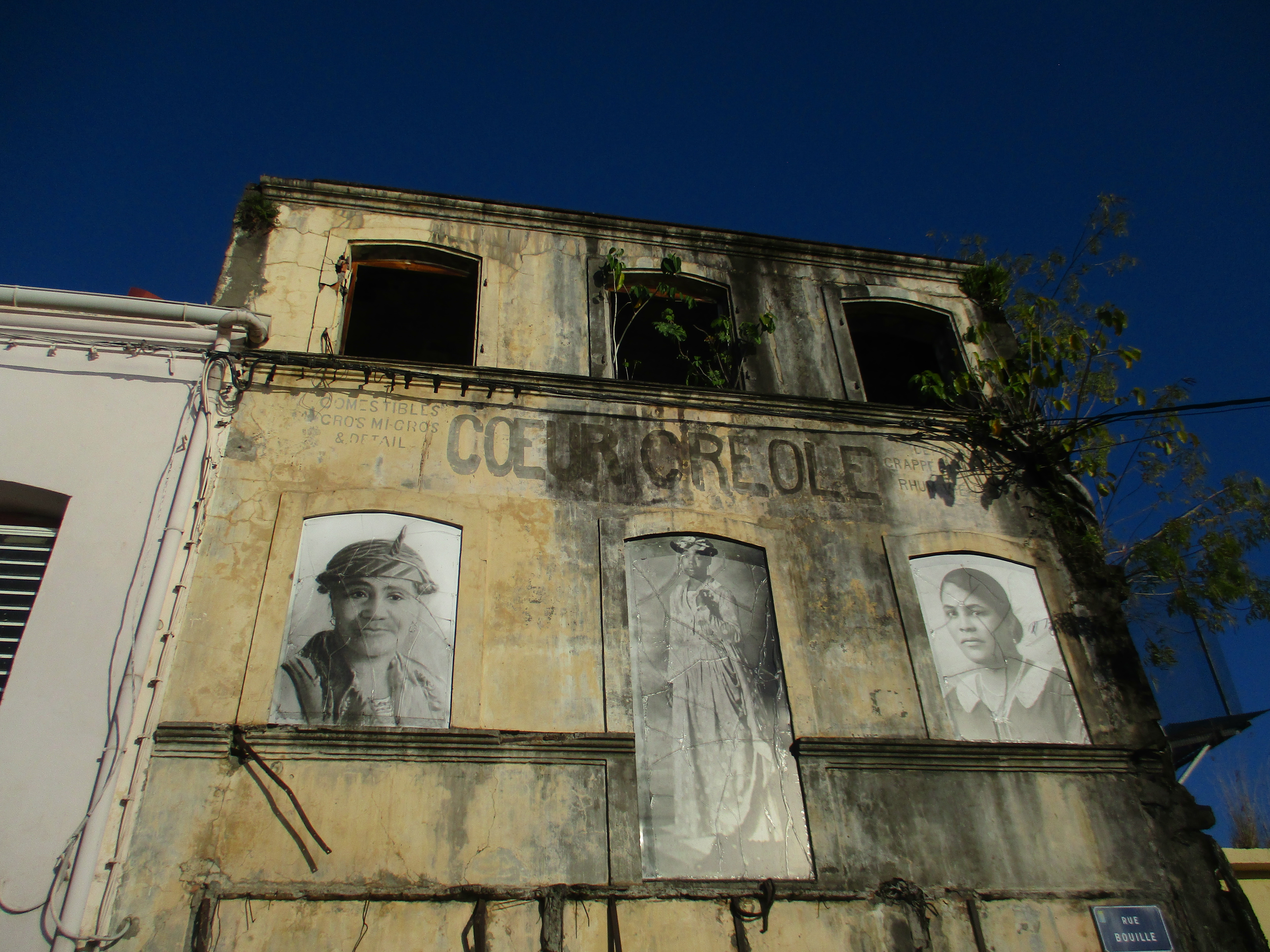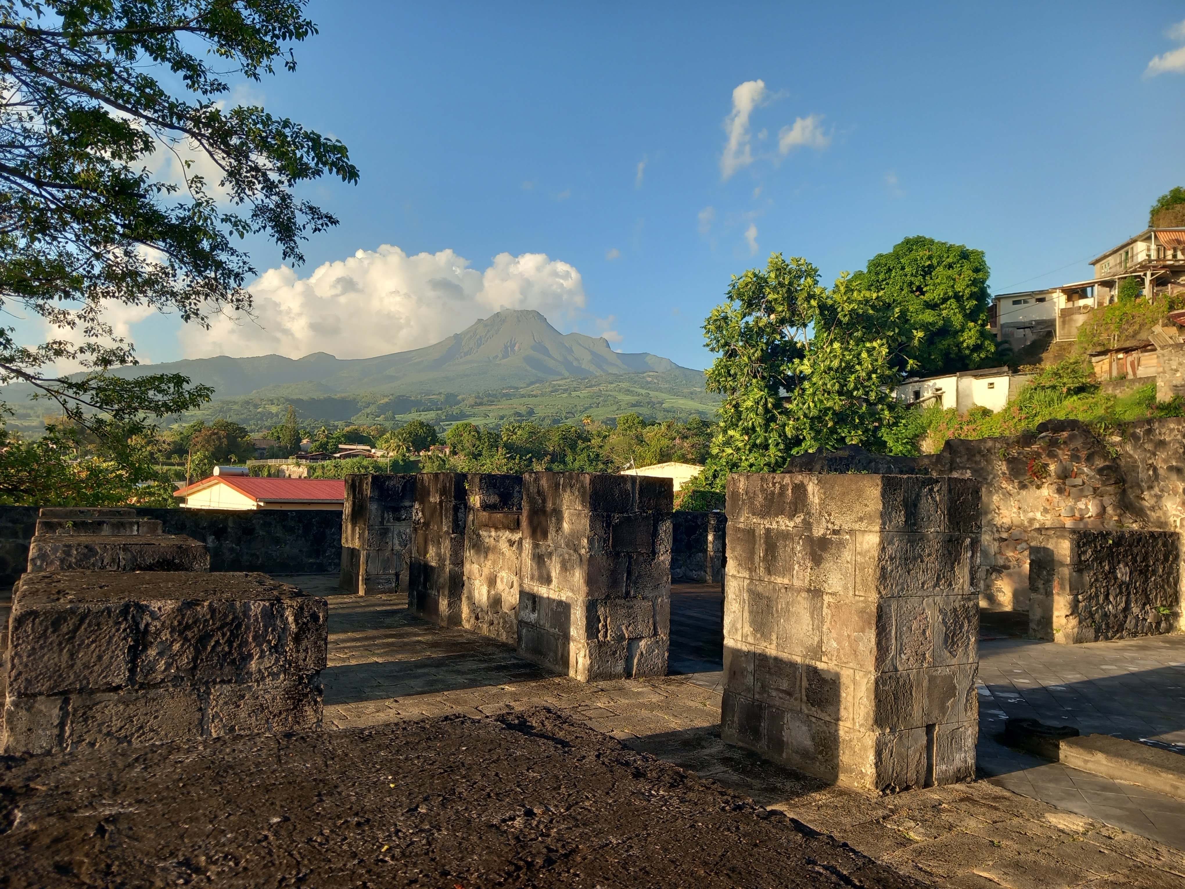 Nous avons donc rejoint notre Hyundai de location pour nous diriger vers Saint-Pierre, notre dernière destination de la journée. L’ambiance claire obscure de début de soirée est totalement appropriée à la visite de cette ville qui dégage une atmosphère très particulière. Pour l’histoire : la commune et ses 28000 habitants ont été rayés de la carte en 1902, en quelques minutes, par l’éruption de la Montagne pelée, le volcan de l’île encore en activité aujourd’hui. La ville n’a jamais été reconstruite réellement, les travaux de déblaiement et de reconstruction se réalisant au gré des réinstallations en ville. Ce qui fait qu’encore aujourd’hui, une maison d’habitation « neuve » côtoiera une ruine semblant sorti d’un incendie l’année précédente. Des ruines des bâtiments emblématiques de la ville sont visitables, telles le théâtre (qui ressemblait à celui de Bordeaux), l’église, un quartier d’habitation au bord de l’eau, et naturellement la prison où la cellule de Cyparis, seul rescapé (ou plutôt : seul rescapé dont l’histoire ait retenue le nom), est également visitable.