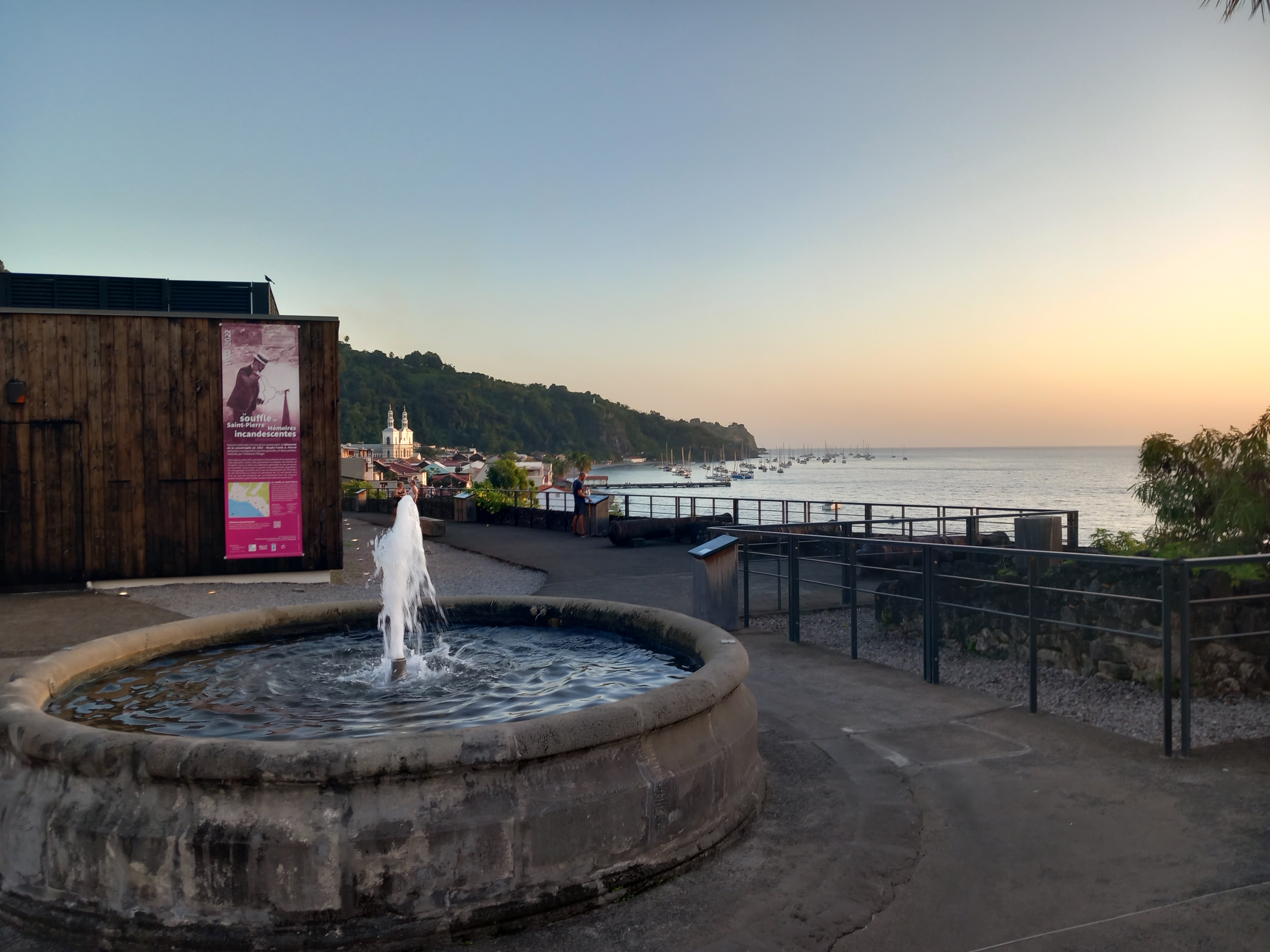 Une atmosphère très étrange se dégage des lieux, et la Montagne pelée menaçante, est parfaitement visible depuis les ruines, semblant observer son méfait… Un musée a été construit dans la nouvelle ville en 1933 par Frank Perret, vulcanologue et géologue américain, à des fins d’étude du volcan mais également de sauvetage d’objets de la vie de tous les jours retrouvés dans les décombres : nous sommes arrivés trop tardivement sur place pour le visiter, mais il est évident que nous l’inscririons au programme si nous devions revenir en Martinique. La promenade sur lequel il se situe donne sur la mer : des panneaux régulièrement implantés détaillent les différentes épaves de navires se trouvant sous l’eau dans la rade et ayant été coulés lors de l’éruption, soit par incendie, soit par la violence de l’onde de choc qui les a carrément fait chavirer. On a du mal à imaginer la puissance que ce volcan, pourtant bien éloigné, a dû dégager… Glaçant, d’autant plus à la tombée de la nuit.