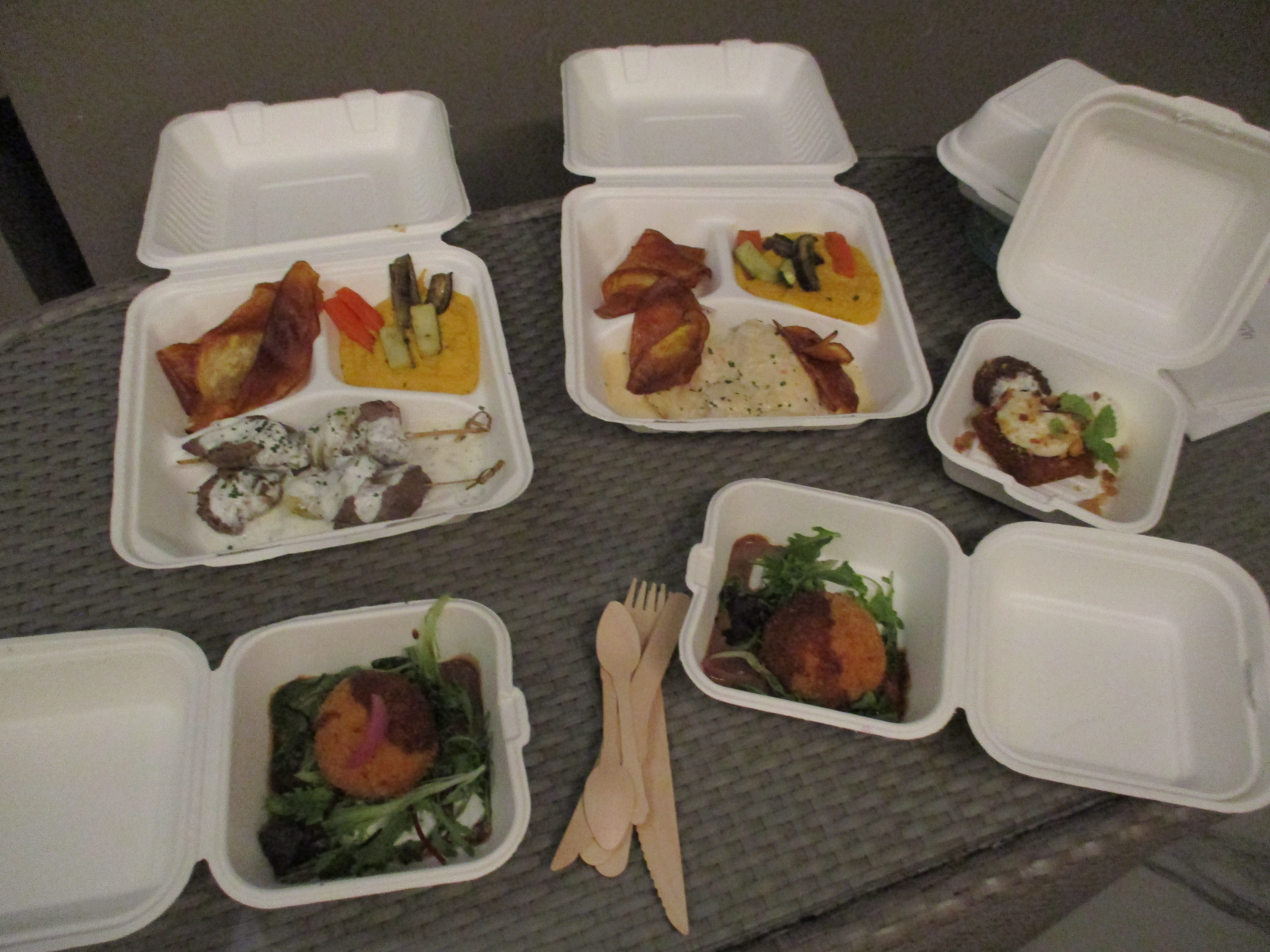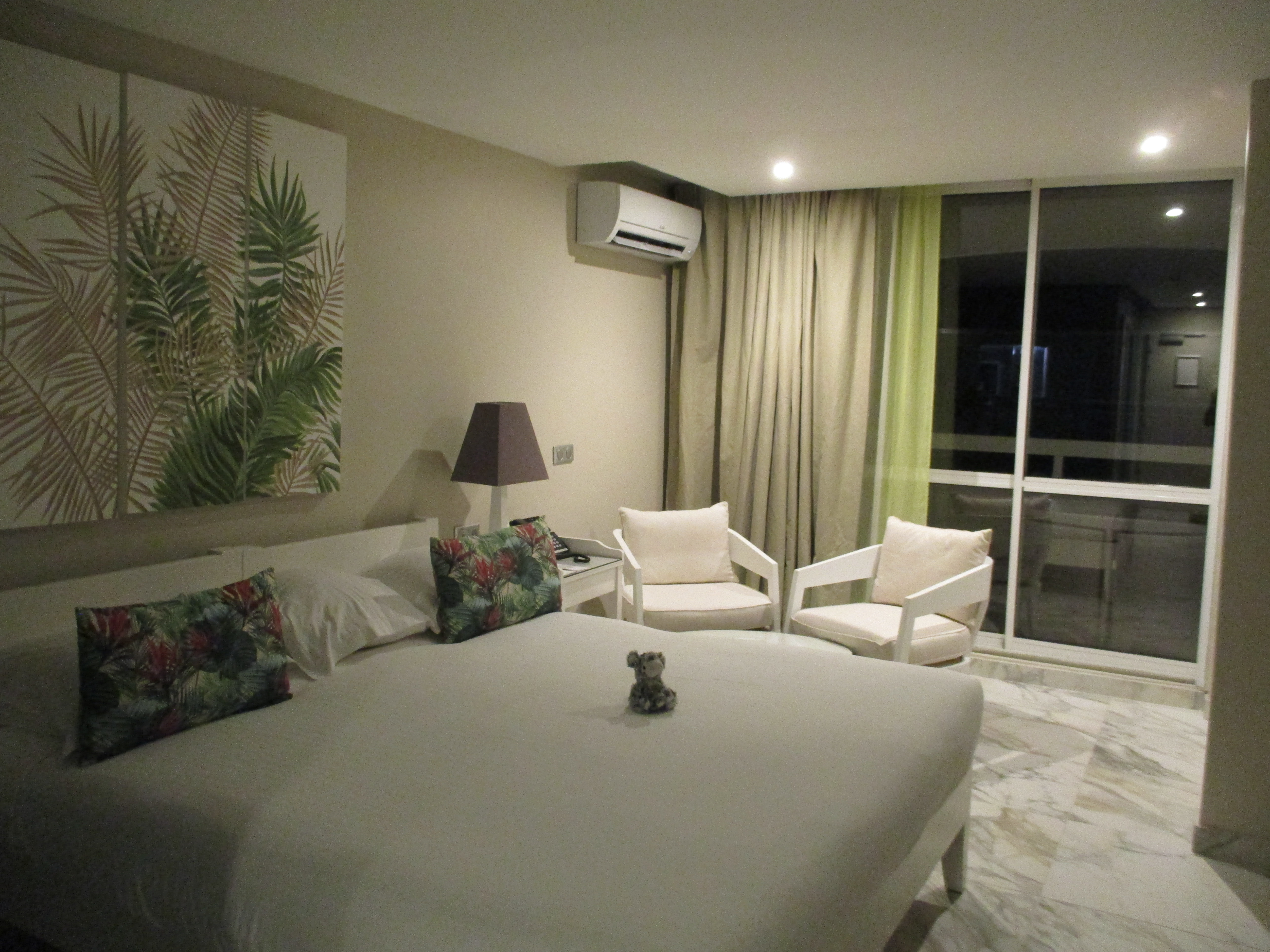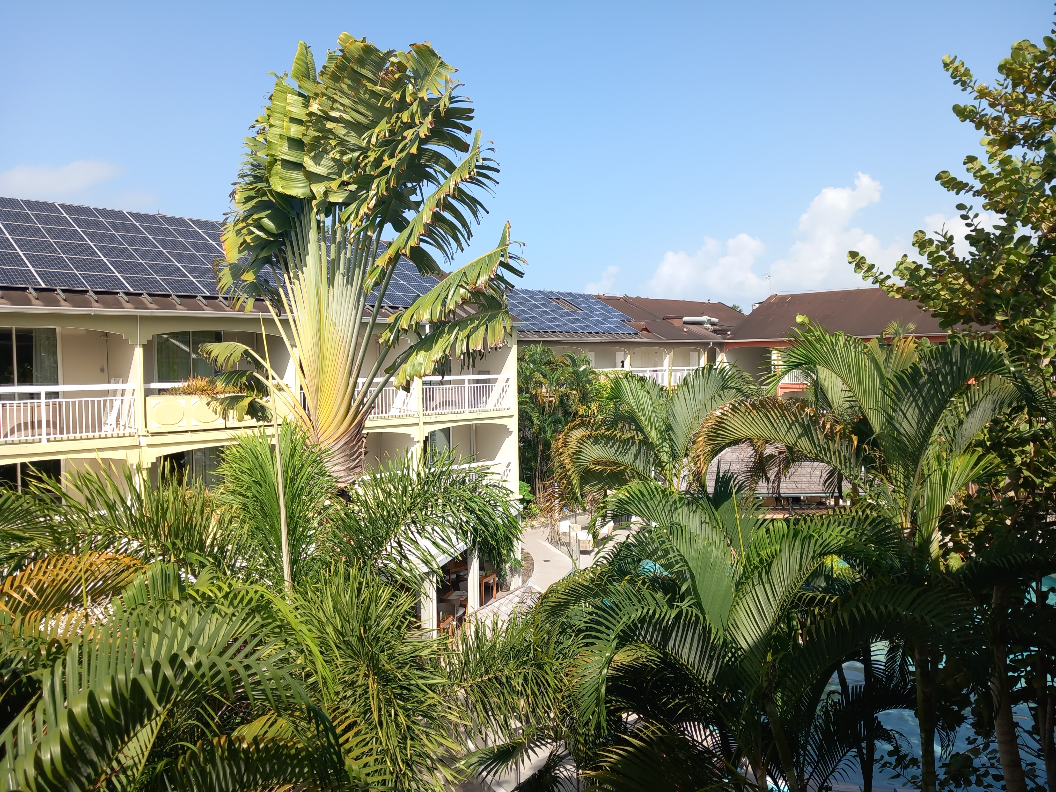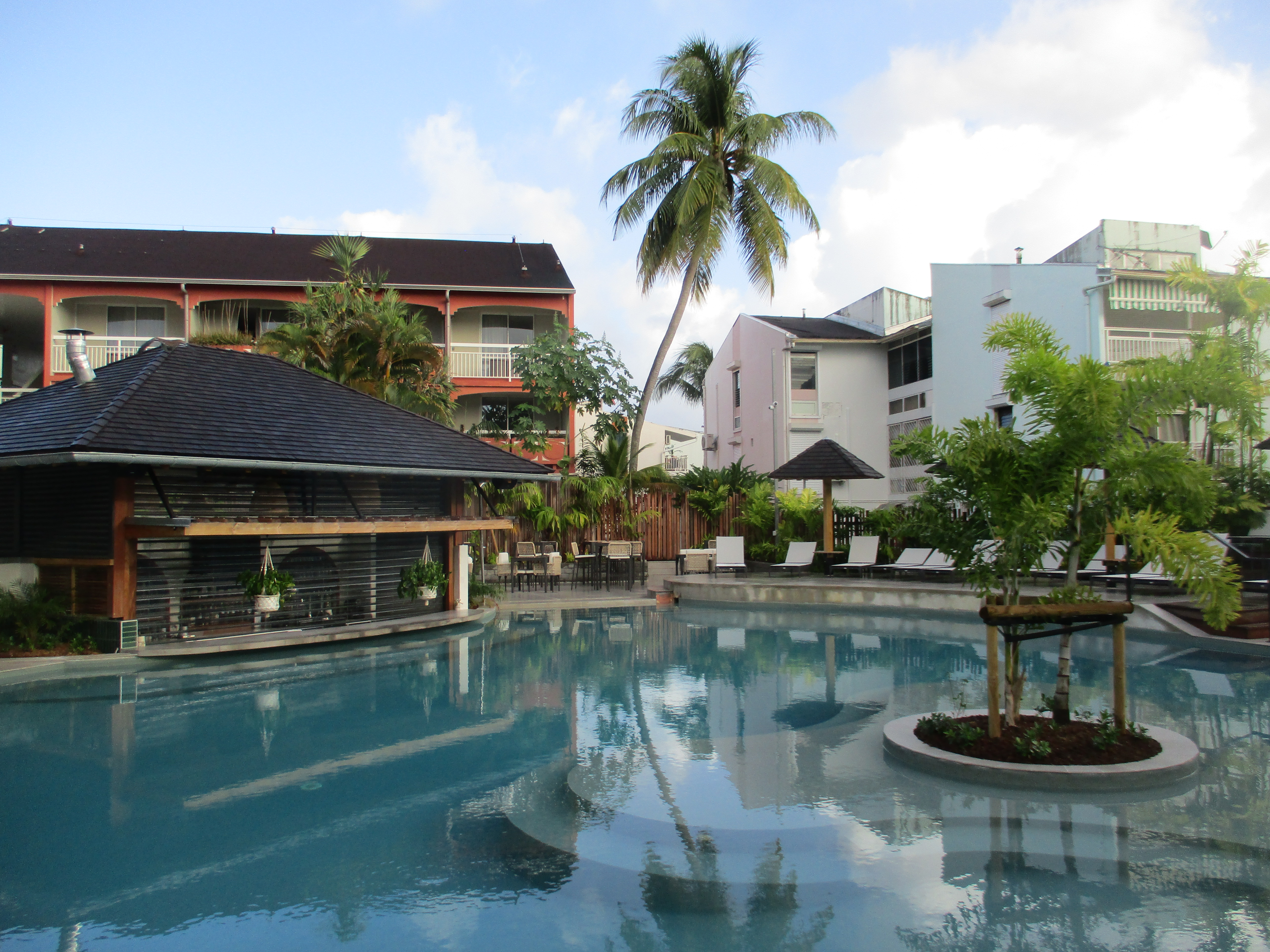 Après une demi-heure de trajet, nous arrivons enfin à l’hôtel, la Pagerie – Tropical Garden Hotel, aux Trois-Ilets. Là également, nous sommes en retard pour le repas du soir, mais la réception a tout prévu, et un doggy bag MAGNIFIQUE nous accompagne dans notre chambre, laquelle est tout autant sublime. Donnant directement sur le jardin et un arbre du voyageur majestueux, elle dispose d’un grand balcon sur lequel nous attaquons immédiatement notre repas, avant d’aller enfin nous coucher car, mine de rien, nous venons de déguster de l’agneau et du poisson à 4 heures du matin !