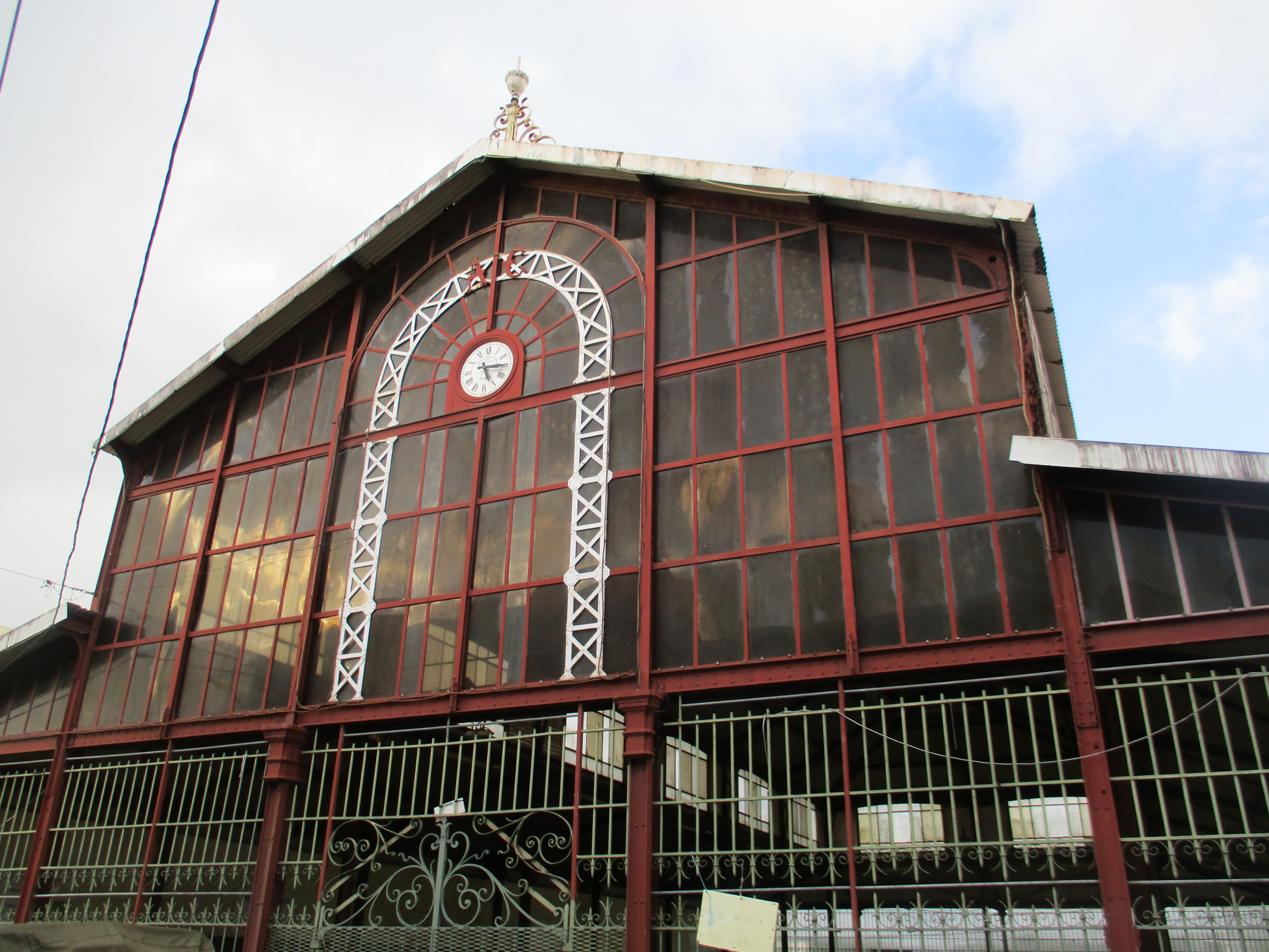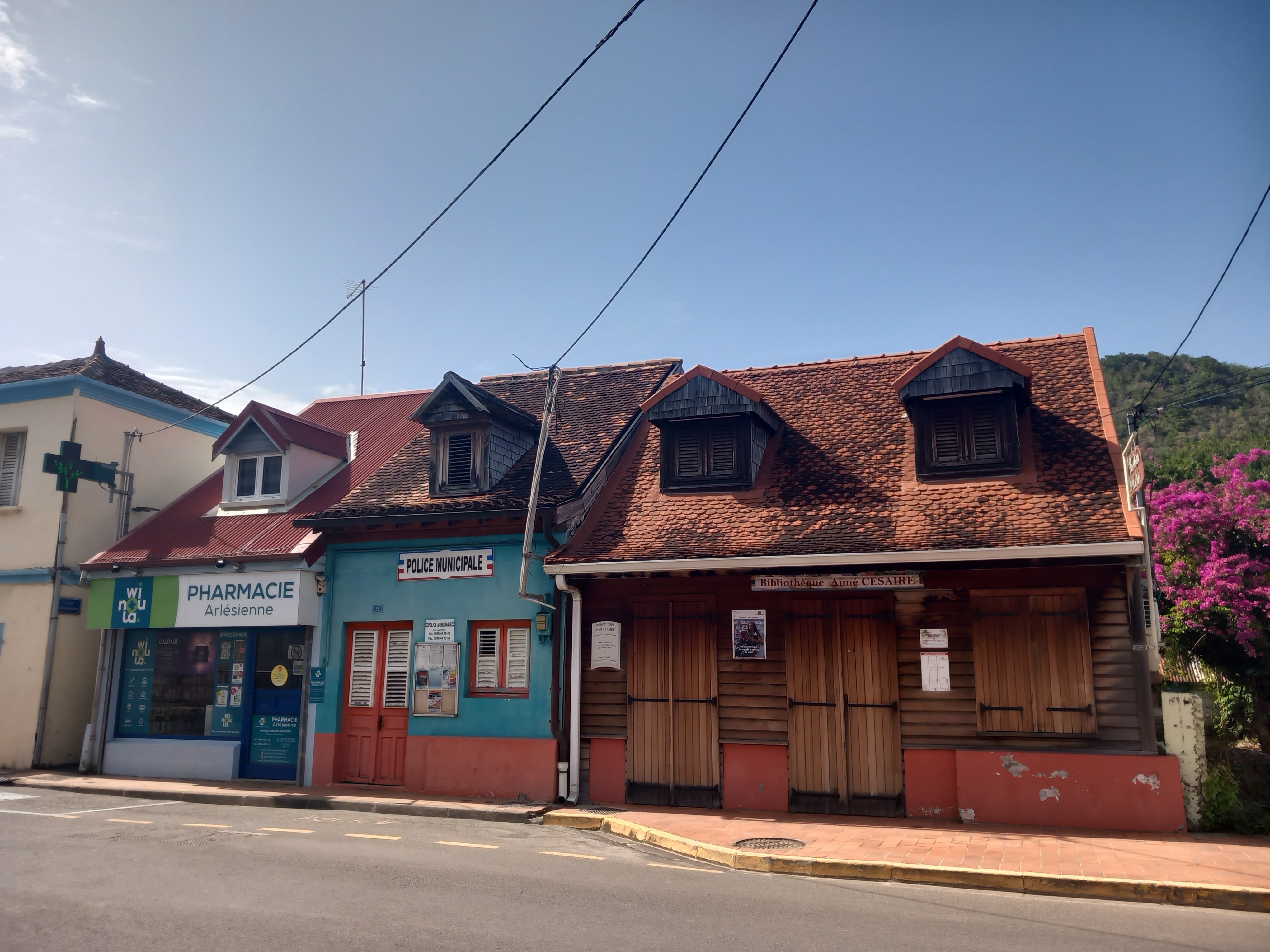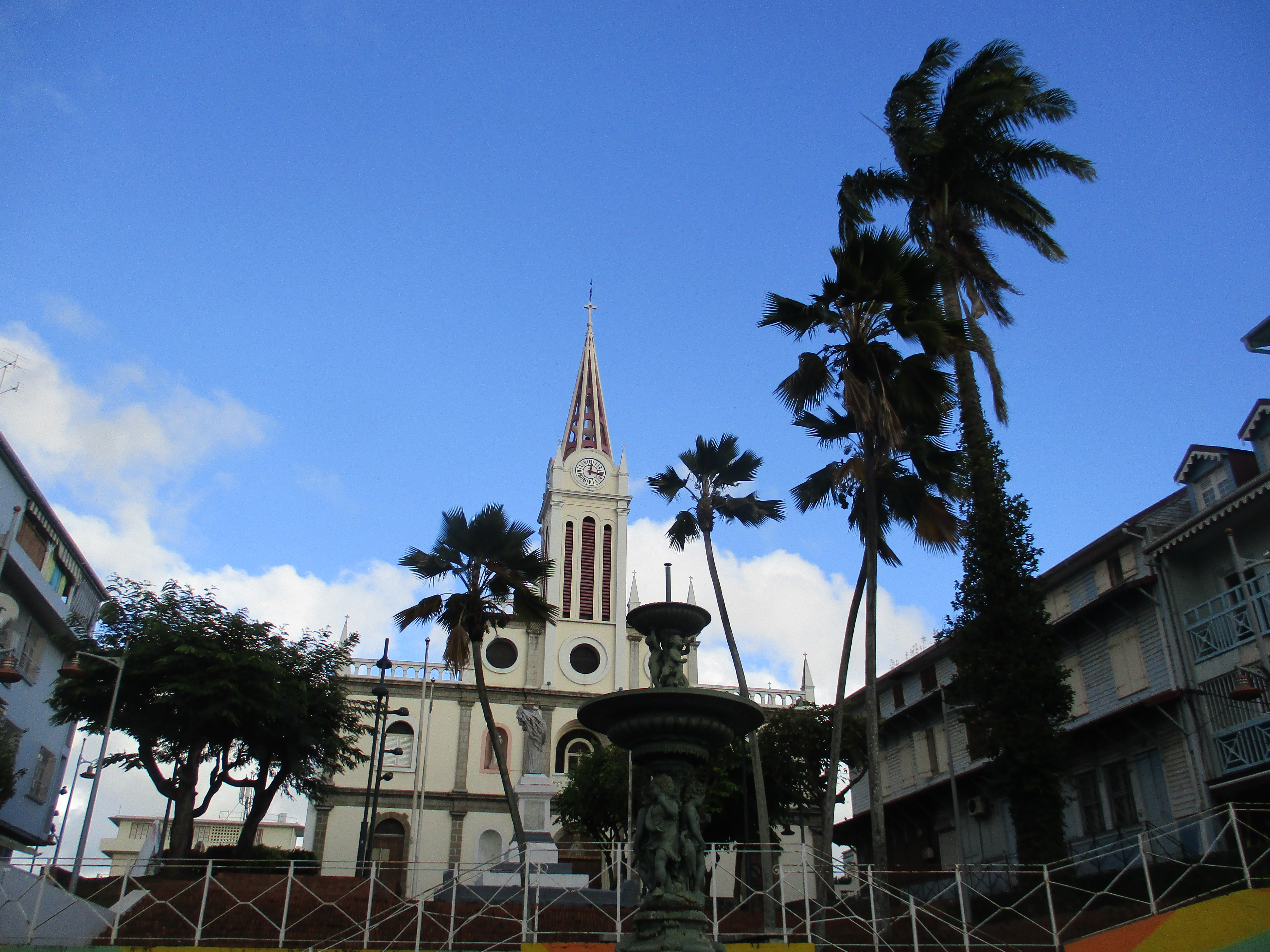 Nous poursuivons ensuite notre déambulation en ville en rejoignant le quartier de la cathédrale, dans laquelle se tient une messe lors de notre premier passage : nous admirons sa flèche métallique avant de nous marcher vers l’ancienne cour d’appel (actuel espace Camille Darsières), la fontaine Geydon (ancien réservoir d’approvisionnement en eau potable de la ville), puis le théâtre municipal et le bureau d’Aimé Césaire (fermé le jour de notre venue, mais nous avons pu pénétrer dans le hall du bâtiment). Nous nous arrêtons naturellement afin de nous désaltérer au sein du petit marché artisanal qui se tient sur la promenade du port (et une fois n’est pas coutume, nous goûter des jus de fruits, et pas seulement des bières !)