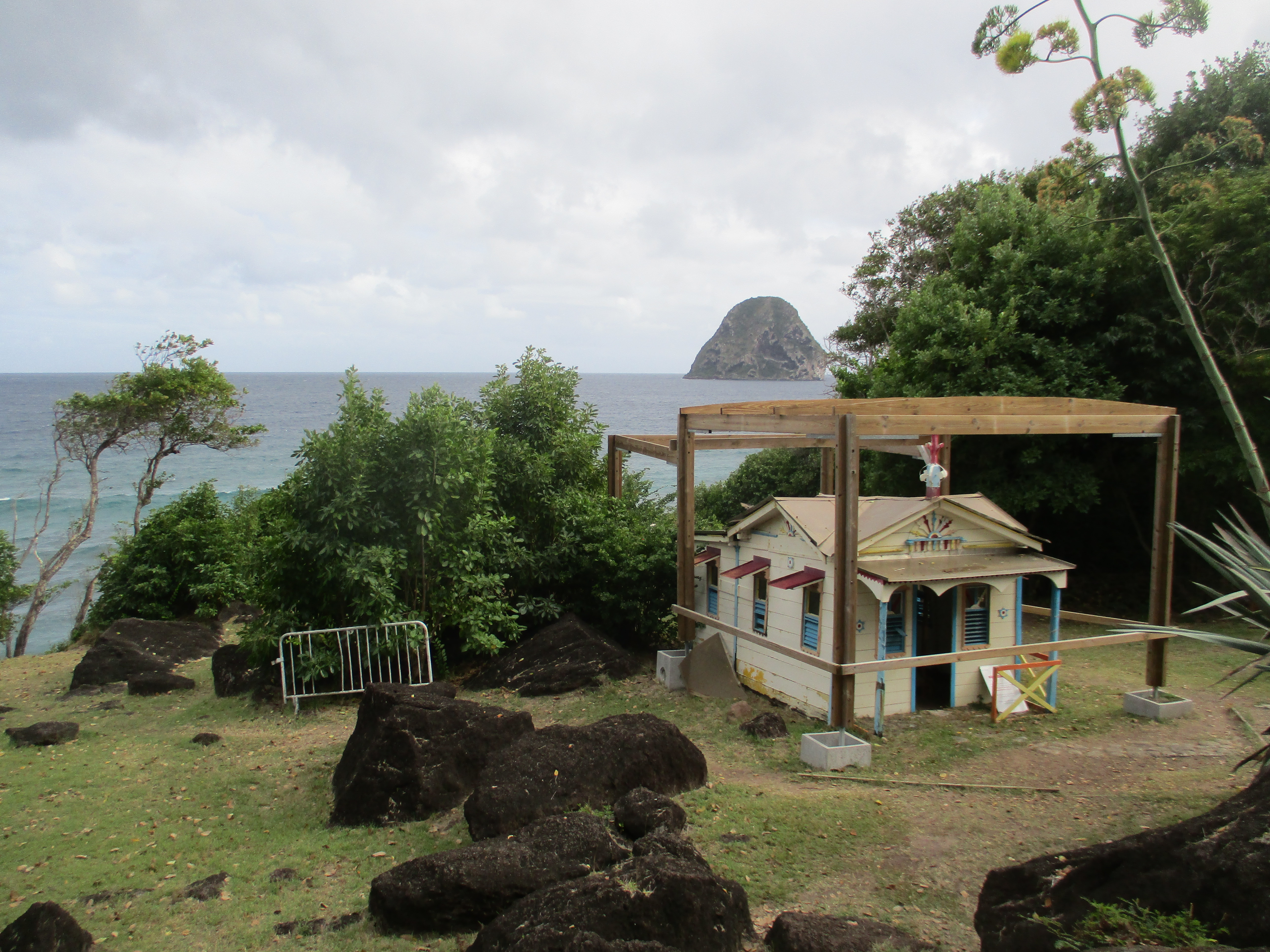 Nous avons de là une vue magnifique sur le rocher du Diamant, et nous pouvons également observer la Maison du Bagnard en cours de consolidation, une minuscule habitation construite dans les années 60 par un ancien prisonnier du bagne de Cayenne.