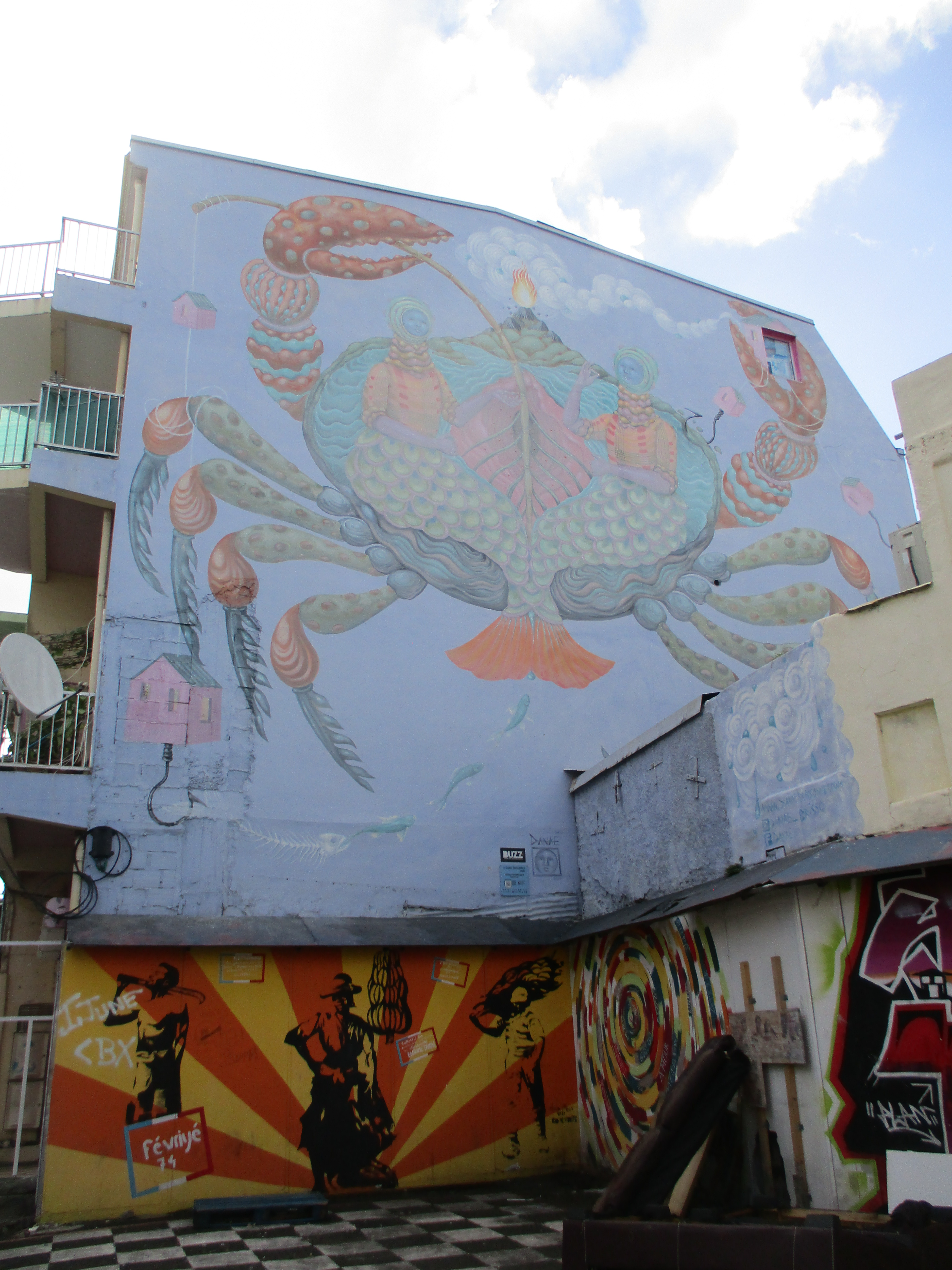 La rue dans laquelle nous nous garons me plait au premier regard : nous sommes au cœur d’un quartier dont les façades des maisons sont nombreuses à être recouvertes de murs peints ! Je découvre d’ailleurs qu’un circuit de visite guidée consacré à cette thématique existe d’ailleurs, ça aurait été intéressant à suivre. Dans tous les cas, nous prenons déjà plaisir, à peine arrivés, à arpenter des rues résidentielles afin d’admirer les façades.