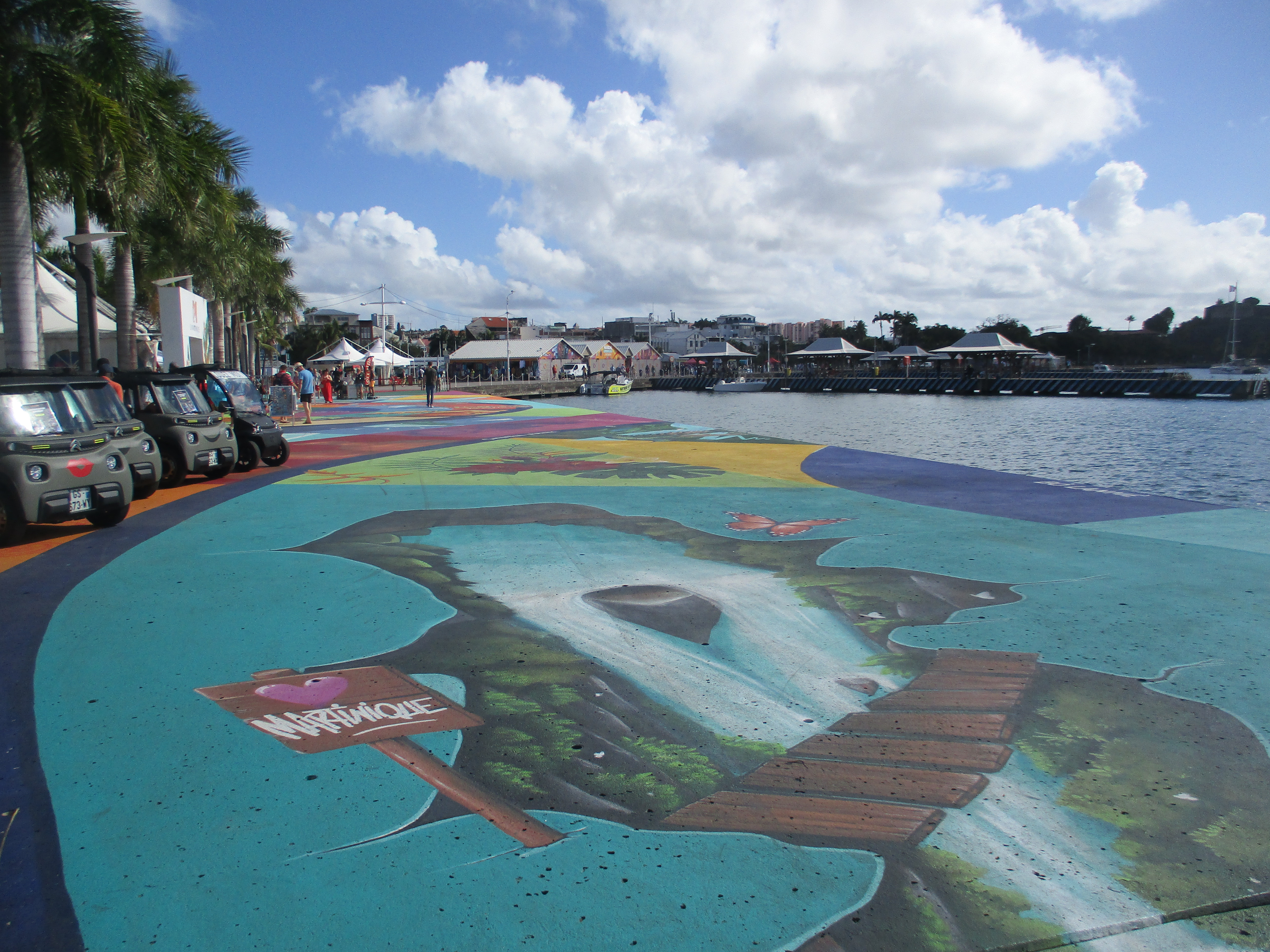 Avantage du lieu : il est juste magnifique pour qui, là encore, aime le muralisme… cette fois à nos pieds. L’intégralité du quai est coloré et peint, et la vue vers la ville est très belle vue d’ici. Nous déambulons donc jusqu’au Fort Saint-Louis situé de l’autre côté de la baie : ce dernier est encore militaire en activité et ne se visite pas, mais il y a des canons devant la porte alors monsieur ne résiste pas…