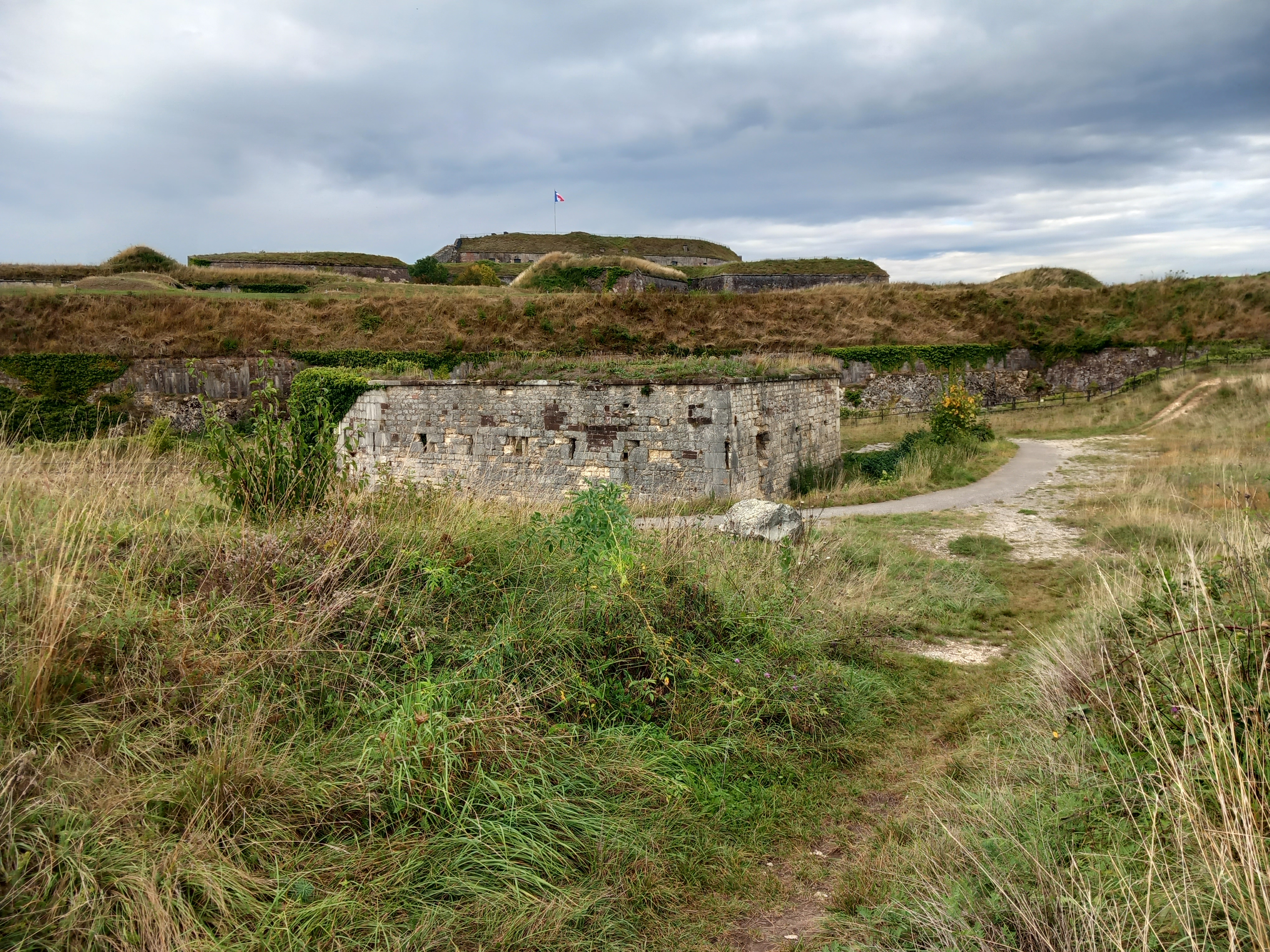 De là, vous pouvez redescendre au centre-ville ou retourner vers la Tour des Bourgeois pour rejoindre le parking « Xavier Bauer » dit « du Char Martin » afin d’admirer le véhicule du même nom ; sa tourelle est d’ailleurs exposée dans le fossé que vous venez de quitter. A sa gauche, un chemin de promenade permet de rejoindre le fort que je viens de citer, mais également d’admirer des parties de fortification de très près. C’est une balade très calme, des personnes promènent leurs chiens et leurs chats (véridique), on se croit en pleine campagne alors qu’à 100 mètres d’un parking (gratuit, d’ailleurs).