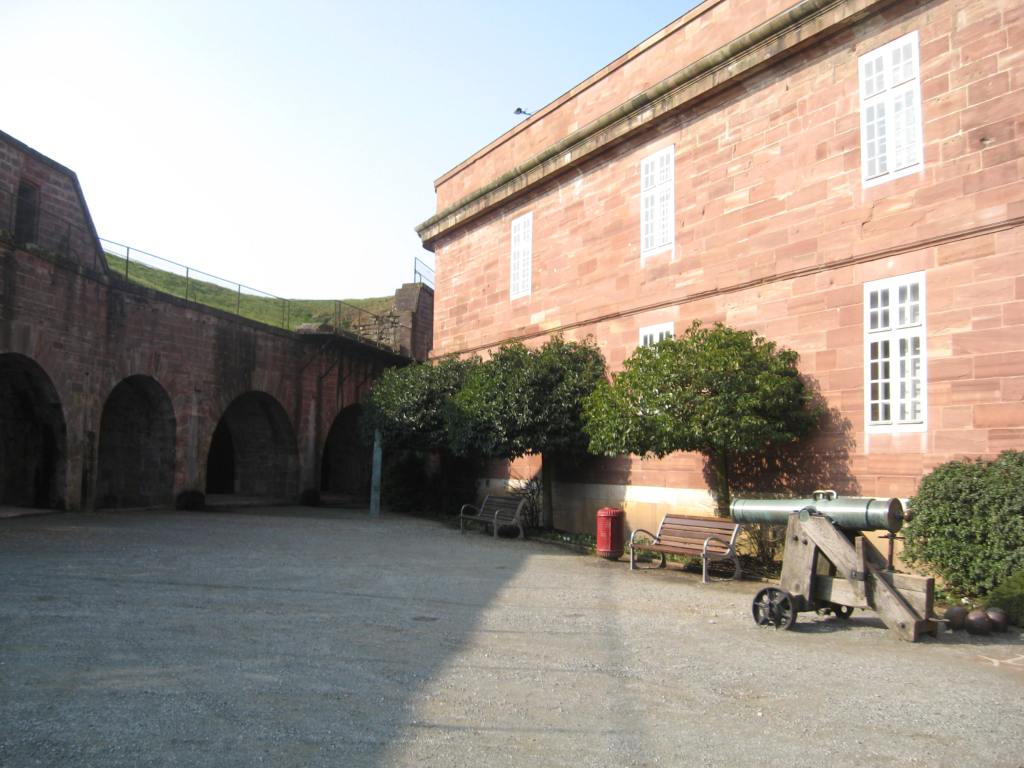 En haut, vous arrivez dans la cour d’honneur devant l’actuel musée d’histoire : c’est là que se tenait le château médiéval mentionné précédemment ; le général Haxo a transformé ce dernier en caserne, encore visible actuellement. De l’autre côté de la cour est visible un « cavalier casematé », aujourd’hui devenu un très bon restaurant ; à sa droite, une petite pièce permet d’admirer un puits médiéval restauré il y a quelques années, dont la profondeur vous impressionnera…