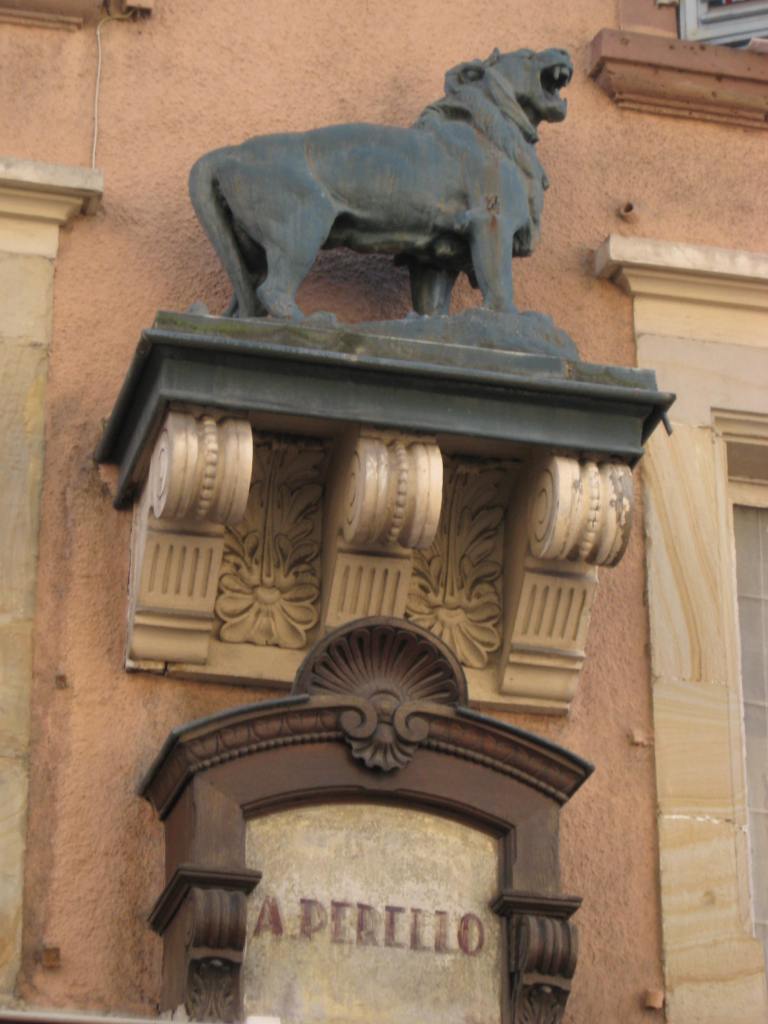 Empruntez maintenant la rue de la Porte de France (du nom d’une porte de la fortification Vauban abattue à la toute fin du XIXe siècle afin de permettre l’expansion urbaine) ; vous pouvez admirer la façade de l’épicerie Perello et son petit lion, plus âgé que l’égérie de la ville. En effet, les travaux de construction du Lion de Belfort tardant à débuter, et la population s’impatientant, M. Perello a décidé d’en construire un lui-même, et de s’en servir comme argument publicitaire : « En attendant de voir enfin le Lion de Bartholdi, n’hésitez pas à venir admirer celui de Perello, et à venir consommer ceci et cela » !