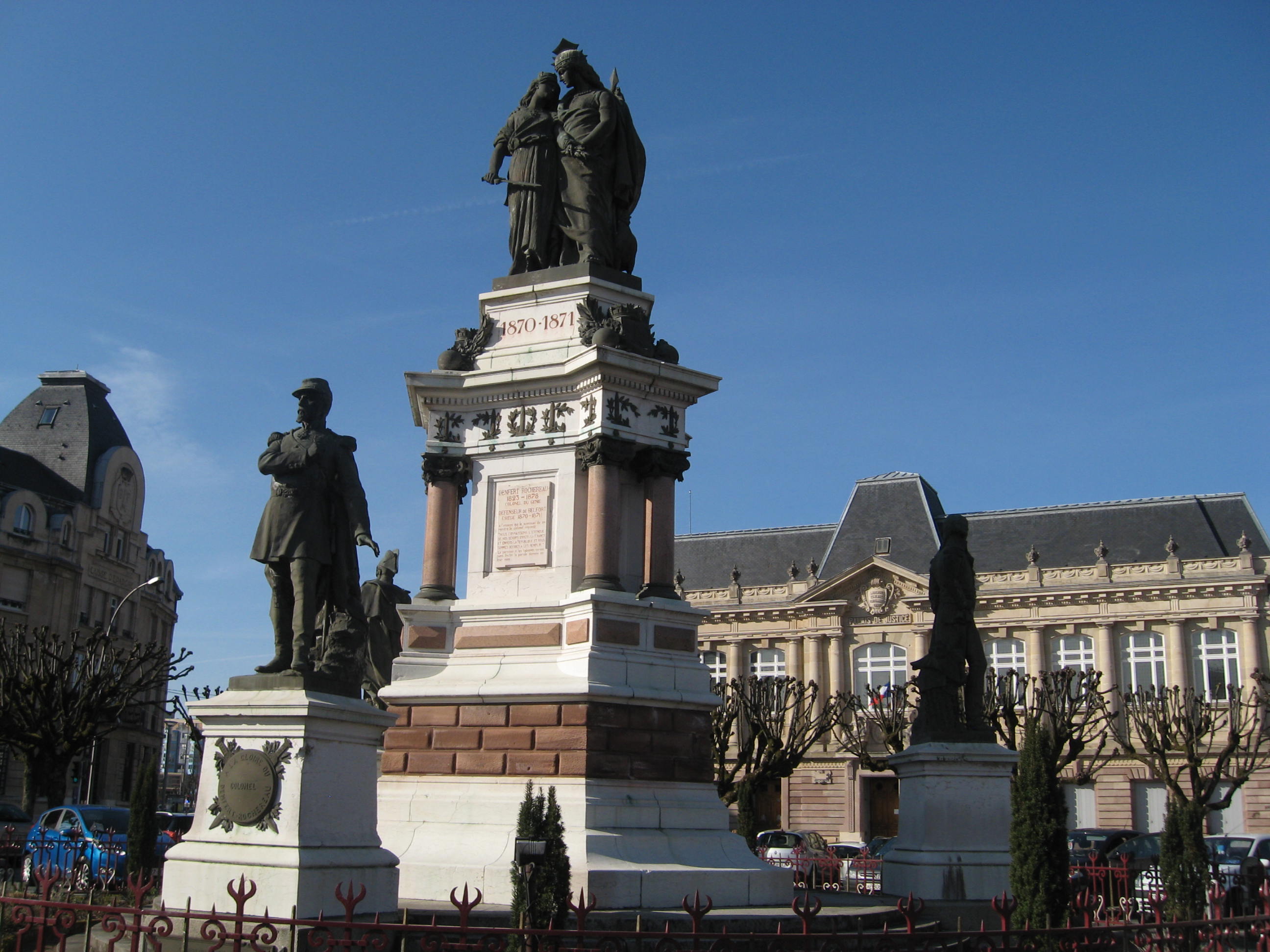 Vous arrivez désormais place de la République : en travaux d’aménagement et de végétalisation à l’heure de l’écriture de cet article, elle permet en temps normal de déambuler autour du monument central de la place, le « Monument des trois sièges », communément dénommé par les Belfortains « le Monument des trois menteurs ». Pourquoi ? Car cette statue représente les trois défenseurs des trois sièges de Belfort du XIXe siècle, et que le général Legrand « est la statue la plus petite », que le colonel Denfert-Rochereau « est en bronze » et que le général Lecourbe « est redressé » ! Cette œuvre est de Bartholdi, tout comme le Lion que vous pourrez admirer juste après… Retenez bien la date : elle date de 1901…