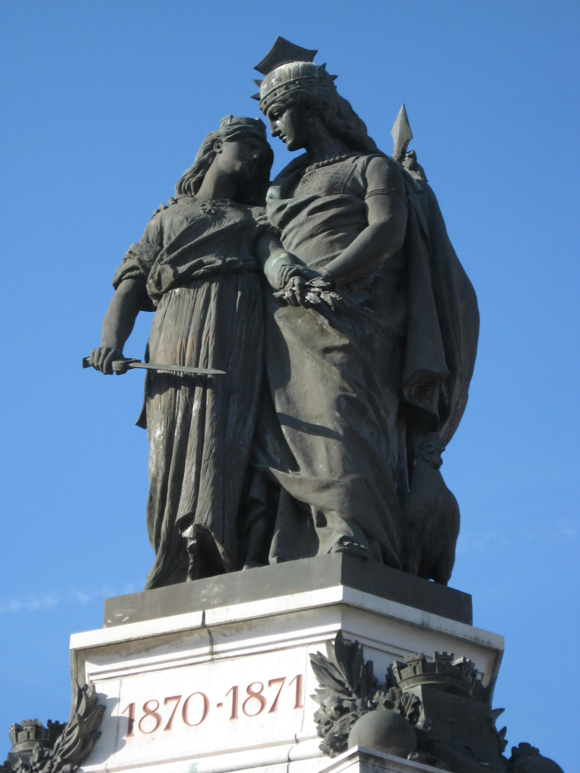Descendez et traversez la place jusqu’à la statue du monument « Quand Même » d’Antonin Mercier. Vous y verrez une belle alsacienne, en tenue folklorique de l’Alsace du nord (ça reste de l’art…), en train de soutenir un soldat de 1870 et de se saisir de son fusil pour continuer le combat « quand même », malgré la perte de l’Alsace et de la Moselle. Évidemment, l’œuvre n’a pas été trop appréciée lors de la livraison en 1884, et a passé quelques années dans les ateliers municipaux avant d’être exposée…!