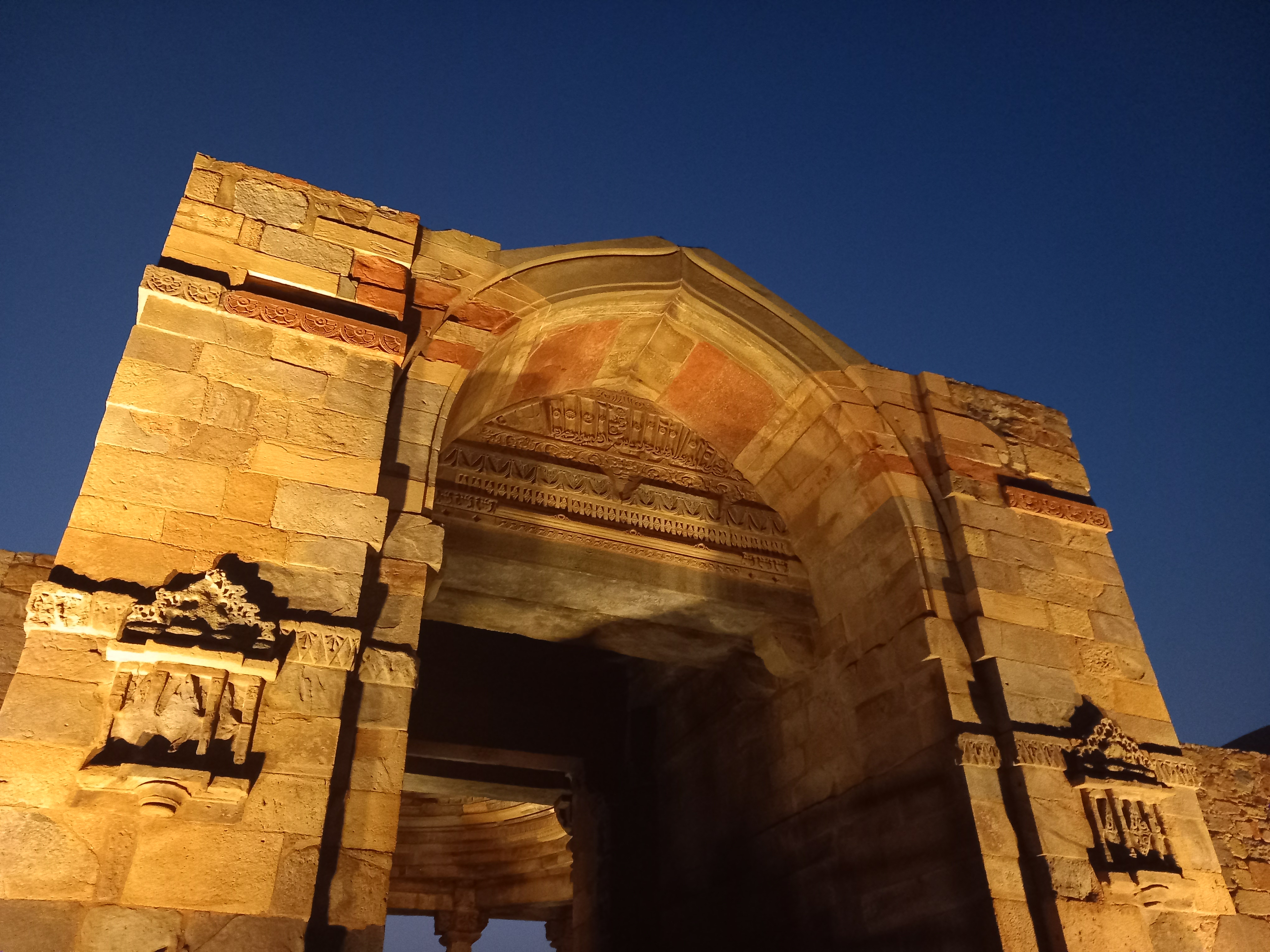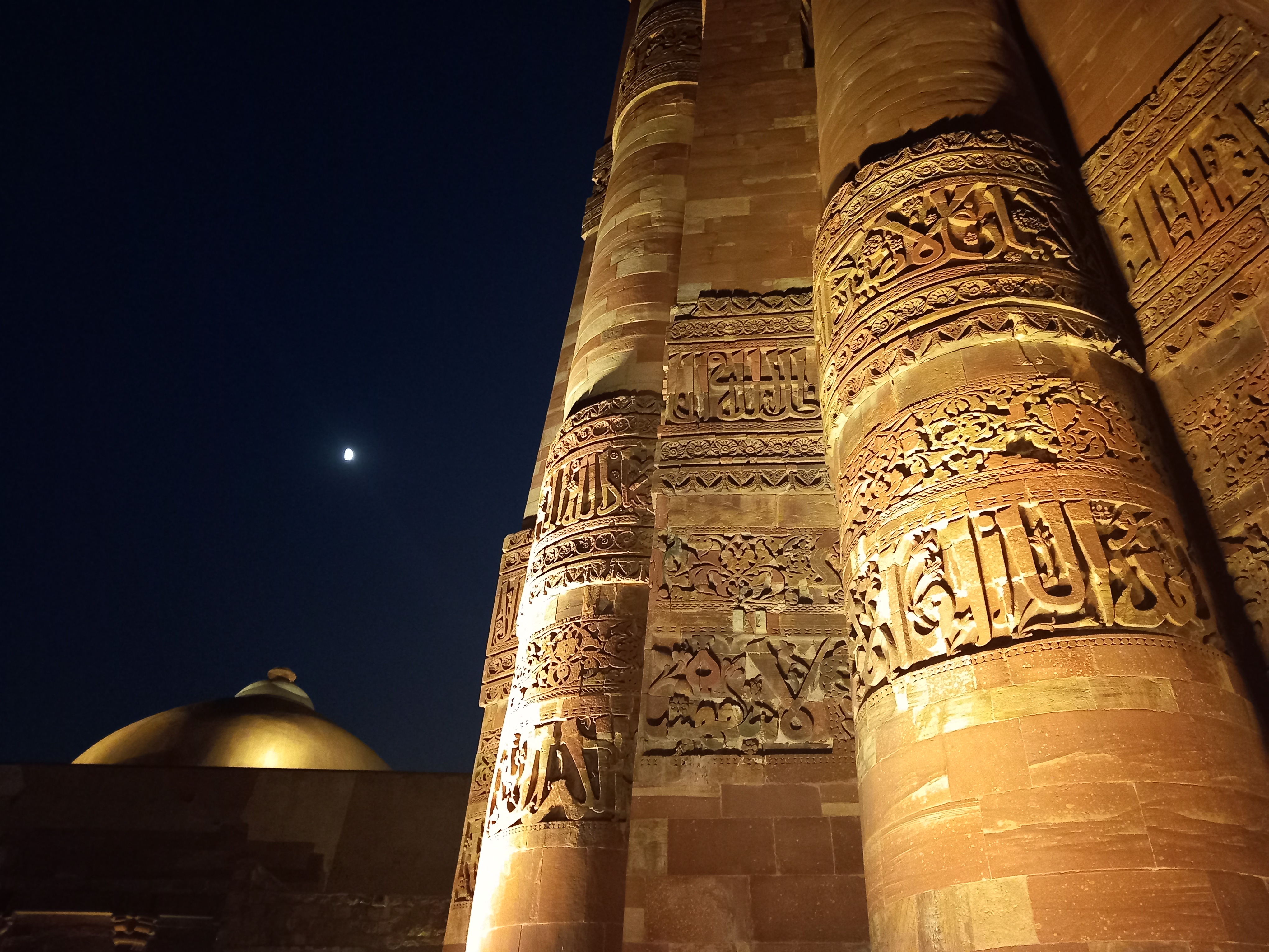 Le soleil se couche très rapidement, et à 18h il fait quasiment nuit noire : nous avons encore le temps de nous rendre au complexe Qutub. Là, nous déambulons dans une lumière rose orangée au sein de bâtiments absolument grandioses, dont le clou du spectacle est Qutub Minar, un minaret de 72 mètres de hauteur érigé entre 1199 et 1220, et qui est est encore parfaitement intact aujourd’hui.