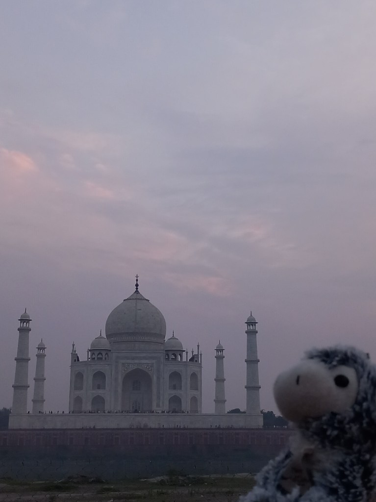 Nous avons en effet un timing très serré pour le dernier moment de la journée, l’admiration d’un monument très célèbre que nous avons déjà pu apercevoir depuis la terrasse du fort : j’ai nommé, le Taj Mahal ! Mais pour ce soir, ce sera depuis un jardin sur la rive opposée du fleuve, afin d’observer le coucher de soleil derrière le monument. Il y a peu de monde, nous avons le temps, l’ambiance est au calme, il y a des oiseaux et des papillons, et ce magnifique monument juste en face de nous depuis une face que nous lui connaissons moins (merci les photos internet toutes prises depuis le même angle !). Des feux de joie et de la musique sont visibles sur la berge d’en face, le mois est aux festivités religieuses et des cérémonies ont lieu un peu partout.