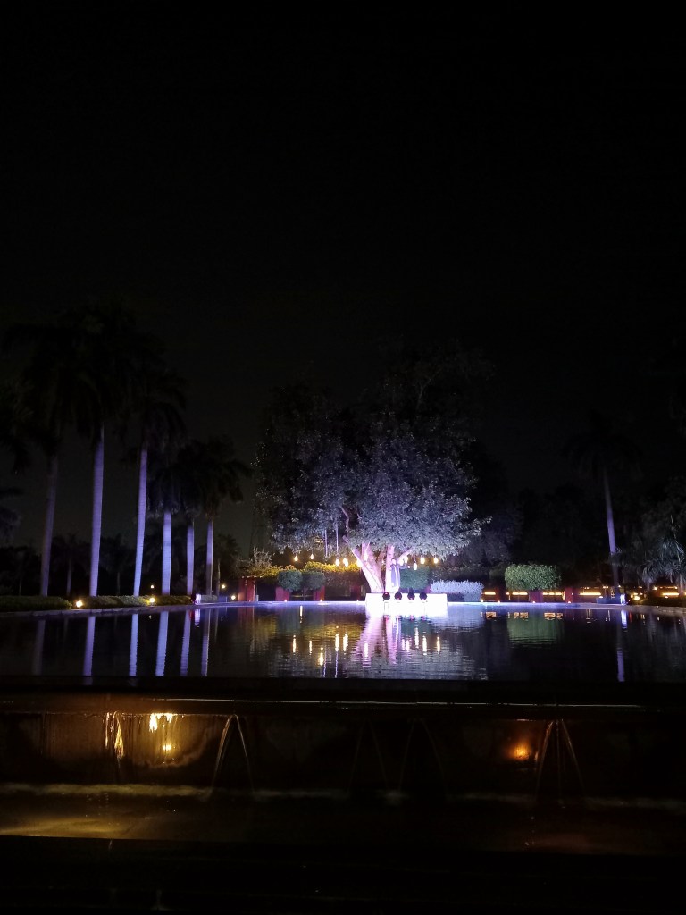 Et après ce moment enchanteur, nous sommes transportés à l’hôtel Jaypee Palace Hôtel Convention Centre Agra. Comment le nommer, à part en disant que ce lieu est absolument magnifique et juste GIGANTESQUE ! Nous nous sommes d’ailleurs perdus plusieurs fois en tentant de rejoindre un lieu, et notamment la piscine de l’hôtel où nous découvrons depuis une fenêtre qu’un spectacle de danse indienne est en cours. 20 minutes plus tard minimum, le temps d’attraper au vol d’autres touristes de notre groupe, et nous nous installons face à ce joli spectacle musical, gin tonic local à la main !