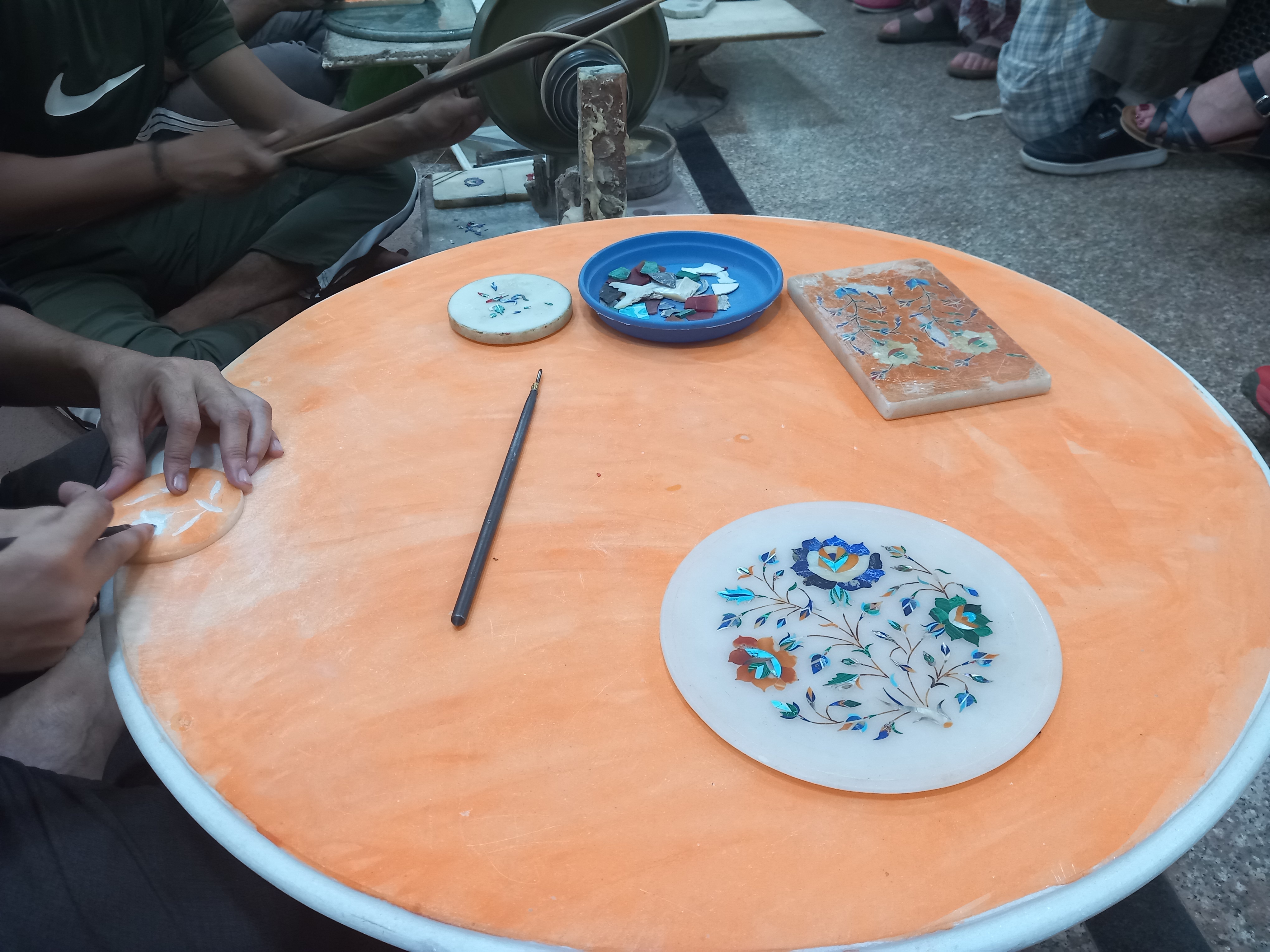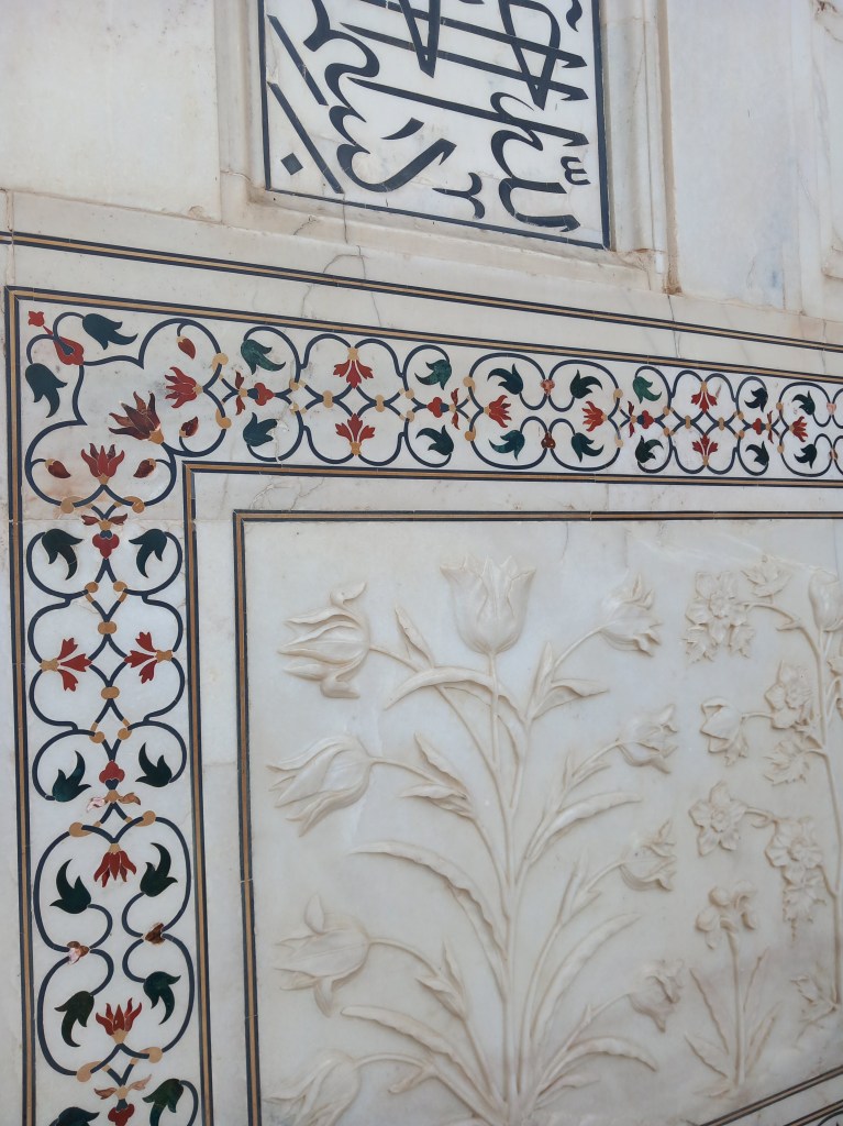 Après un petit passage par le petit-déjeuner de l’hôtel (absolument sublime, mettant en avant les produits d’Agra, on a dévalisé le stand « local » et bu des litres de thé massala !), le guide nous propose de nous rendre dans un atelier de marbrerie, dont les artisans sont les descendants de ceux ayant réalisé les marbres du Taj Mahal. On nous présente le matériel traditionnel, les pierres précieuses utilisées, la technique d’incrustation dans le marbre… Très intéressant, bien que le but de l’opération soit de nous diriger subtilement vers la boutique ! Nous craquons d’ailleurs ici sur ce qui sera notre souvenir de voyage, un bougeoir en marbre avec fleurs en incrustations, pour les longues soirées d’hiver…