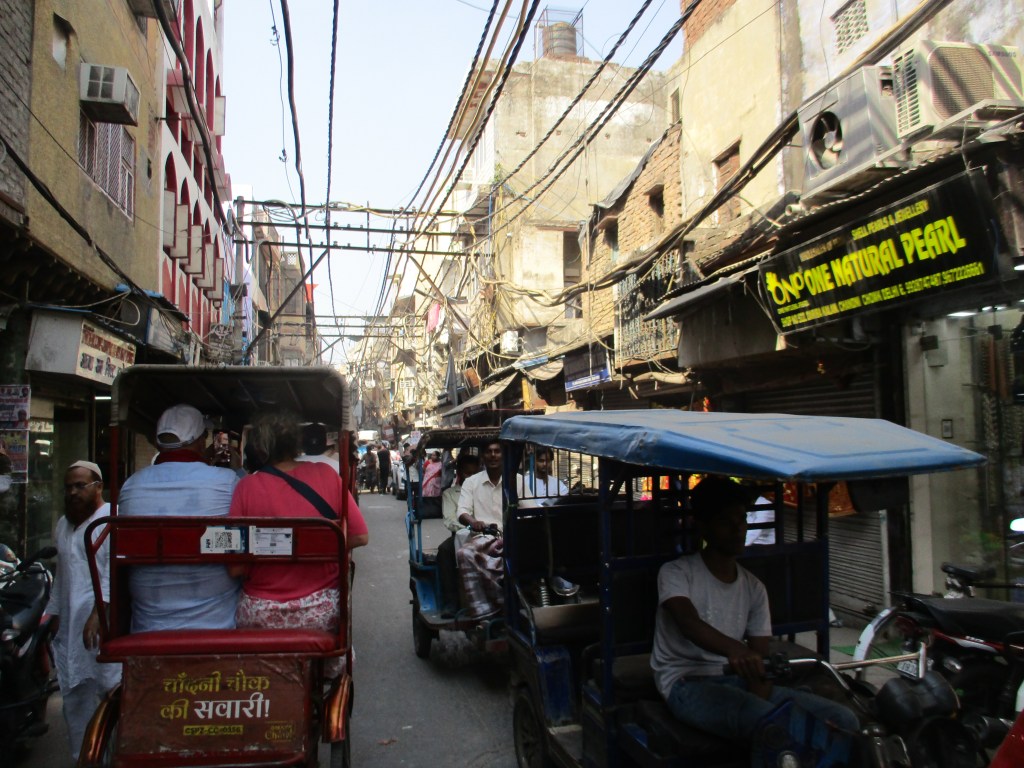 La visite de la mosquée se cantonne aux espaces extérieurs, l’intérieur étant réservé à la prière ; nous quittons donc assez rapidement le lieu afin de rejoindre les rues marchandes situées en contrebas de l’édifice. Là, le guide nous a préparé une petite expérience : un tour en Rickshaw au cœur des rues commerçantes ! Nous visitons donc une partie de la zone de manière accélérée avec ce curieux moyen de transport bien pratique au regard de l’étroitesse des rues, et qui nous permet de rejoindre une grande artère commerçante très rapidement. Comme je l’expliquais en introduction, c’est notre premier voyage en Asie, et nous sommes absolument subjugués par la foule grouillante (mais très posée) qui circule en flot continu tout autour de nous… ainsi que par le bruit très intense de la circulation et des klaxons !