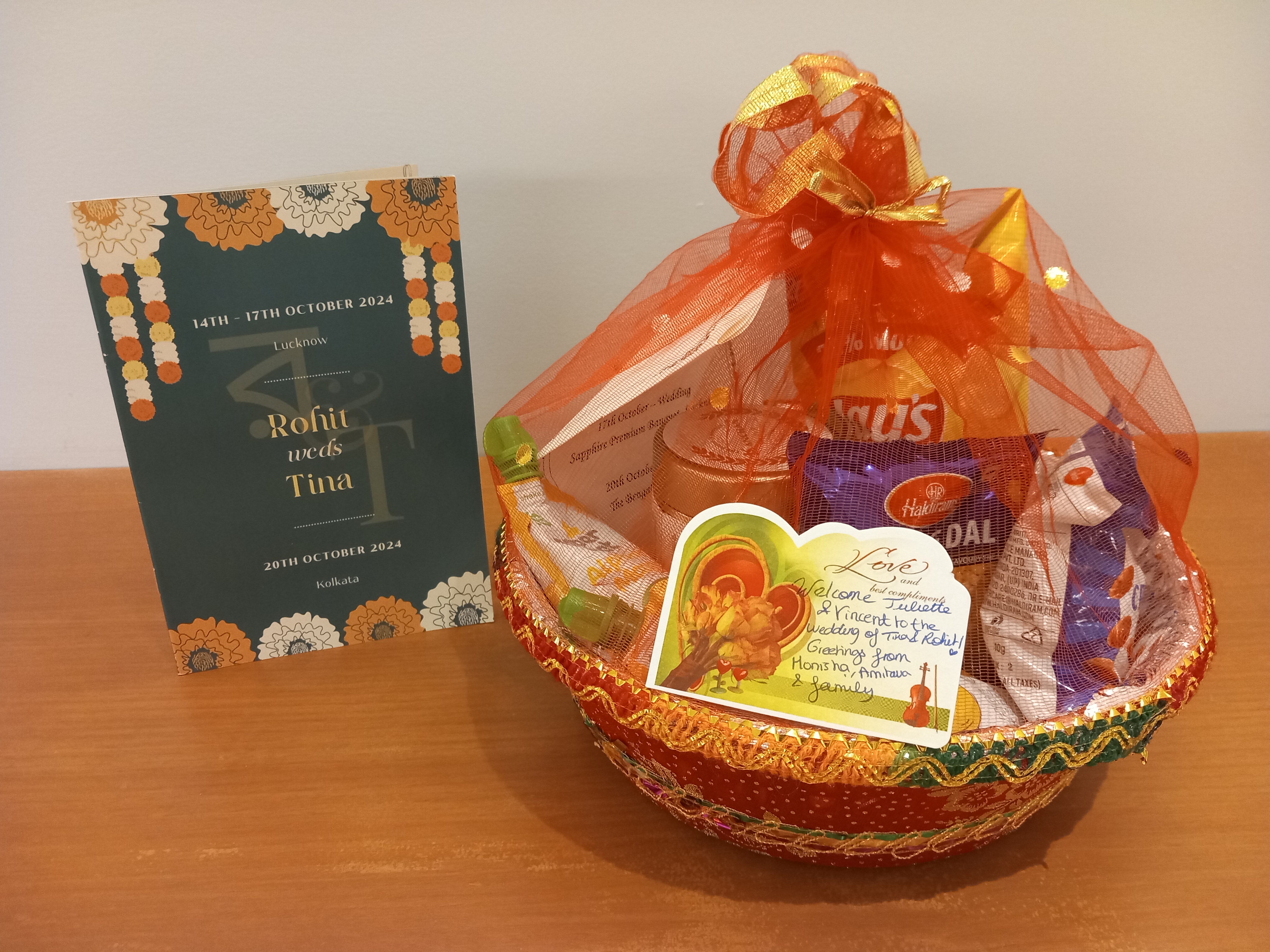 Petit plus : la famille du marié nous a déposé un cadeau, un joli panier garni de bienvenue, qui nous fait très plaisir et nous intègre dès à présent dans l’ambiance « mariage » ! De même, nous recevons un joli fascicule nous décrivant l’intégralité des cérémonies que nous allons vivre, dans un anglais parfait, un plaisir pour se préparer aux bons moments à venir.