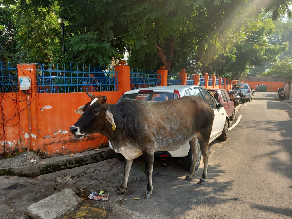 Une fois l’installation de la chambre faite (nous pouvons cette fois déballer la valise, nous restons quatre nuits) et l’électricité maitrisée (avec l’aide d’un groom passant dans le couloir qui a tout autant galéré que nous à gérer les va-et-vient des prises !), nous filons immédiatement vers l’extérieur afin d’apprivoiser notre environnement proche. Nous apprenons par la suite qu’un message avait été diffusé via le réseau WhatsApp nous incitant à la prudence et nous recommandant même de ne pas quitter l’hôtel : n’étant pas des plus connectés quand nous sommes en voyage, nous n’avons pas pu tenir compte de cette information… et tant mieux ! Car le quartier est tout ce qu’il y a de correct et nous nous sentirons parfaitement en sécurité durant l’ensemble de notre séjour dans cette ville. Mais là encore, comme abordé dans l’article précédent, la notion de responsabilité est très forte en Inde, et nos hôtes ne veulent surtout pas que nous subissions un quelconque souci durant notre séjour dans leur ville.