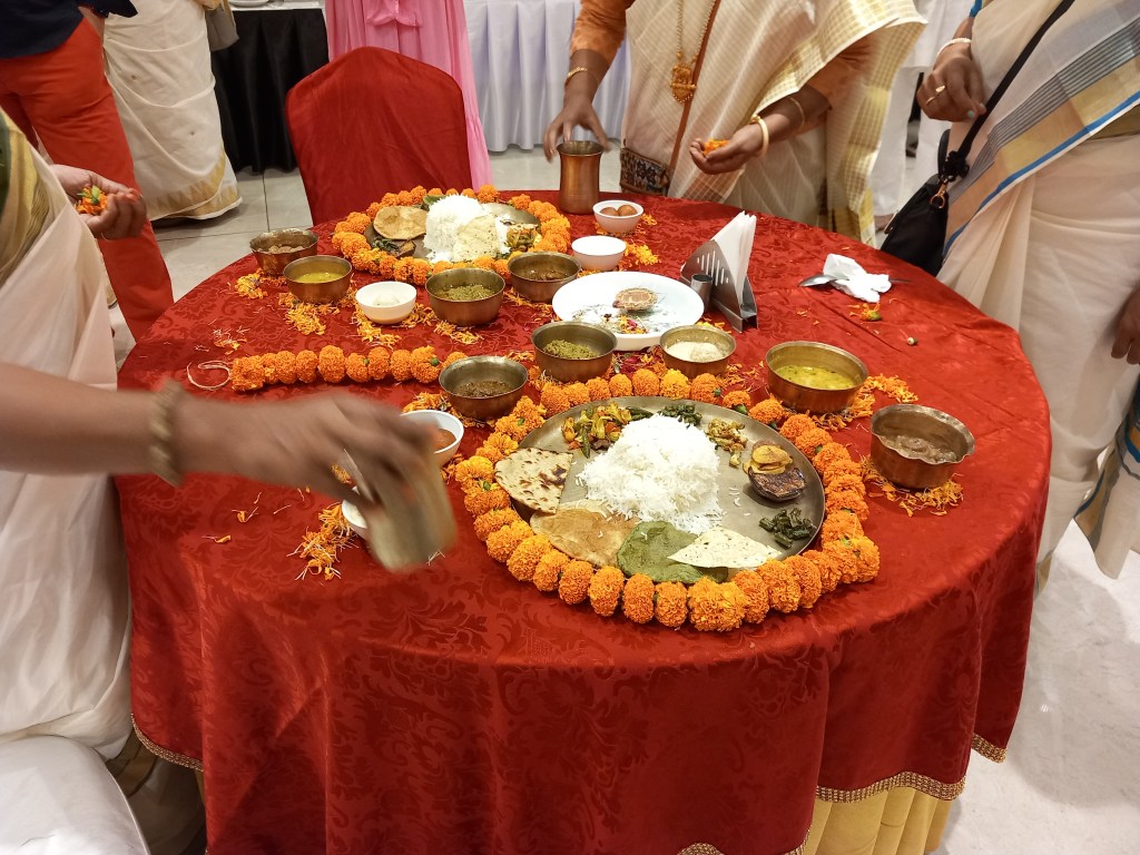 La deuxième cérémonie à laquelle nous assistons est celle de l’Aiburo Bhaat : une table comportant de nombreux plats est dressée en parallèle de la première cérémonie, et les futurs époux y sont nourris par leurs parents, chacun donnant une cuillère dans la bouche de son enfant ! Le repas est ensuite partagé avec les personnes « non mariées », qui sont ici des membres de la famille ou des amis proches, idem, toujours pas de cérémonial strict (du moins en apparence du côté du public !). Pendant ce temps là, le reste des convives (dont nous faisons partie) se servent à un magnifique buffet proposant de multiples plats, s’installent à une table, se relèvent, s’installent ailleurs… Une autre manière de manger que celle dont nous avons l’habitude en France, et qui s’avère parfaitement convivial puisqu’elle permet de discuter avec des personnes différentes.