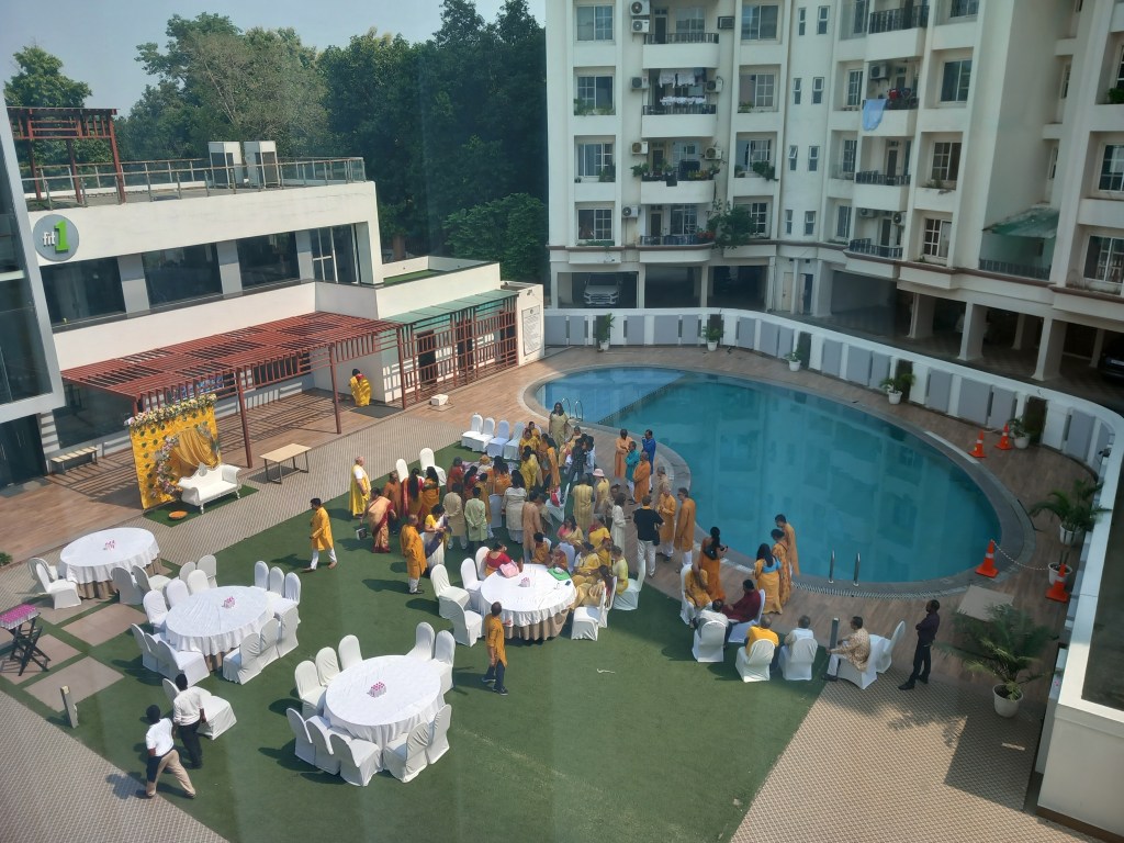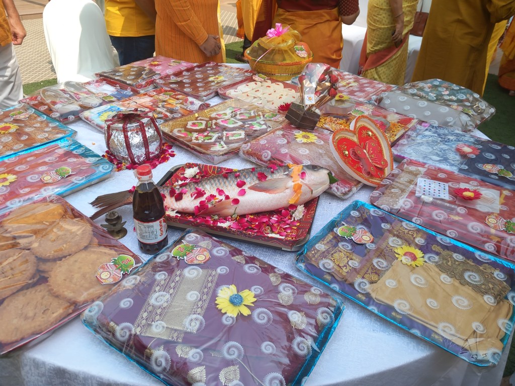 Les rites sont très codifiés et font participer l’ensemble de la famille des futurs époux. Nous assistons donc d’abord à la cérémonie d’Ashirbaad, qui consiste en la bénédiction réciproque des aînés de chaque famille et des fiancés : les premiers posent leur main sur la tête des seconds, et ces derniers touchent les genoux et les pieds de leurs ancêtres (au sens large, allant des grandes tantes aux grands-parents et aux parents). Le moment est joyeux, pas du tout guindé ou procédurier comme on aurait pu penser à la lecture des descriptifs des cérémonies, c’est un moment de fête et de discussion libre ou les convives déambulent, discutent, mangent des petits apéritifs régulièrement apportés par des serveurs…