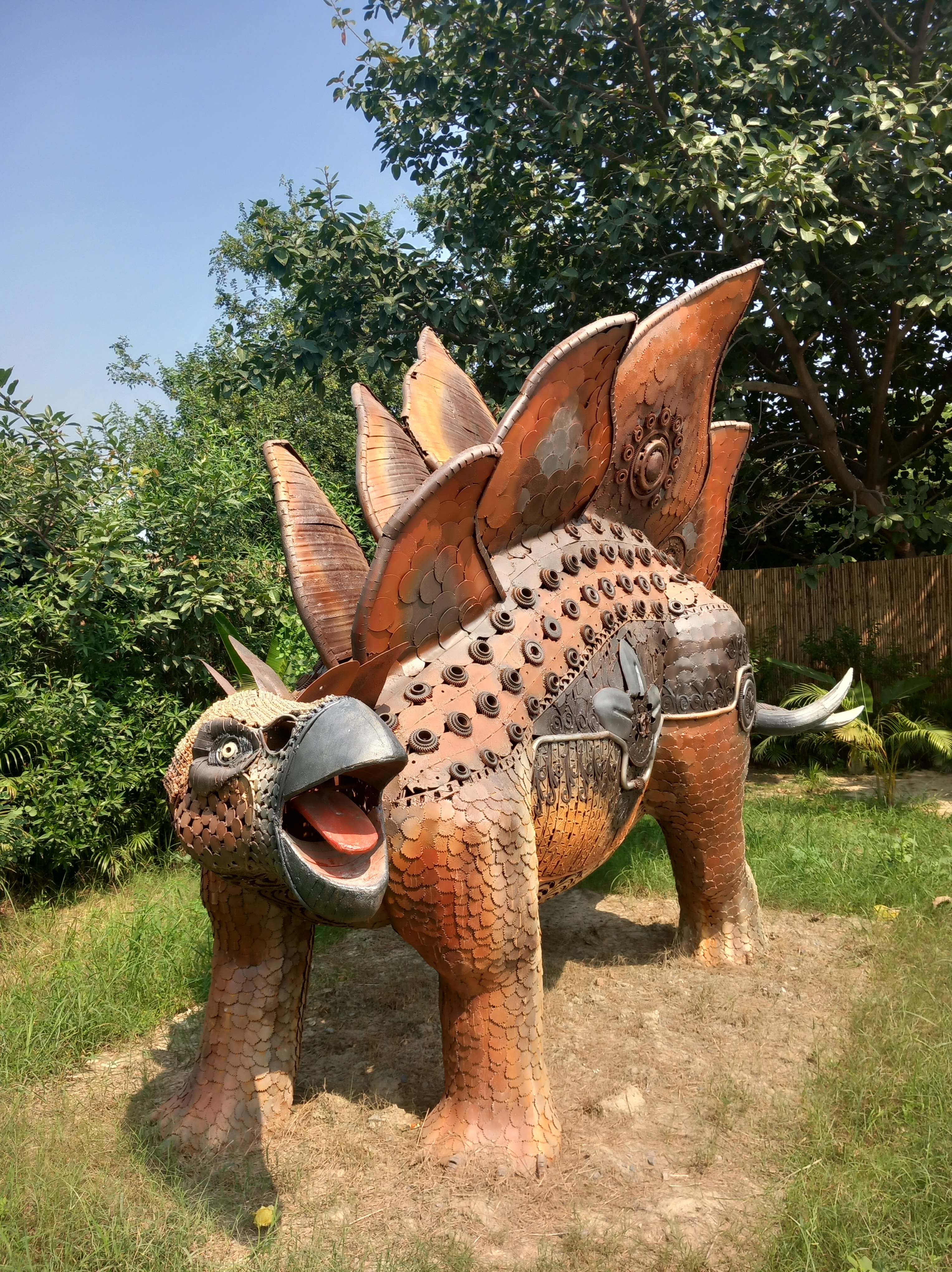 Nous découvrons toutefois, au hasard d’une allée, deux animaux insolites : deux ptérodactyles qui nous fixent depuis une immense porte qui ne nous est pas inconnue… Bienvenue à Jurassic Park, au cœur d’un parc municipal indien ! Nous allons donc tous admirer les dinosaures au fil d’un parcours franchement très bien conçu : les bêtes sont créées avec des éléments de moteurs recyclés, il y a des panneaux d’interprétation, même des écrans de TV selon les étapes, un coin restauration (où un Coca bien sucré s’avère être bienvenu)… et même un Tyrannosaurus Rex qui vient saluer les écoliers en visite !
