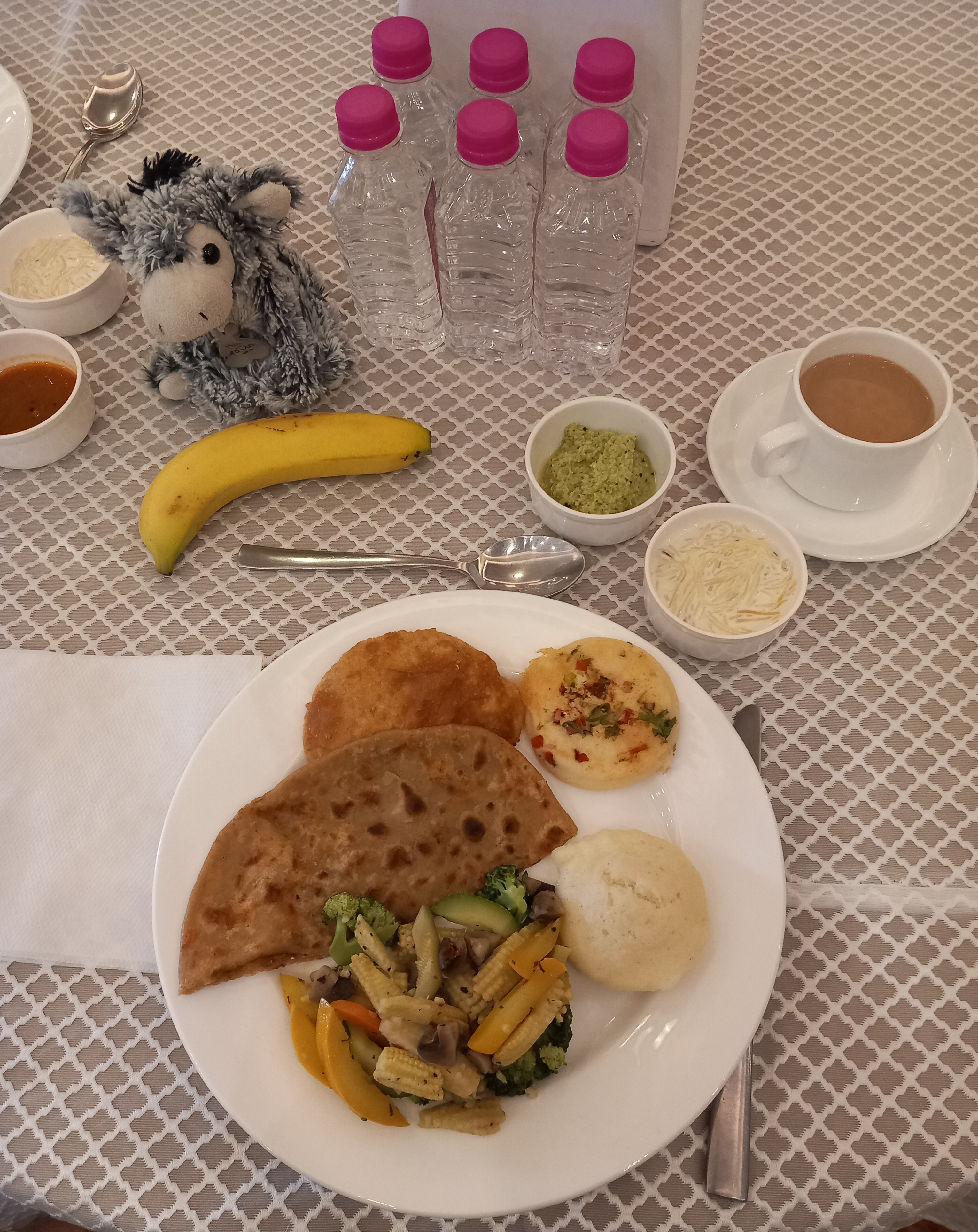 Le petit déjeuner est une étape très importante pour nous, d’autant plus quand nous savons que les journées vont être longues : nous découvrons donc le buffet avec grand plaisir, ce dernier offrant une thématique essentiellement « locale et salée » (avec très peu de plats dits « continentaux »). Nous nous gavons de Sambhar, une soupe épicée, et de galettes farcies aux légumes, tout en nous abreuvant de thé massala.