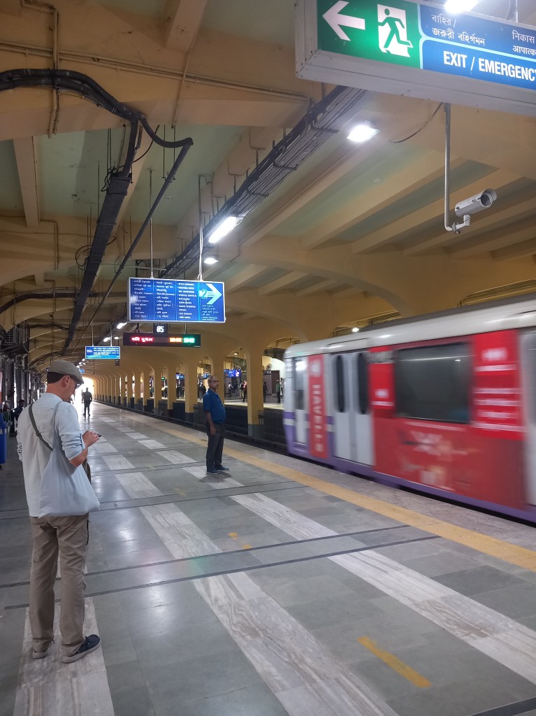 Notre voyage se poursuit, destination l’est du pays et la ville de Calcutta. Le trajet depuis Lucknow n’est pas bien long avec un vol intérieur, à peine plus d’une heure de temps… mais c’est sans compter le retard de plus de deux heures que nous allons subir, et donc l’attente de quasiment quatre heures dans l’aéroport. Impossible de « s’échapper » à l’extérieur pendant ce laps de temps, la mariée (qui prend alors le vol avec nous accompagnée de sa belle-famille) nous expliquant que les horaires sont fluctuants, et qu’une indication d’un départ retardé ne veut pas dire que nous ne serons pas tous appelés dans la demi-heure en mode « l’avion va partir quand même à l’heure dépêchez messieurs-dames ! ». Nous prenons donc notre mal en patience entre lecture, déambulation dans les commerces et papotage avec les copains alsaciens qui retournent sur Delhi et se sont finalement retrouvés dans le même hall de départ que nous. Nous recevons également un petit cadeau « pour patienter » de la part de la compagnie, composé de crackers divers et d’une bouteille d’eau : geste apprécié au regard de l’heure qui passe.