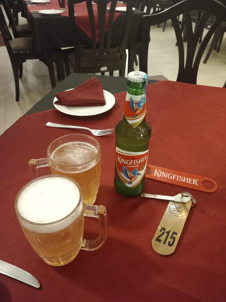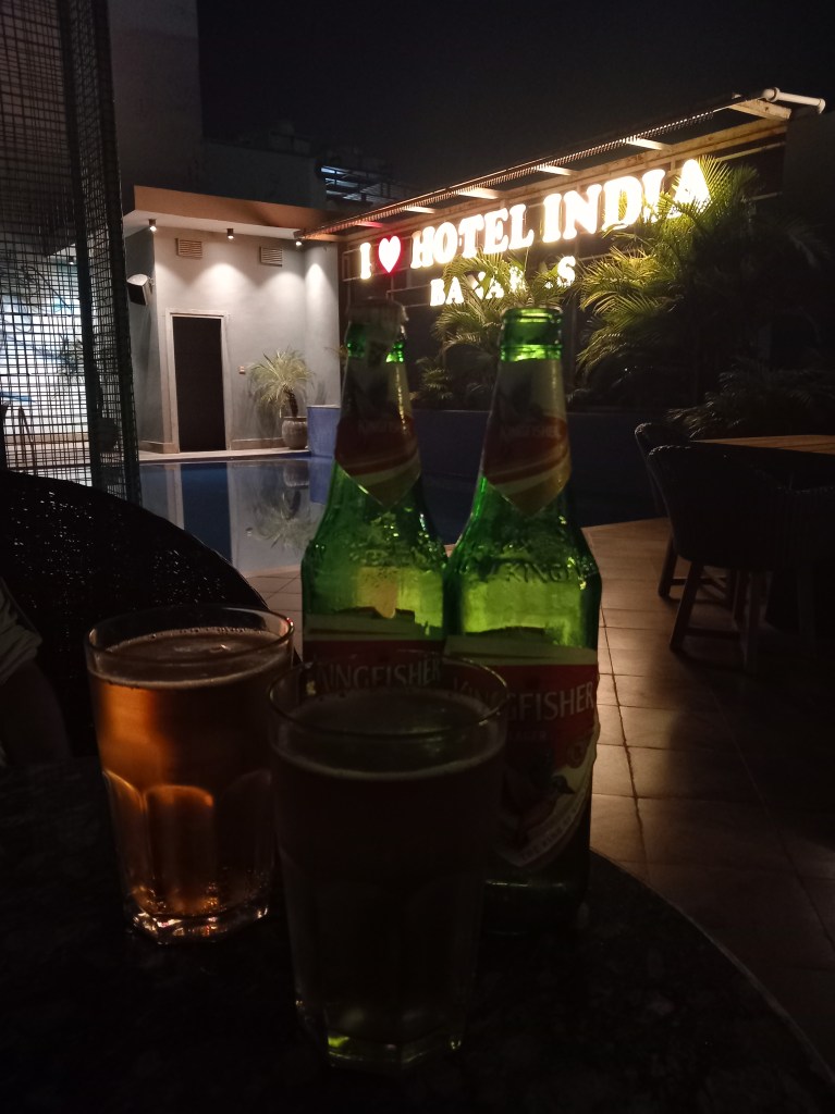 De retour à l’hôtel, mon regard est attiré par des palmiers sur le toit : s’agirait-il d’un Rooftop avec vue sur la ville ? Nous empruntons immédiatement les escaliers pour rejoindre le 4ème étage… qui s’avère être en réalité un bar ! Le dress code est sévère et non adapté aux touristes que nous sommes, mais un barman, nous voyant hésiter, vient nous ouvrir la porte : nous sommes seuls et bienvenus en ce lieu qui s’avère être tout à fait agréable, entre plantes exotiques, petits geckos au mur et tables le long d’une belle piscine. Nous n’aurions jamais deviné que ce lieu existait ! Notre dernière soirée à Varanasi se termine donc avec une bonne Kingfisher bien fraiche.