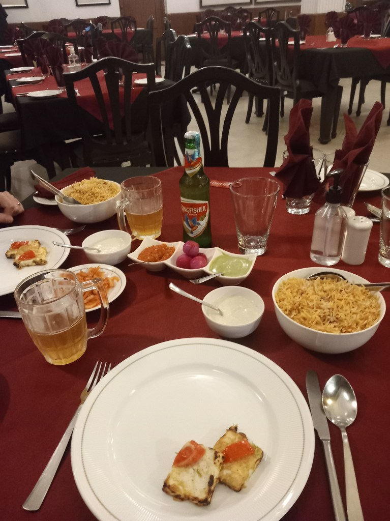 En effet, la sauce s’impose tout de même à tous les repas depuis plus d’une semaine, donnant à force un goût un peu similaire à tous les plats : après une petite entrée à partager faite de fromage mariné (j’ai dû en manger des kg durant ce séjour, c’est mon coup de cœur culinaire), nous avons l’occasion de goûter un plat traditionnel de Kolkata à base de poulet ou de mouton (pour une fois qu’on mange de la viande, on prend le plus local possible) dans du riz parfumé aux épices. Un régal, il n’y a pas d’autres mots. Et idem pour les desserts, nous essayons des spécialités locales qui sont juste fabuleuses. Nous terminons la journée sur un banc au bord du terrain de golf, un gin tonic local à la main. Quoi de mieux ?