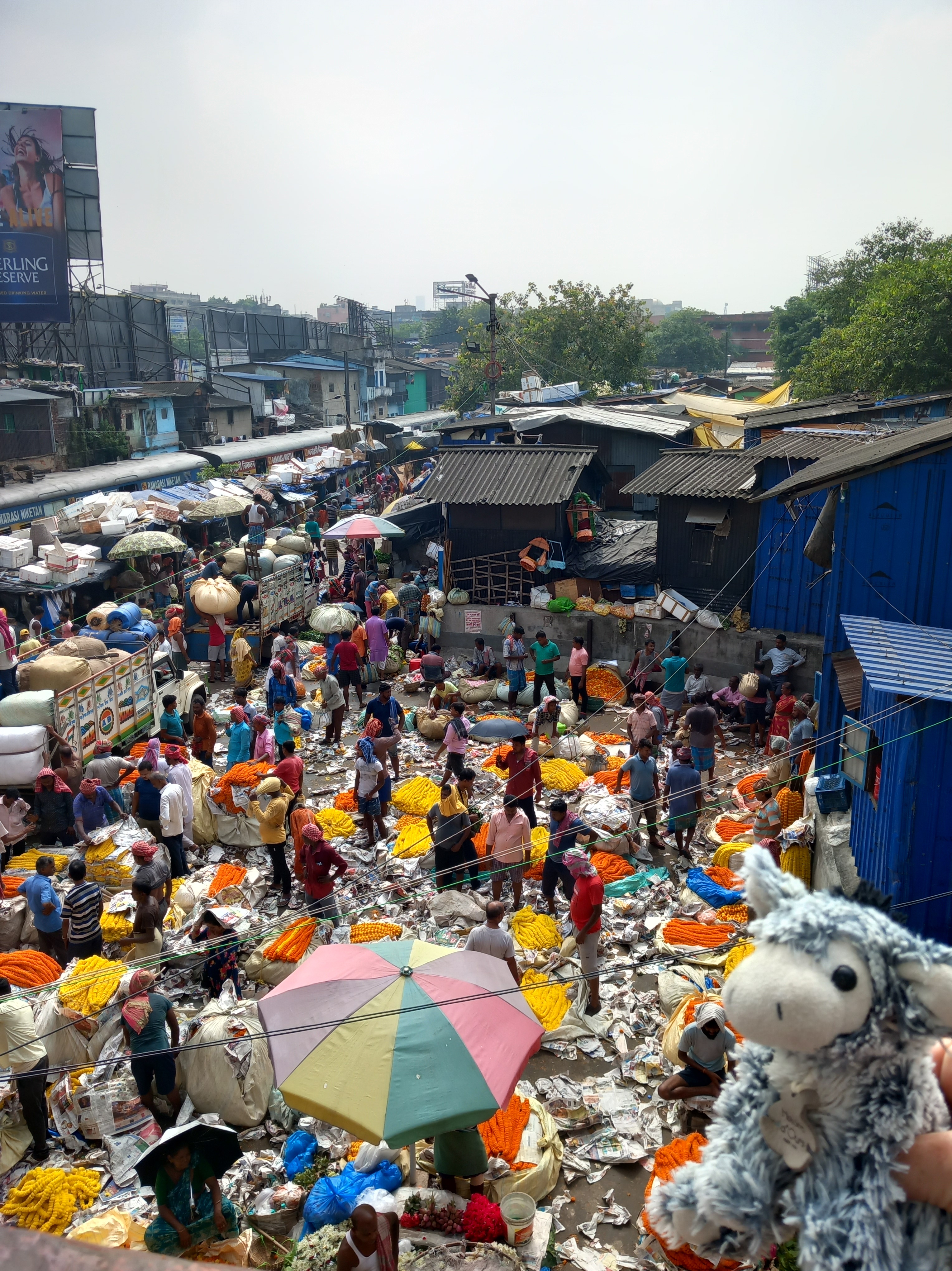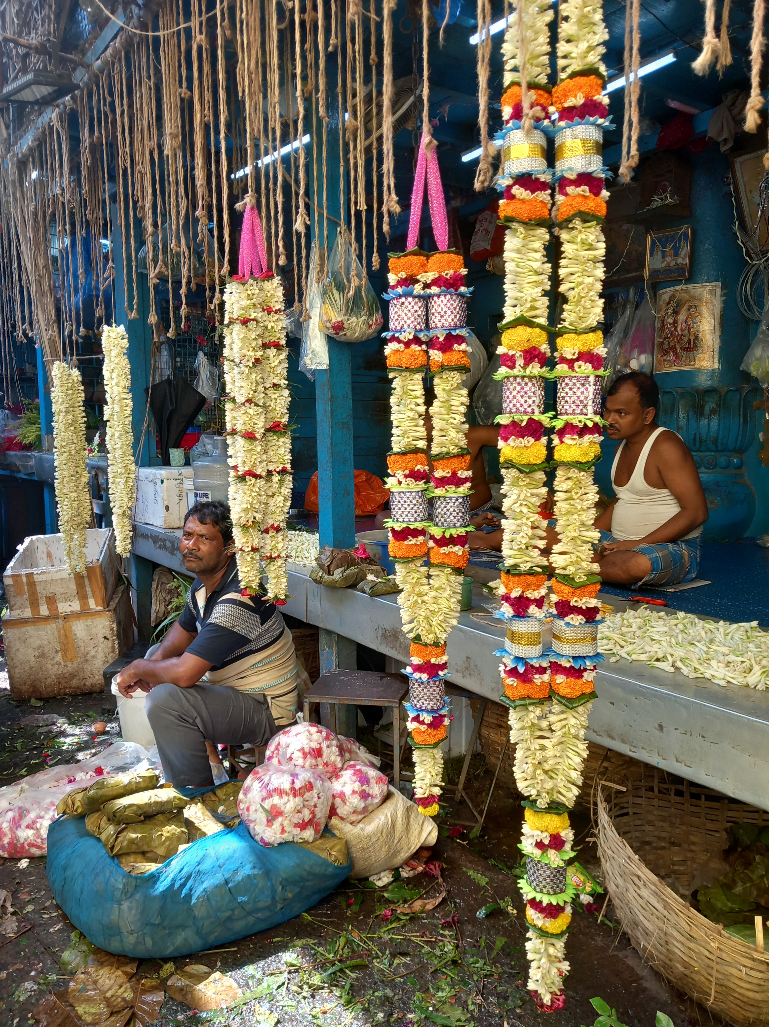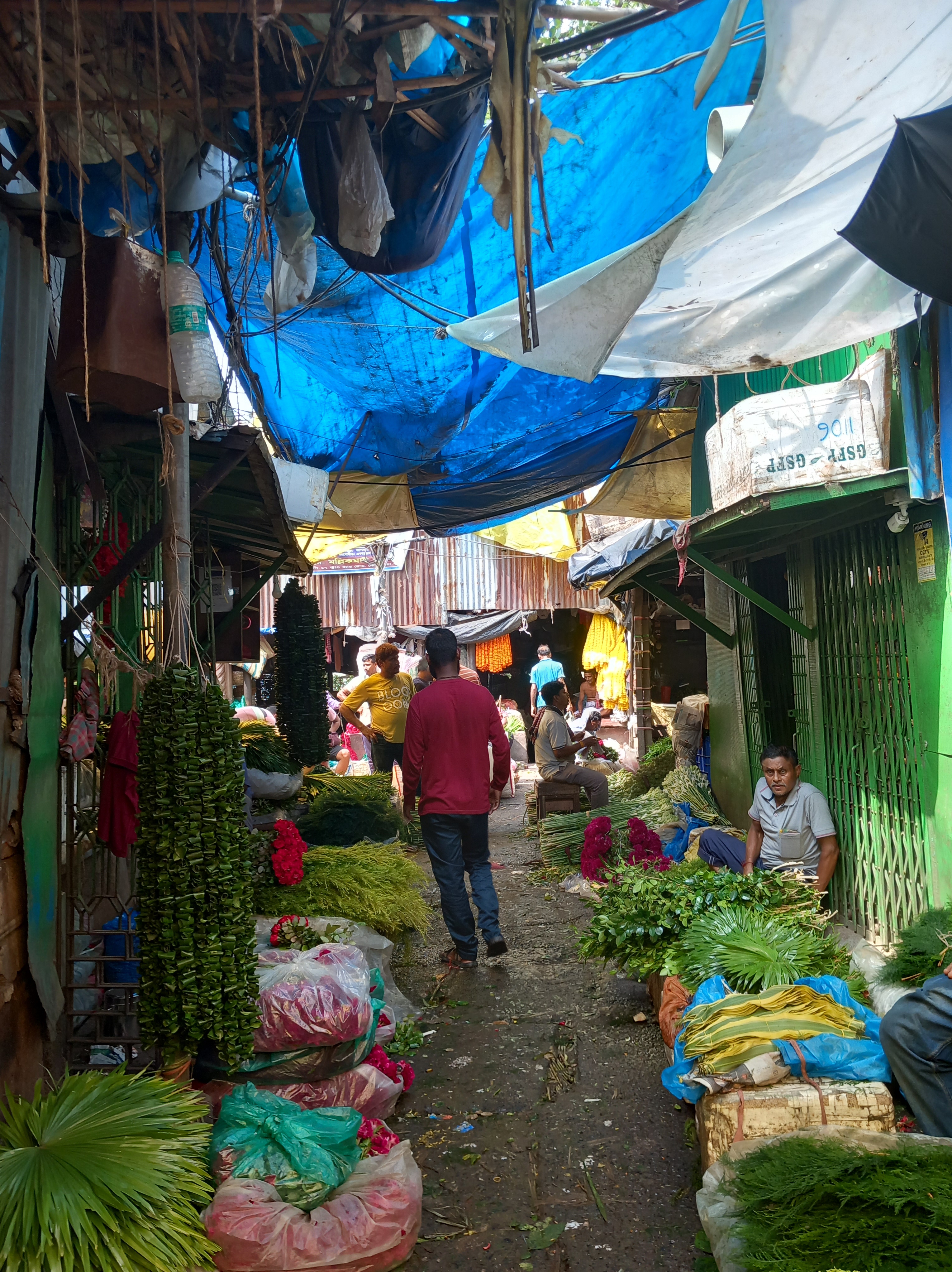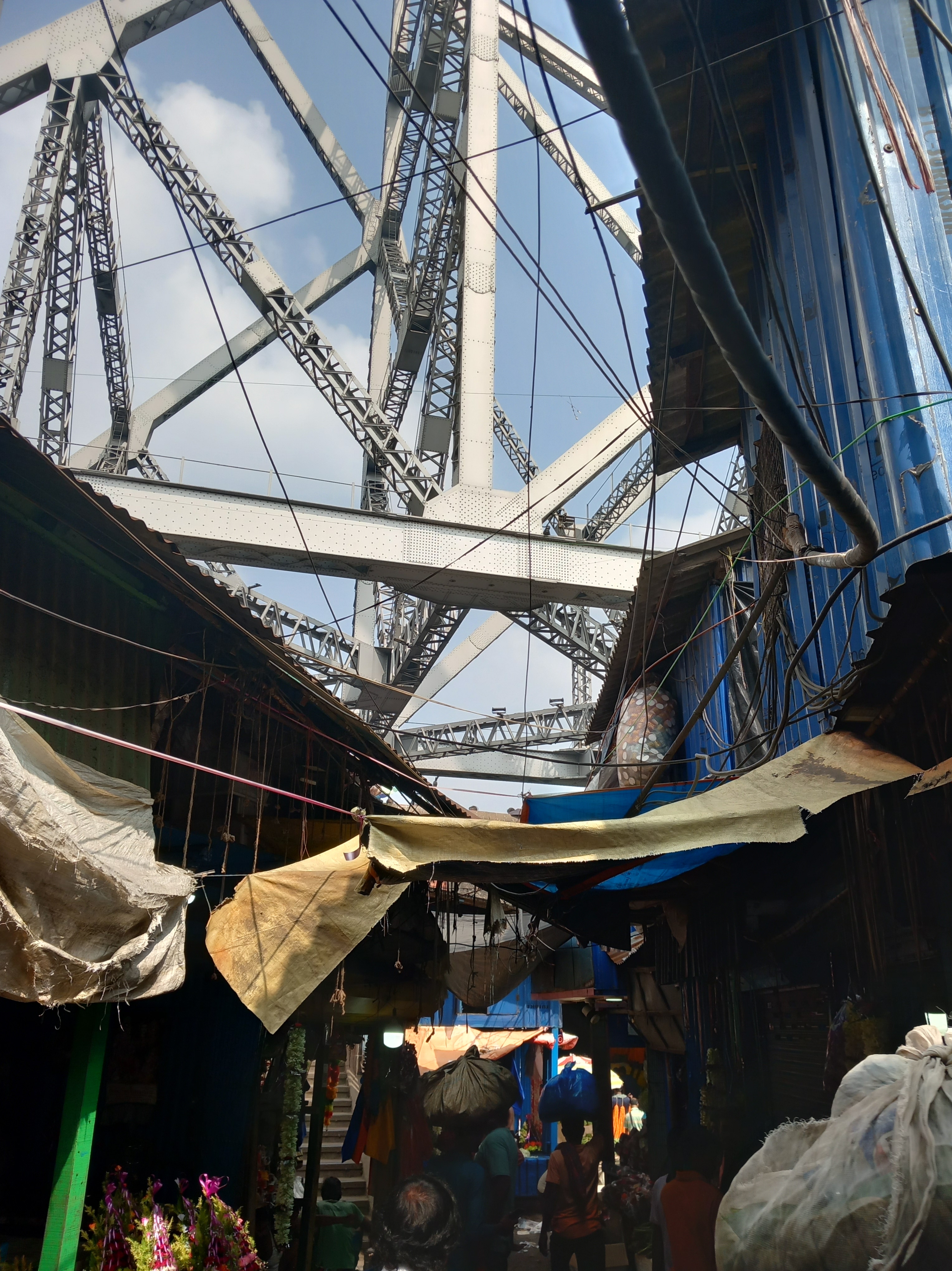 Cette nouvelle journée est cette fois-ci dédiée aux visites guidées organisées, et nous débutons par une expérience assez marquante pour nous dire que la présence d’un guide était indispensable sur ce coup-là ! J’ai nommé : le marché aux fleurs de Howrah. Après une petite marche sur le pont en acier de Howrah, lequel compte parmi les six plus grands ponts de ce style au monde (et sur lequel il est interdit de s’arrêter en tant que piéton, sans doute pour éviter l’effet d’engorgement), nous descendons déambuler au cœur des stands qui s’organisent de manière quasi labyrinthique sur des centaines de mètres de distance. Dans la plupart des secteurs, on ne voit même plus le ciel tant les tentures, les fleurs séchées et les auvents des maisonnettes dans lesquelles les vendeurs vivent au-dessus de leur commerces occultent la lumière du jour.