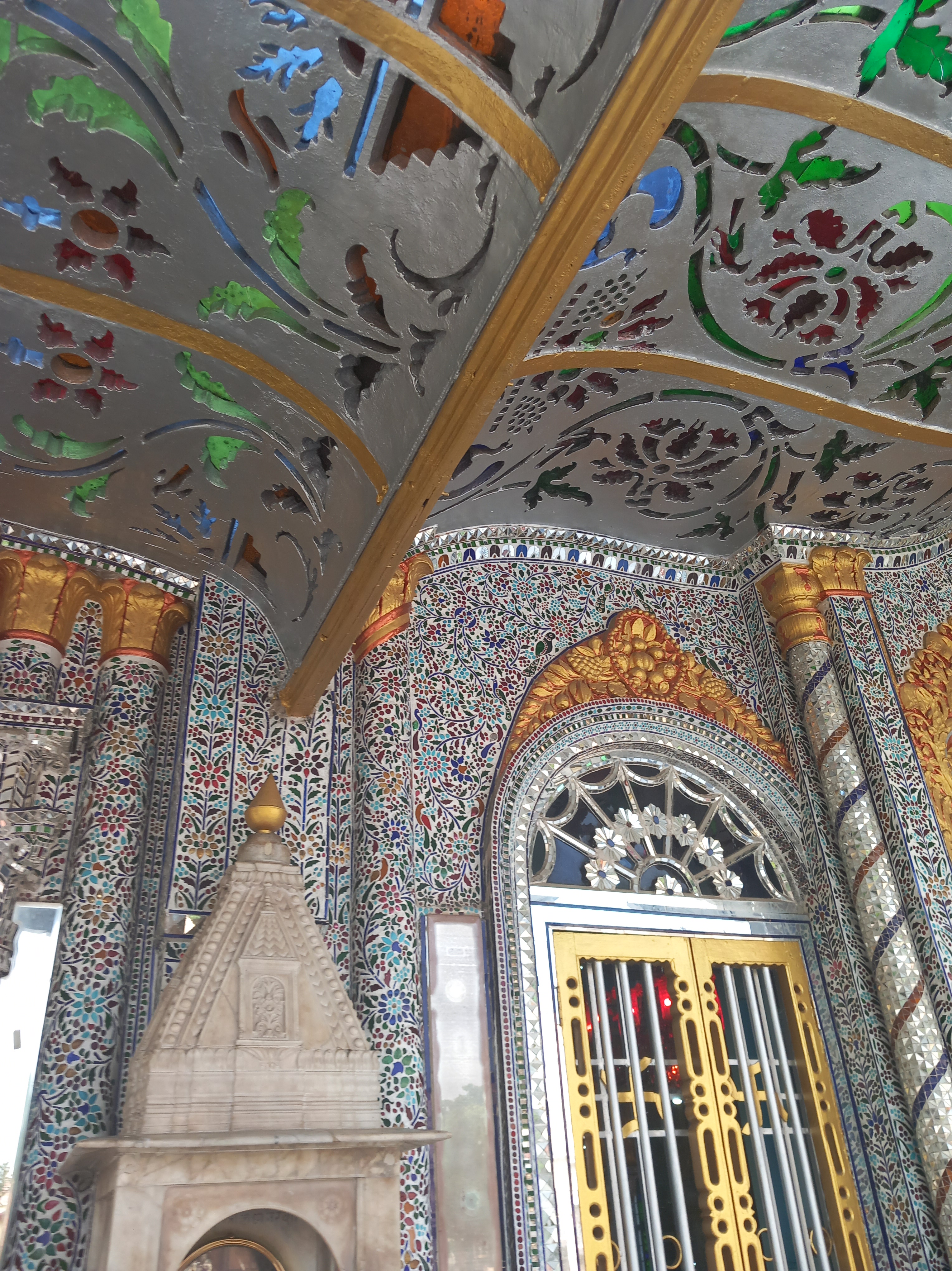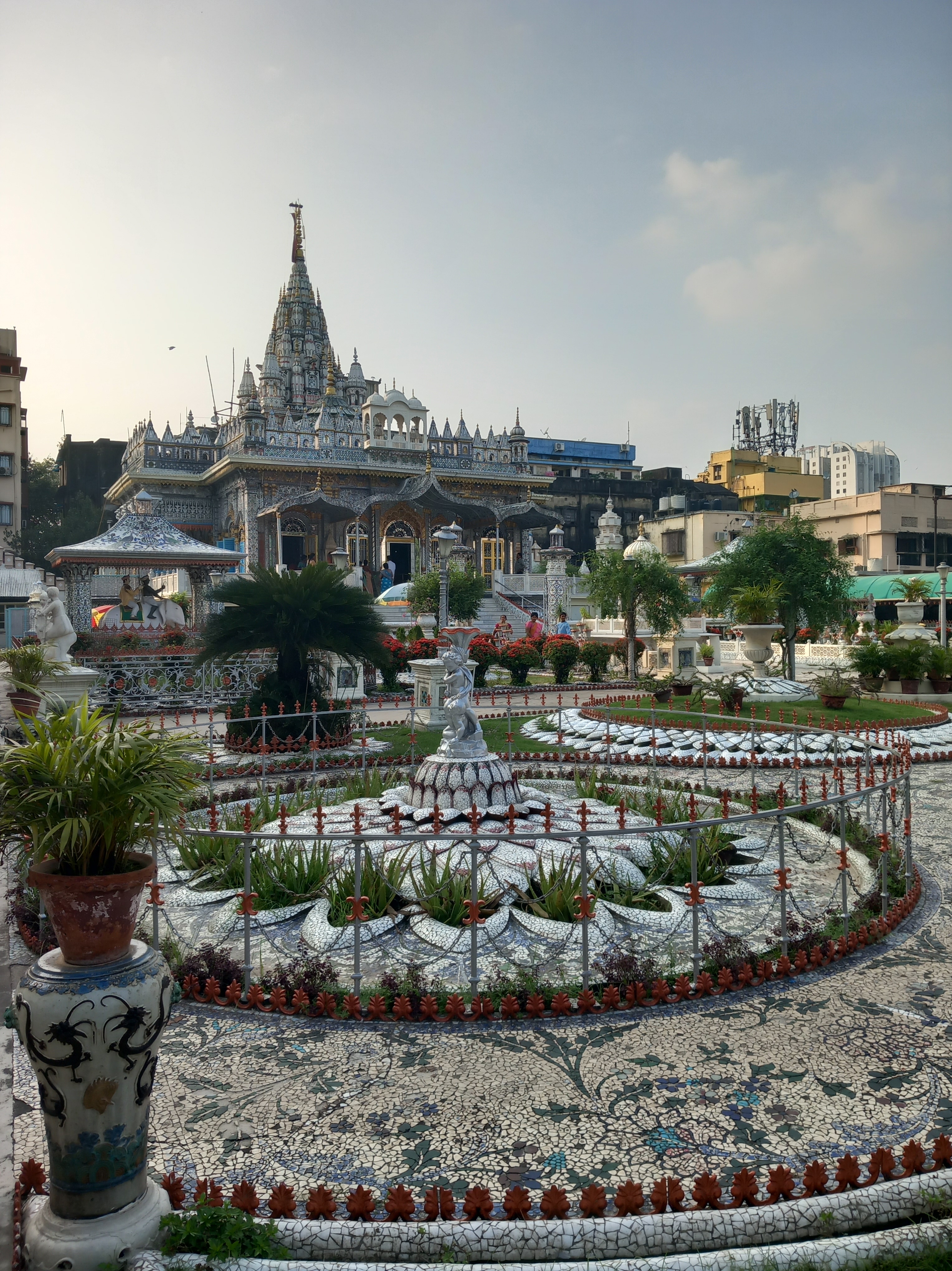 Direction donc le Parashnath Jain Temple, absolument splendide. Bâti en 1867 par un bijoutier, il est dédié à Parashwanath, grand maître jaïn. Le style des bâtiments est incroyable, on a des miroirs, de la mosaïque, du marbre, des incrustations de fleurs comme au Taj Mahal (on connait maintenant la technique de fabrication) et même du verre de Murano ! Nous pouvons pénétrer dans le temple principal afin d’en admirer le hall d’entrée, dont pas un centimètre carré n’est pas recouvert de décorations, une vue incroyable… mais un peu rapide, on aurait pu y rester au moins une heure de plus pour en admirer les détails si le guide n’avait pas sonné le retrait de manière assez brusque… Avantage des visites guidées : pouvoir visiter de tels lieux ; inconvénient : ne pas pouvoir en profiter comme on le voudrait.
