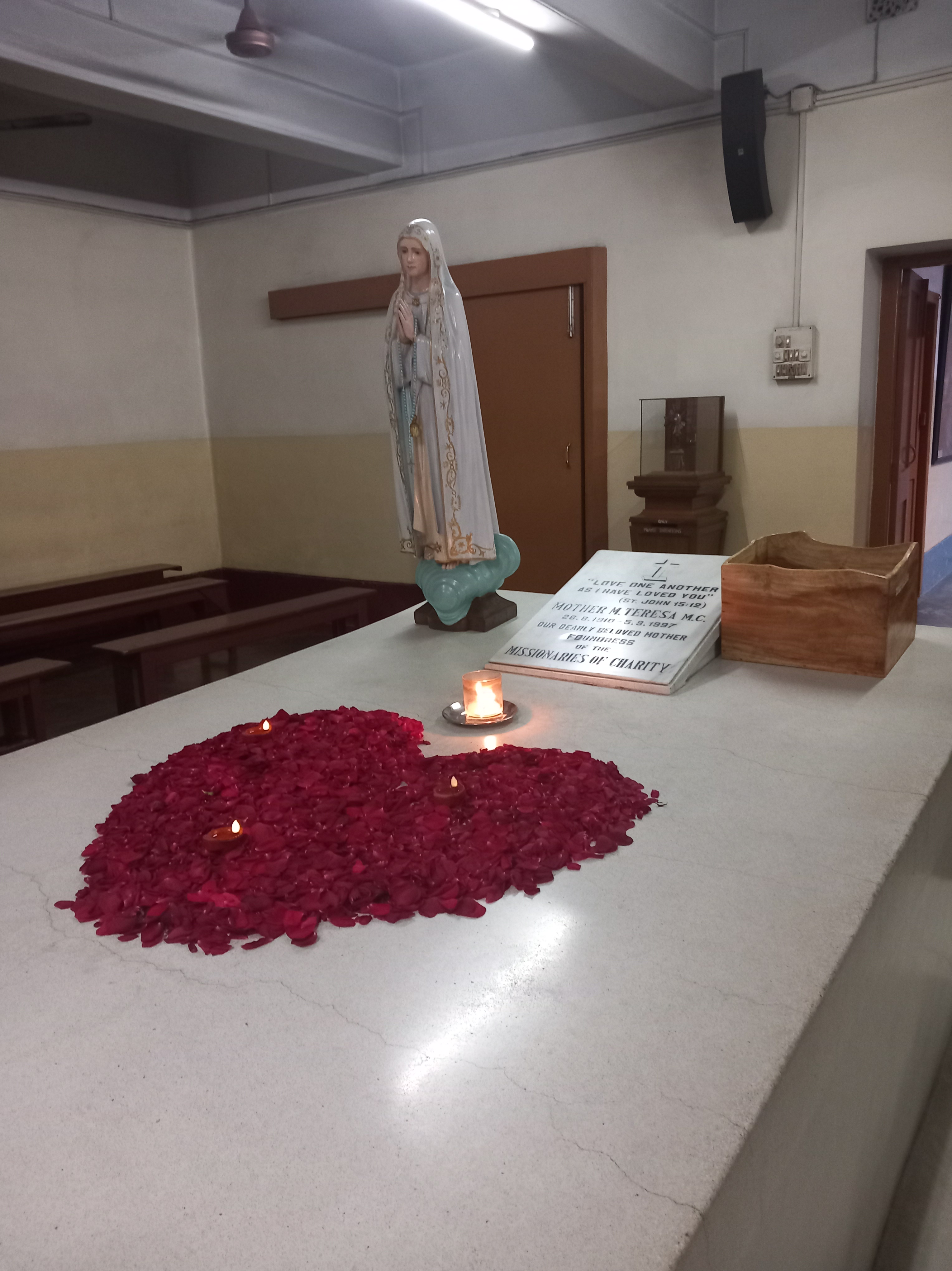 L’avant-dernier lieu de la journée reste sur la thématique religieuse, mais plus cette fois dans notre culture européenne classique : nous nous rendons dans le dispensaire de Mère Teresa afin de voir sa cellule et sa sépulture. Une petite exposition présentant des photos d’archives et des objets se tient mitoyenne à la tombe sur laquelle de nombreuses personnes viennent prier. Le lieu est toujours en activité, et la partie « touristique » est bien isolée de la partie « lieu de vie et de travail » des sœurs que l’on aperçoit brièvement.
