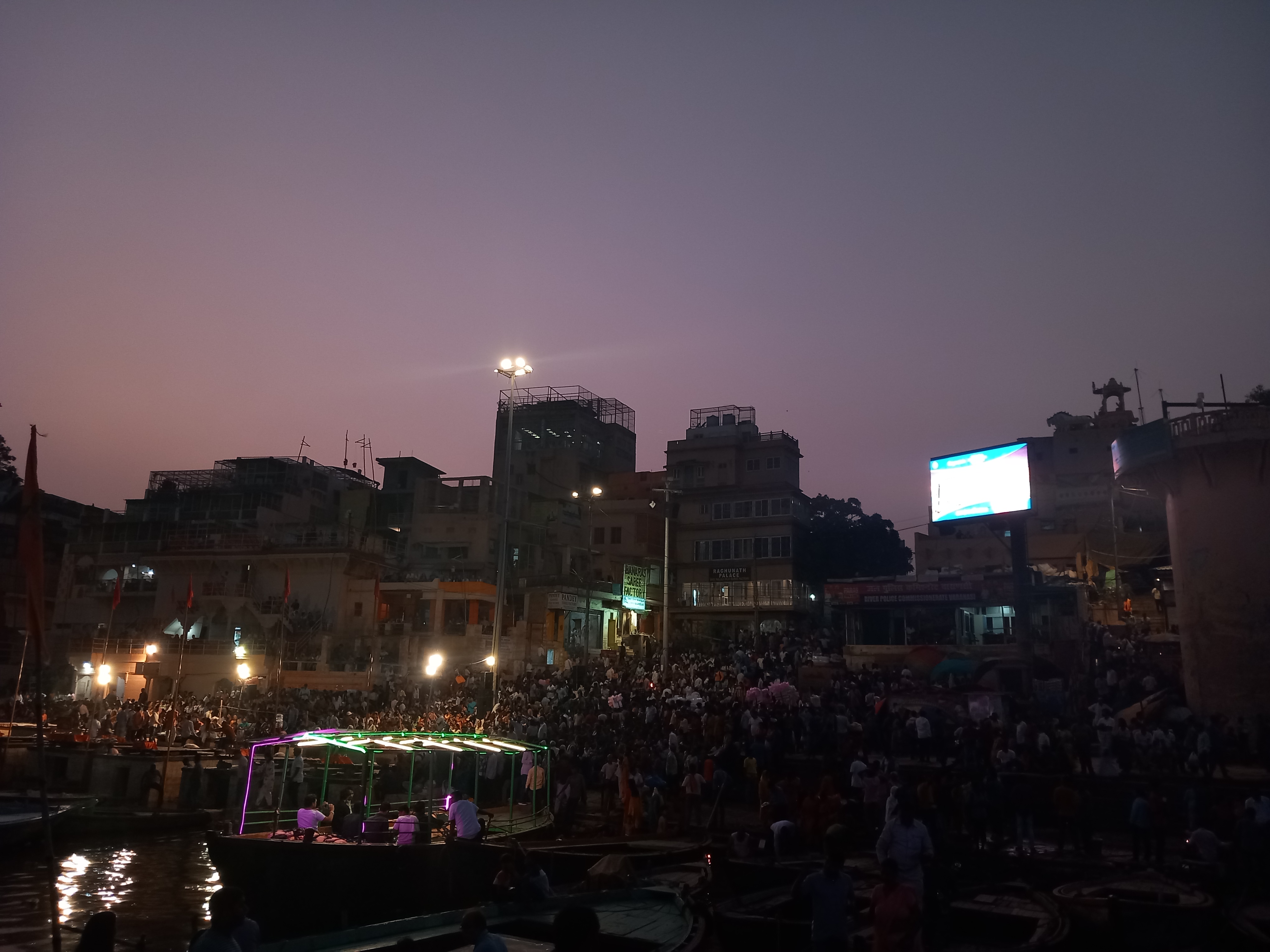 La « surprise » du soir consiste donc en une promenade en bateau (je rectifie : en barque à fond plat faisant apparaitre l’eau au travers des planches du fond) afin d’admirer les temples du rivage depuis le fleuve, et surtout (double surprise) de pouvoir aller se stationner en face d’un Ghât (escalier permettant d’accéder à l’eau) afin d’assister à la cérémonie religieuse de Ganga Aarti. Cette dernière a lieu tous les soirs et attire quasiment 10 000 fidèles différents à chaque fois, venus du pays entier : on ne peut pas dire, la ferveur est présente et le moment est fort, c’est à vivre ! Même si être 1h30 sur le toit d’un bateau n’est pas mon expérience préférée du séjour (ah oui, et on a changé de bateau en cours de route en passant de l’un à l’autre pour « mieux voir », aussi), ça valait franchement le coup, d’autant plus que des écrans géants retransmettent les détails de la cérémonie aux personnes les plus éloignées, permettant de retrouver le prêtre dans la foule et d’observer les étapes de la cérémonie.