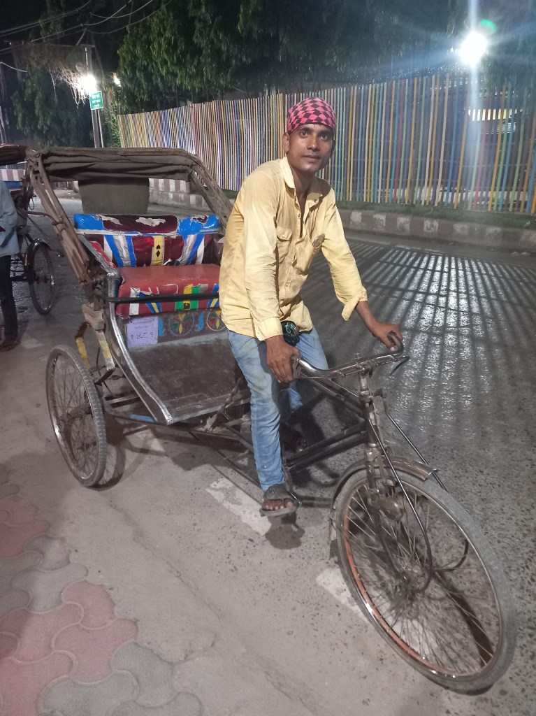 Et là, c’est le drame. Pas pour nous, mais pour les pauvres cyclistes conducteurs de Rickshaw censés véhiculer les locaux au sein d’un quartier défini, et qui ont du pédaler plus de 5 km en pente à travers des routes ouvertes à la circulation des véhicules pour ramener 12 touristes à leur hôtel. Notre chauffeur était jeune et pourtant bien essoufflé, celui d’un autre binôme s’est carrément perdu, n’arrivant pas à suivre la cadence (Maman, tu en as eu des aventures durant ce séjour !)… Même si la course était conséquente et a dû leur assurer un revenu correct, nous avons vraiment ressenti un sentiment de honte à la fin de ce parcours, durant lequel nous avons au moins pu un peu discuter avec notre chauffeur qui nous montrait des photos de sa femme et de ses enfants à chaque arrêt, en nous expliquant qu’il cumulait ce type d’emploi pour leur offrir une belle vie…