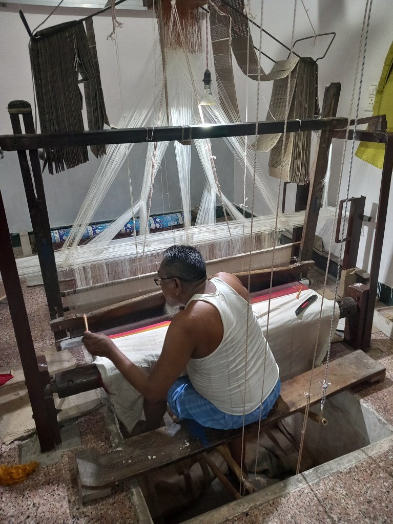 La journée se poursuit avec le retour à Varanasi dans le quartier de l’hôtel (nous reconnaissons les lieux visités en autonomie le matin-même) afin de visiter un atelier de tissage de sarees. Nous pouvons voir les artisans au travail sur des métiers à tisser Jacquard, et il nous est expliqué que des plages de 1h30 de concentration intense sur les fils sont entrecoupées de pauses obligatoires pour les yeux : on imagine au regard de la finesse de l’ouvrage. Et évidemment, nous sommes conduits à la boutique pour les petits achats commissionnés, mais qui ne rencontrent aucun succès chez personne du groupe car il est quasiment 16h et l’absence de repas de midi se fait sentir chez ceux qui se sont levés il y a déjà plus de 12h maintenant…